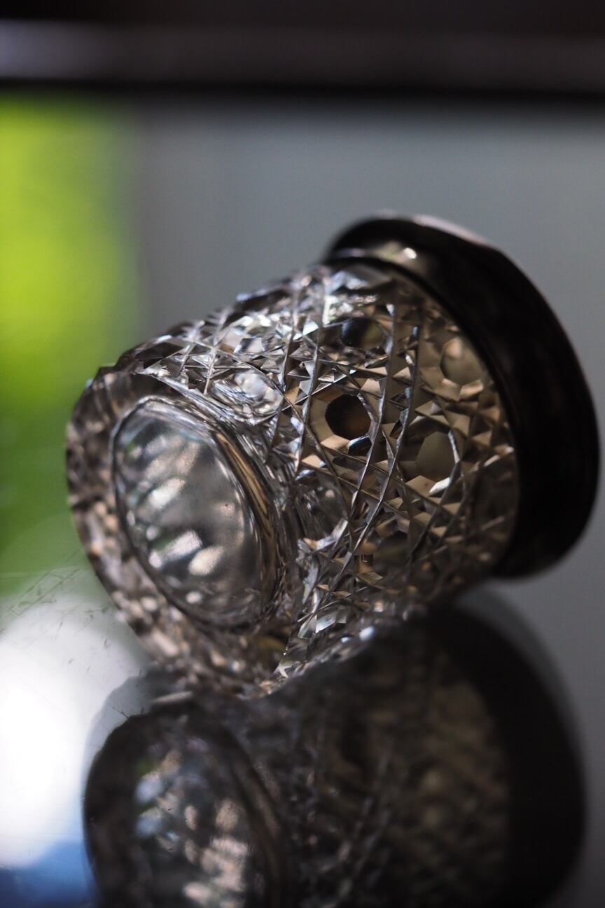 幾何学文様にカットされたガラス容器は小さく真っ直ぐなフォルムで品良くおさまっている。
