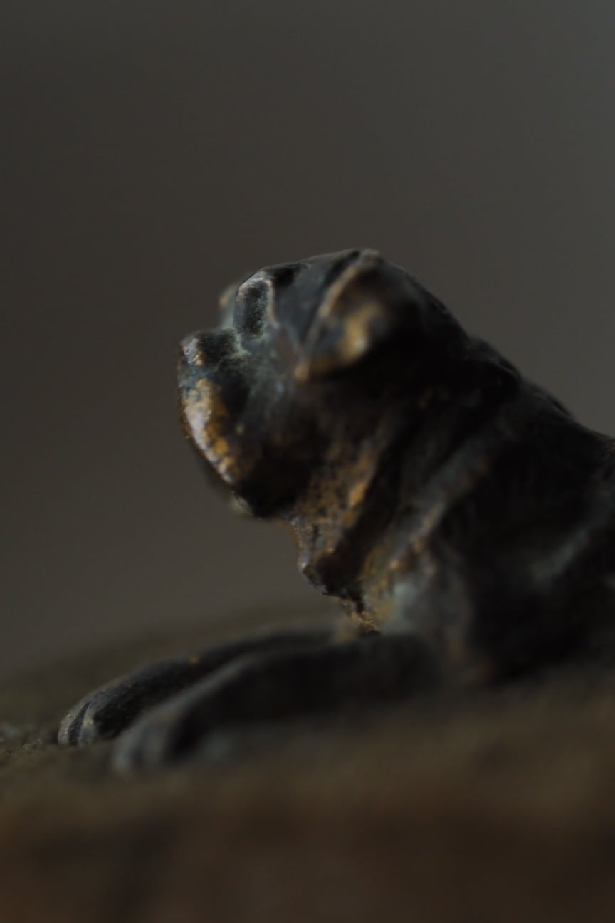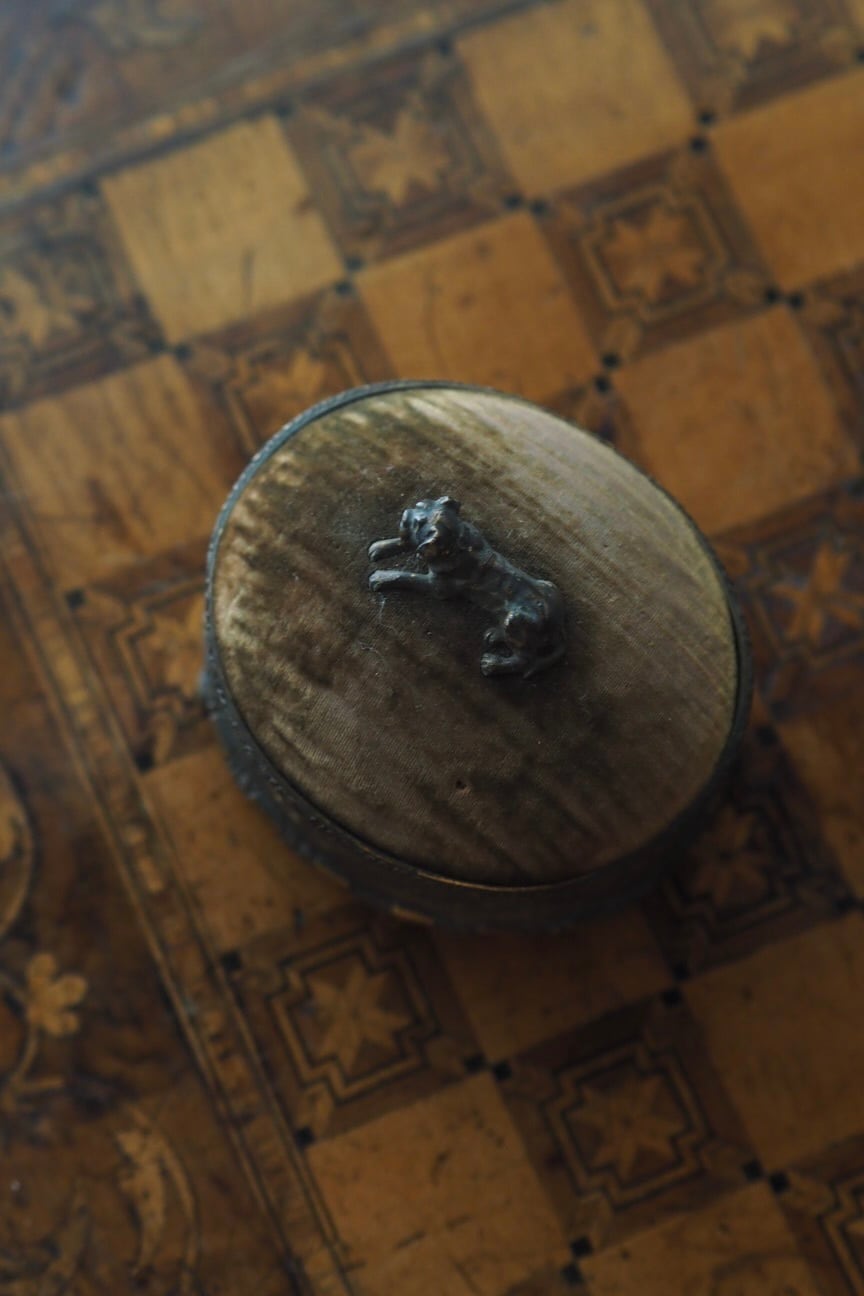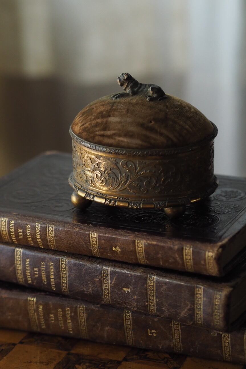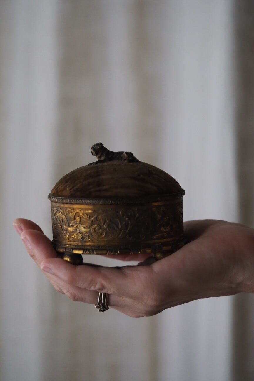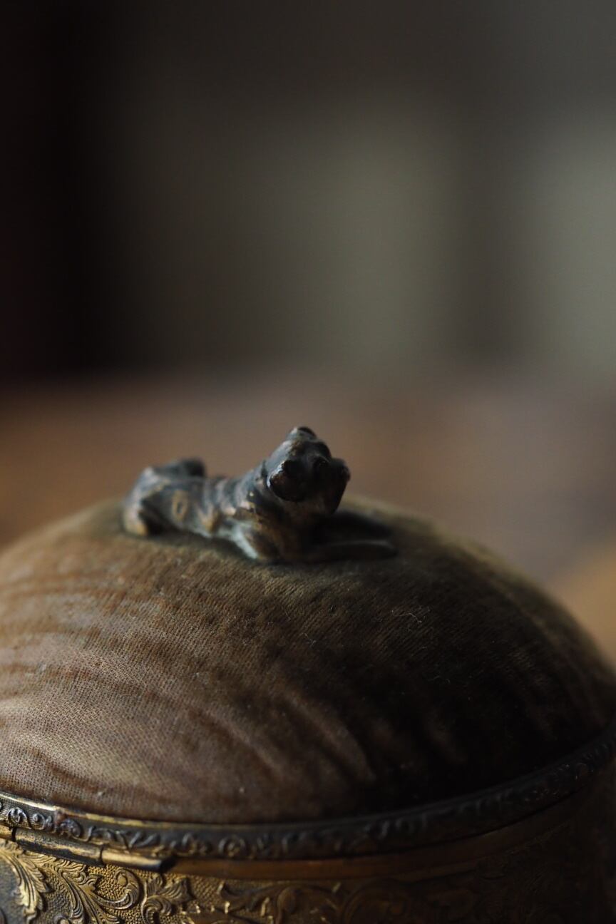 鋸葉の唐草絡むエレガントなオルモルの装飾があしらわれた容器にラスティックな風合いの別珍生地クッション、、の上にわんちゃんの意外性。