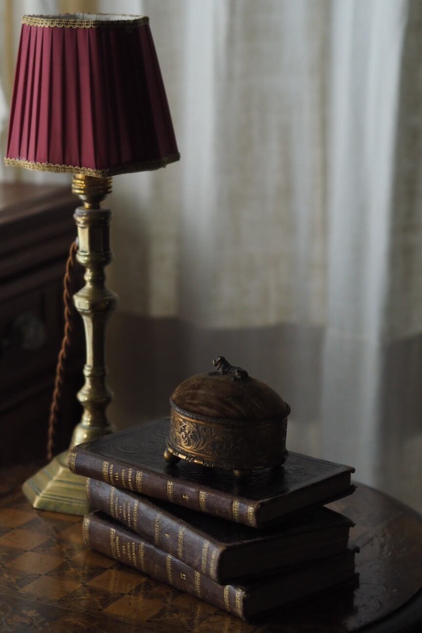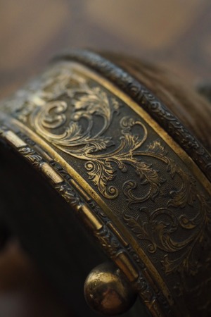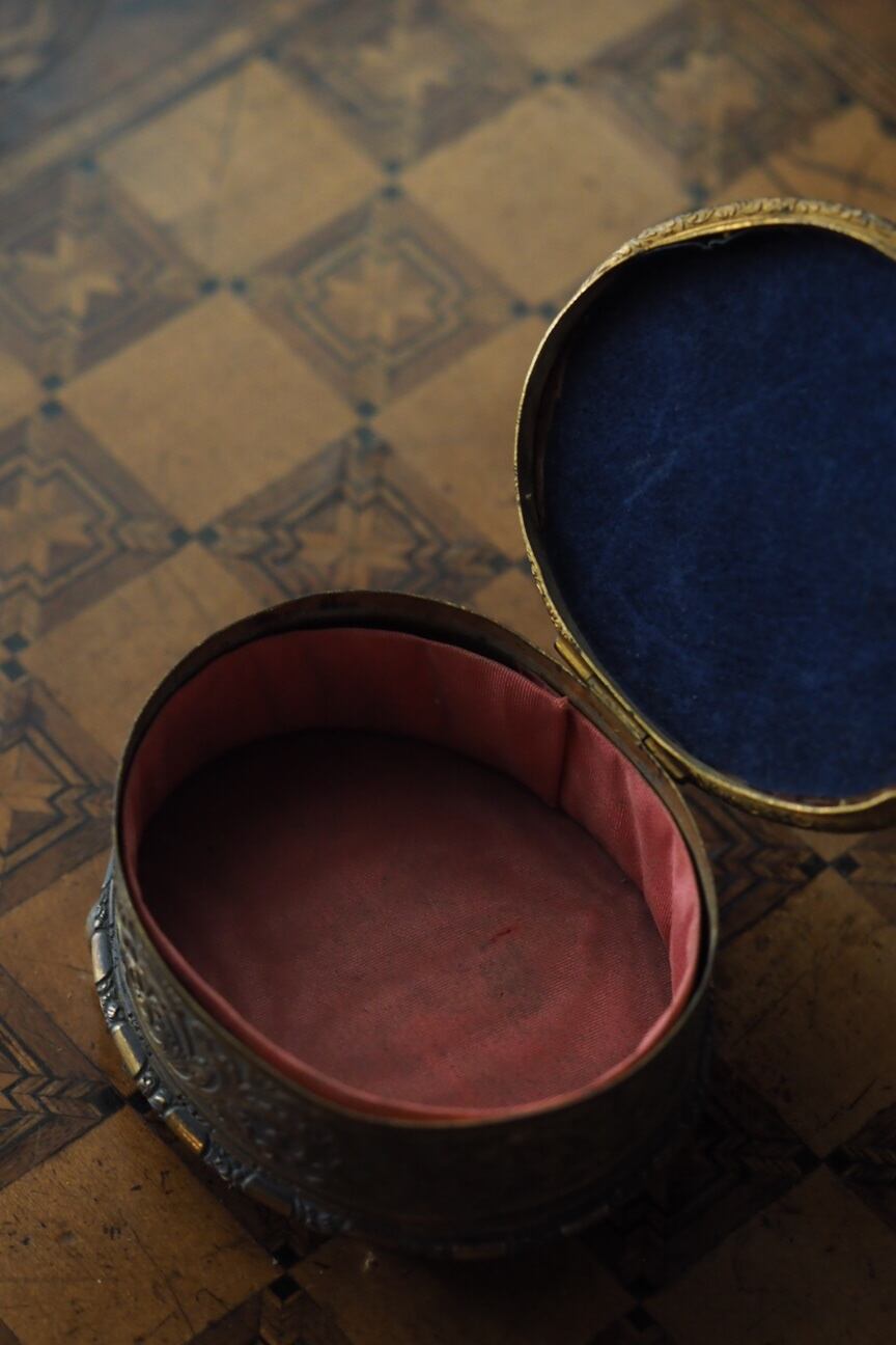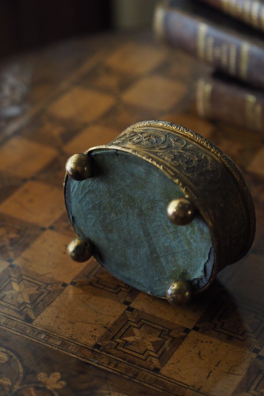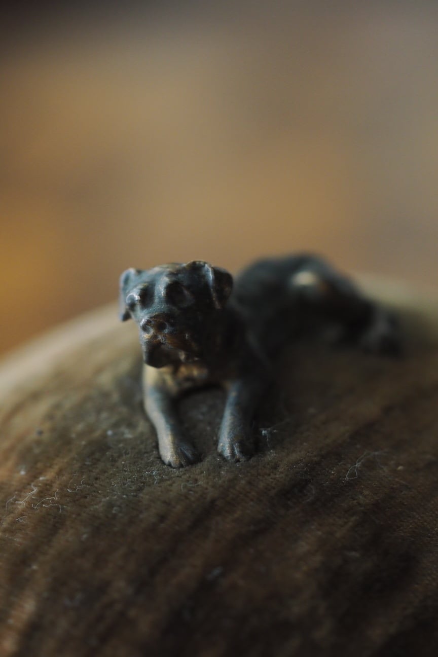 鋸葉の唐草絡むエレガントなオルモルの装飾があしらわれた容器にラスティックな風合いの別珍生地クッション、、の上にわんちゃんの意外性。