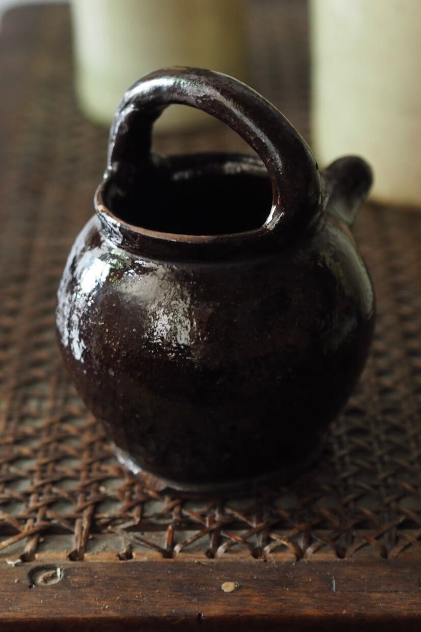 丸いフォルムに実用的な持ち手、愛嬌ある注ぎ口が付いていて綺麗に使われてきた様で洗いましたがほぼ油気はなく渋い趣きはおそばの天つゆ入れにも使えそうな、さもなくば月並みですが野の花を生ける花器ですとか、蕎麦湯を入れるうつわですとか、お蕎麦がどうしても脳裏に浮かんでしまうのですが。