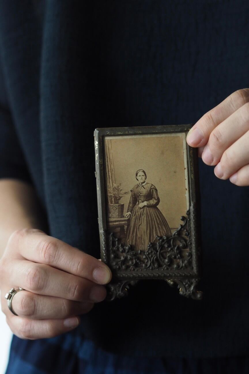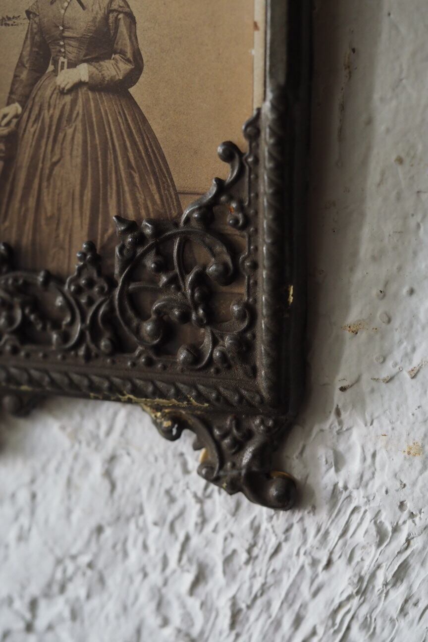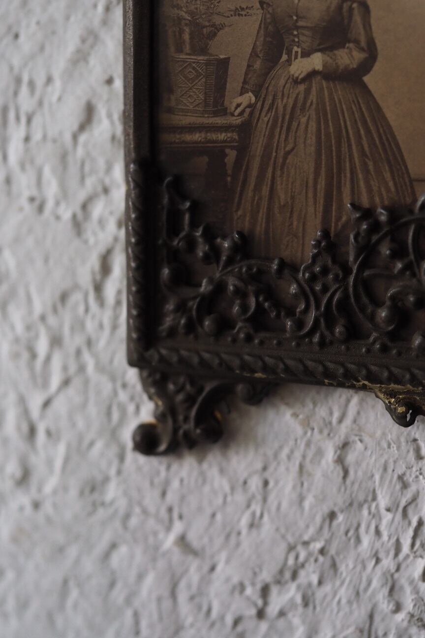 華麗な文様が左右アシンメトリーに枠と馴染んで写真を囲む小さな、元はスタンド型のフォトフレーム。ですので脚が付いていて壁掛けした際の様子、少し変わって見えるかもしれません。そこがユニークな点。