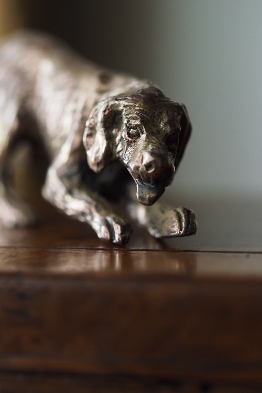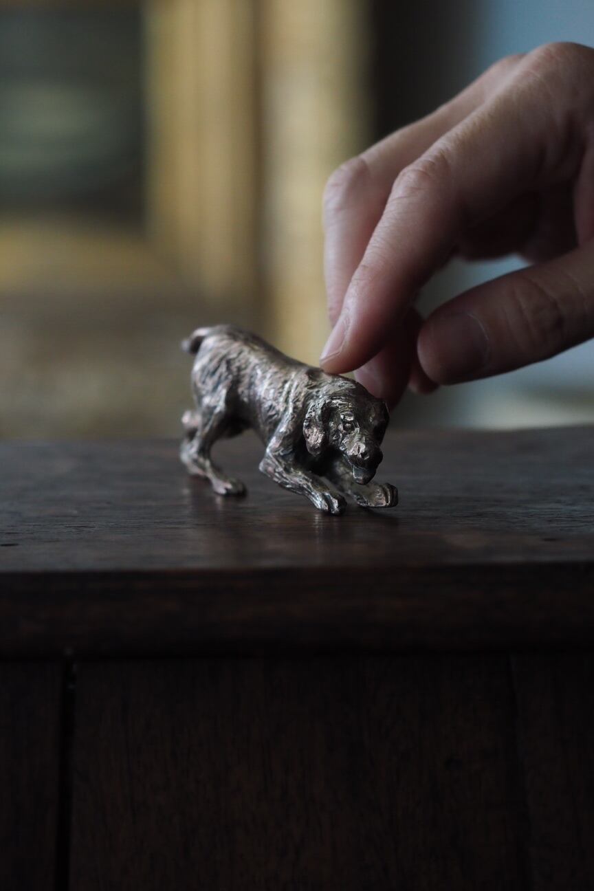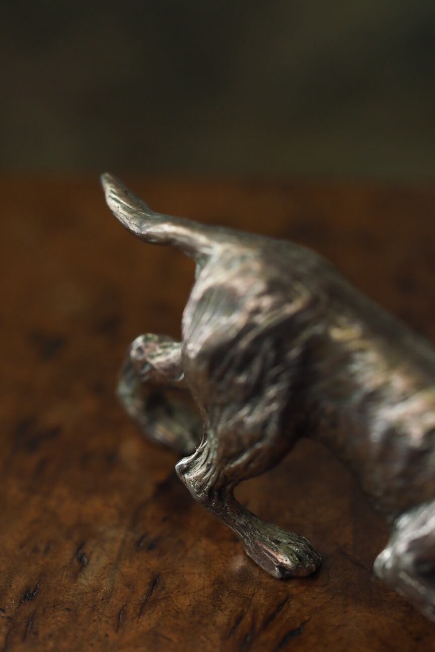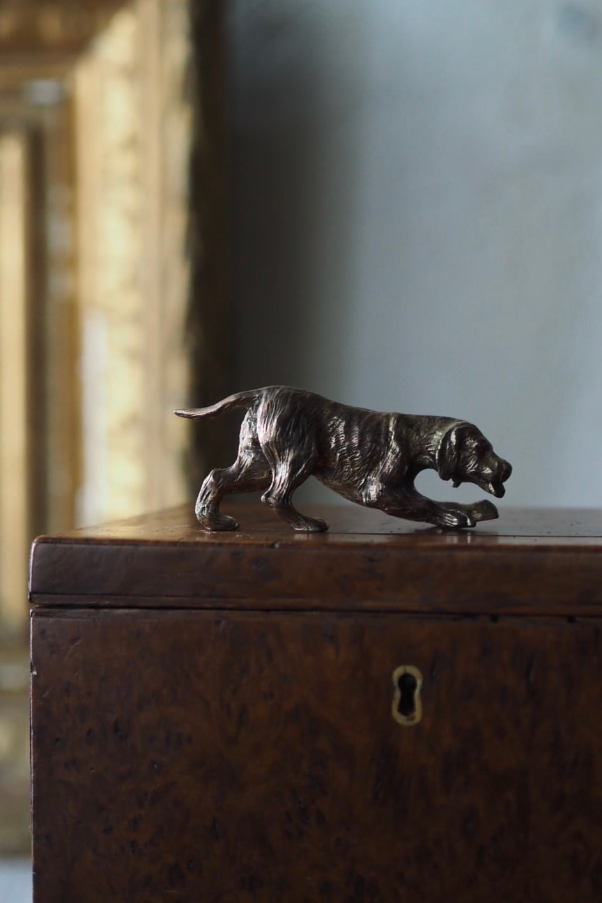 正に猟犬の、忠実で賢い性格が仕草に出ている犬のオブジェ。鋳物に銀メッキが施されている。