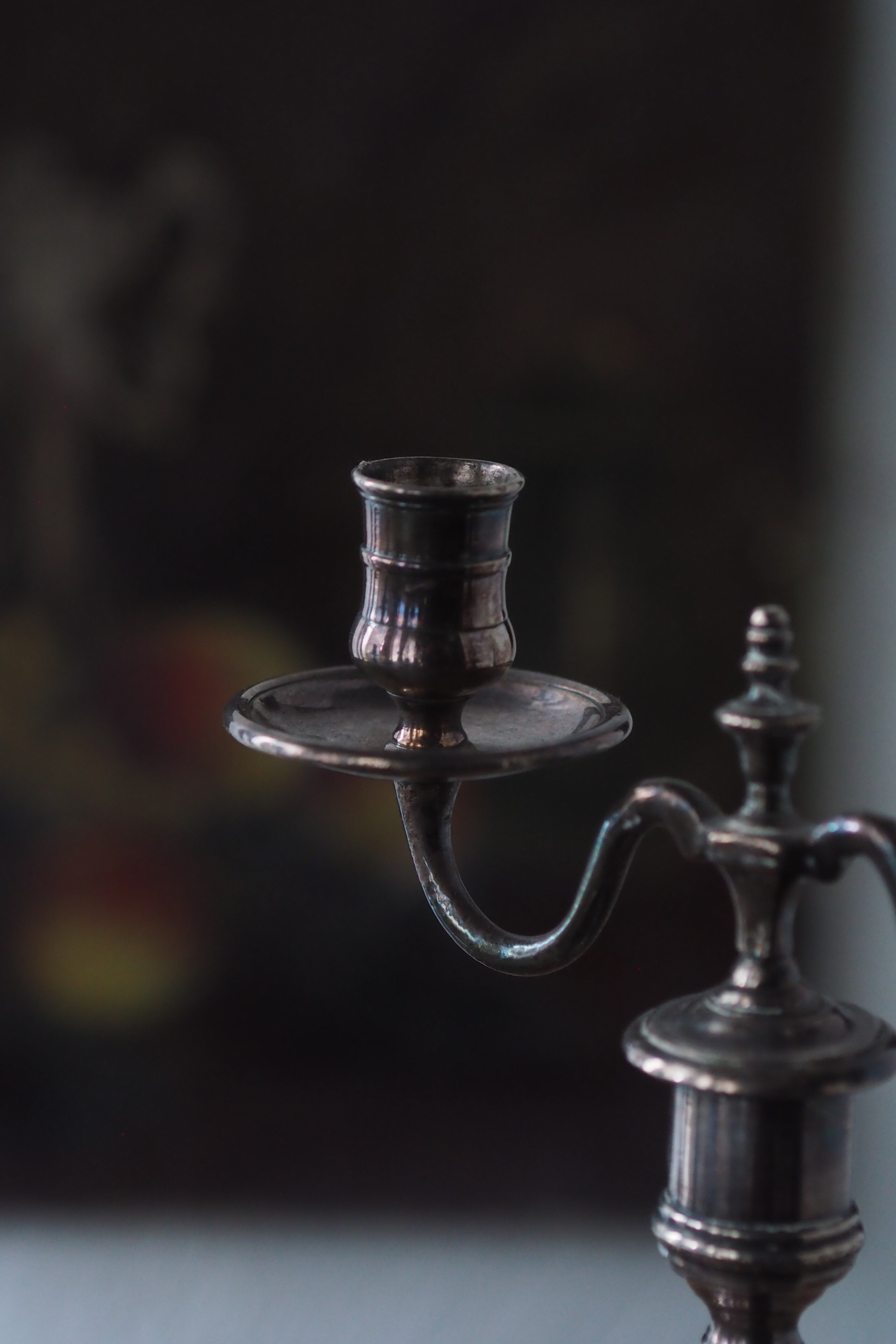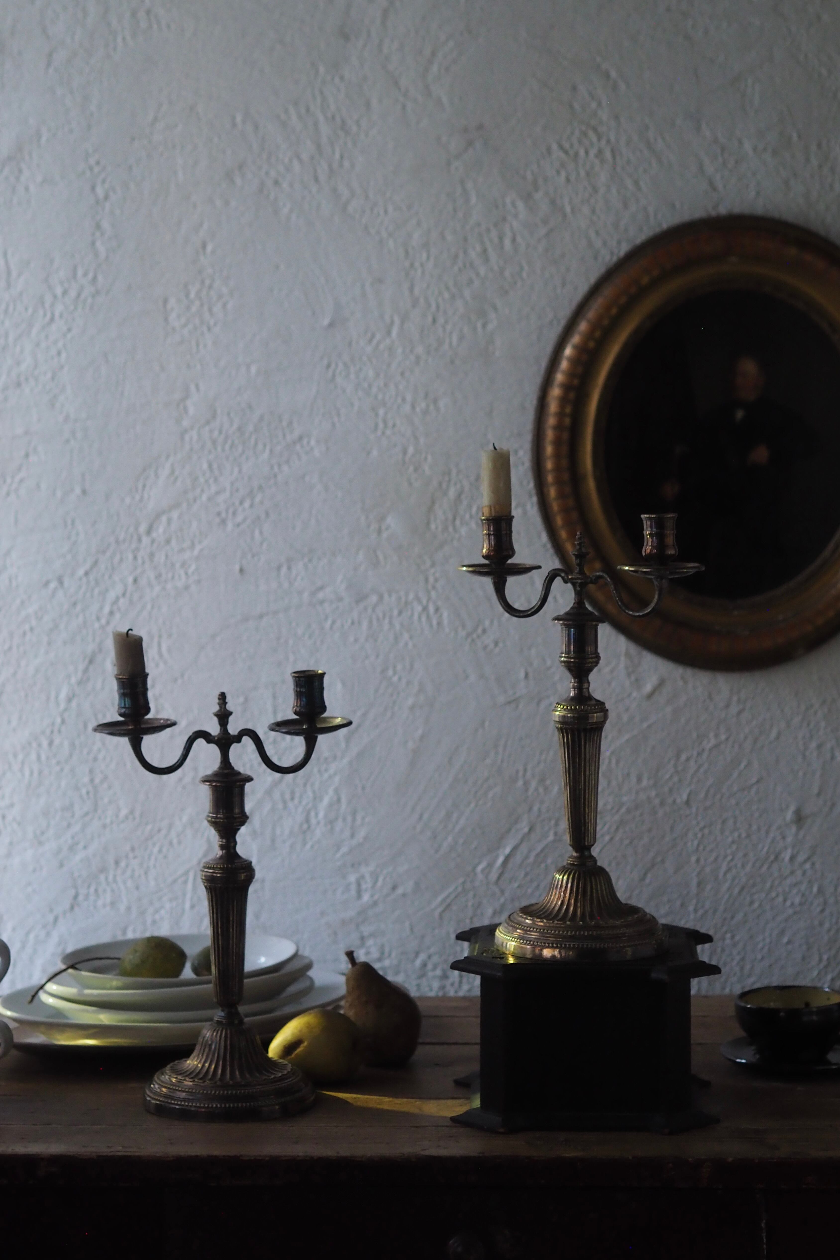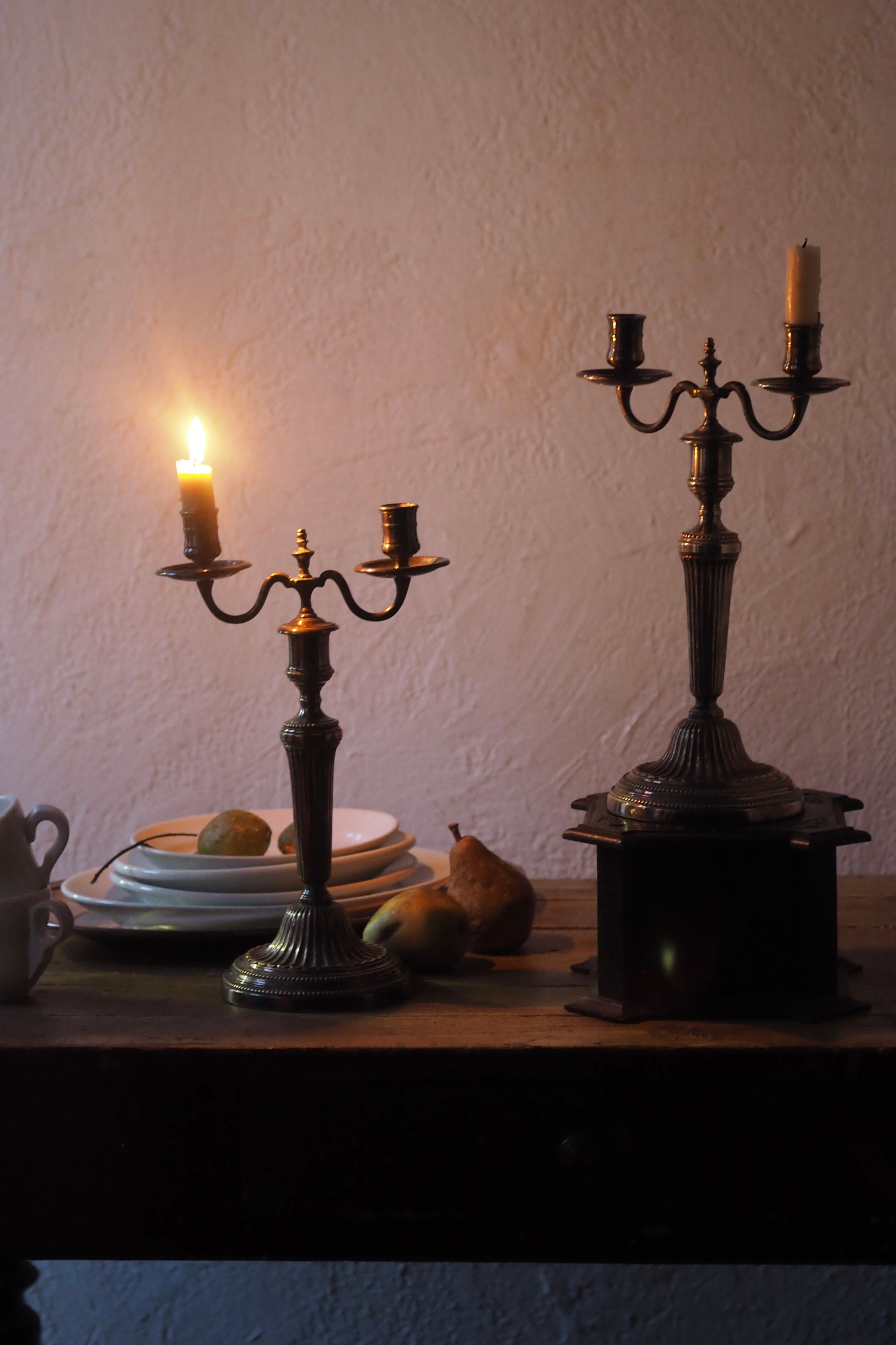 デカダンスな空気感漂うペア燭台、蝋燭を灯した様子も雰囲気増して絵になるもの。