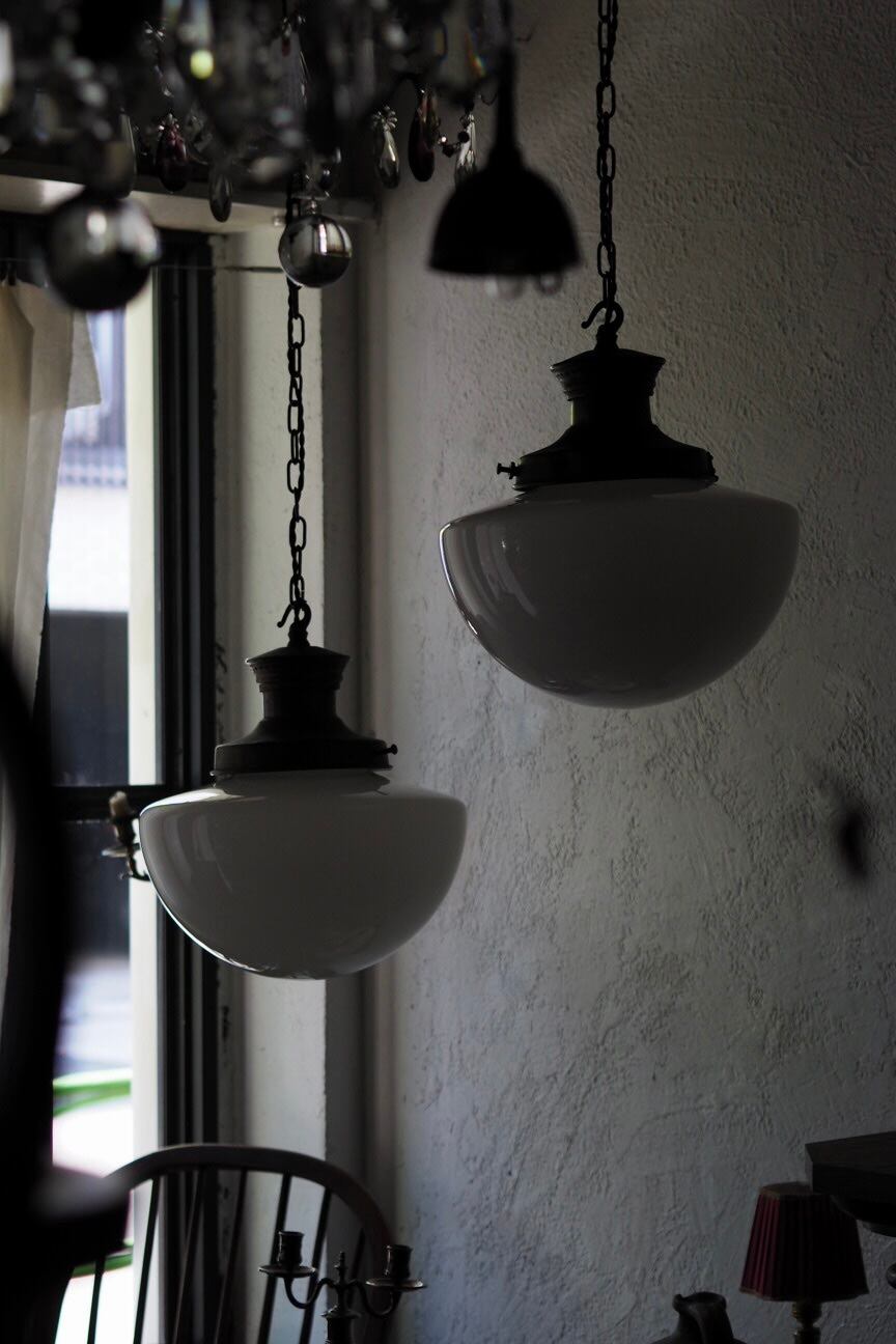 日本到着後照明業社さんに配線し直し頂き、フックを含むギャラリーまでは20世紀初頭のオリジナル、チェーンと真鍮のフランジは現行の品です。26口径普通電球を使用、これらの照明に電球は付属致しておりません。