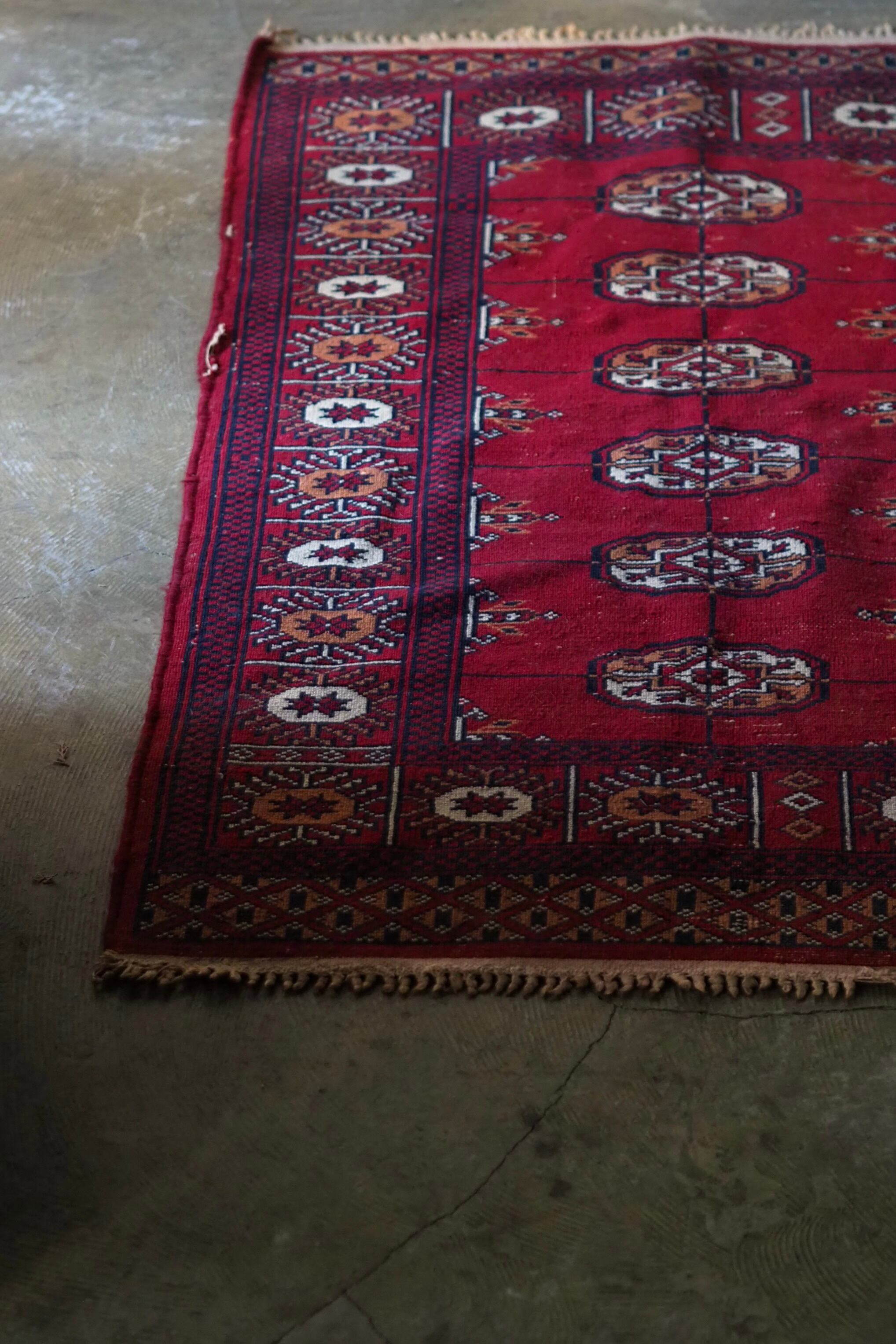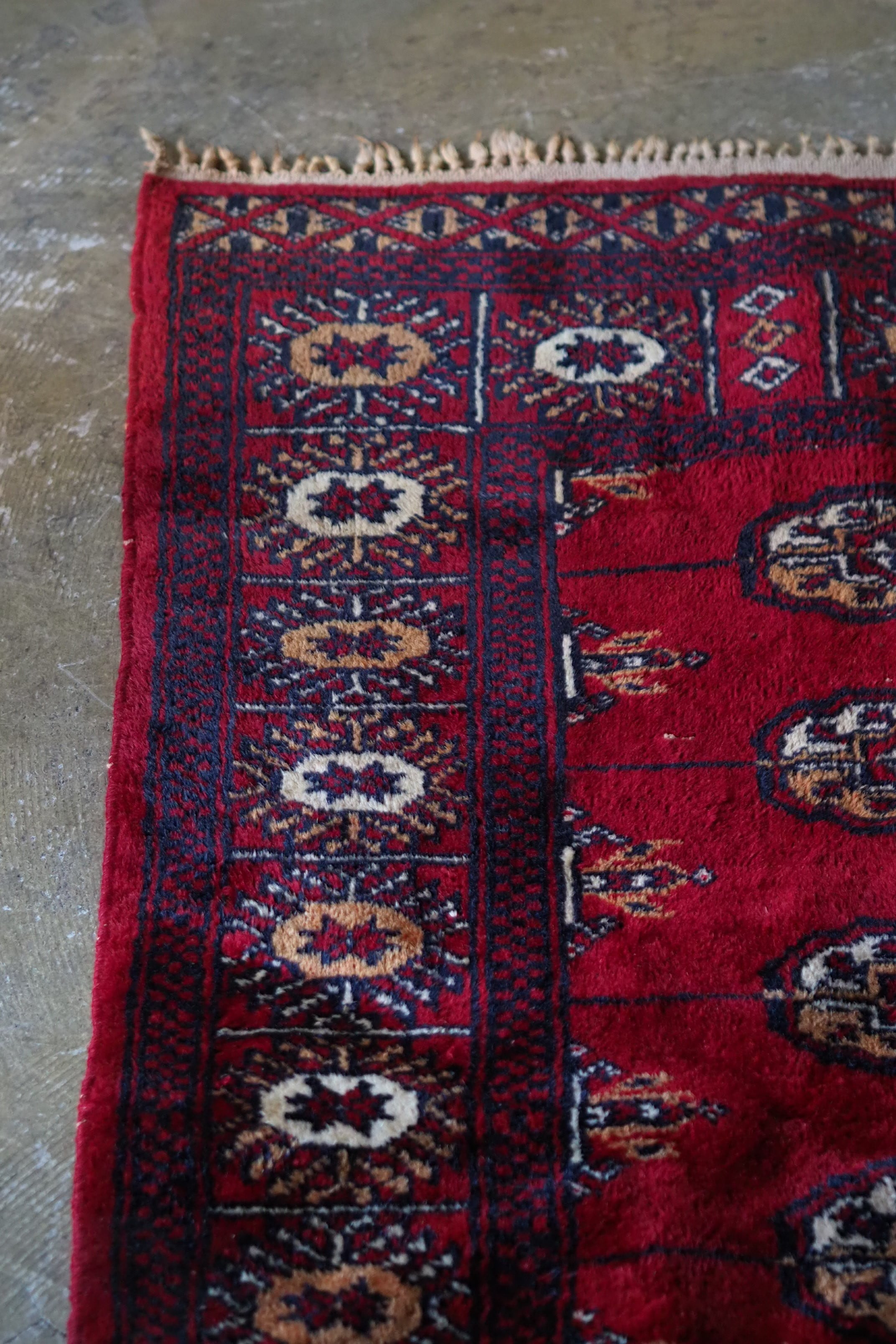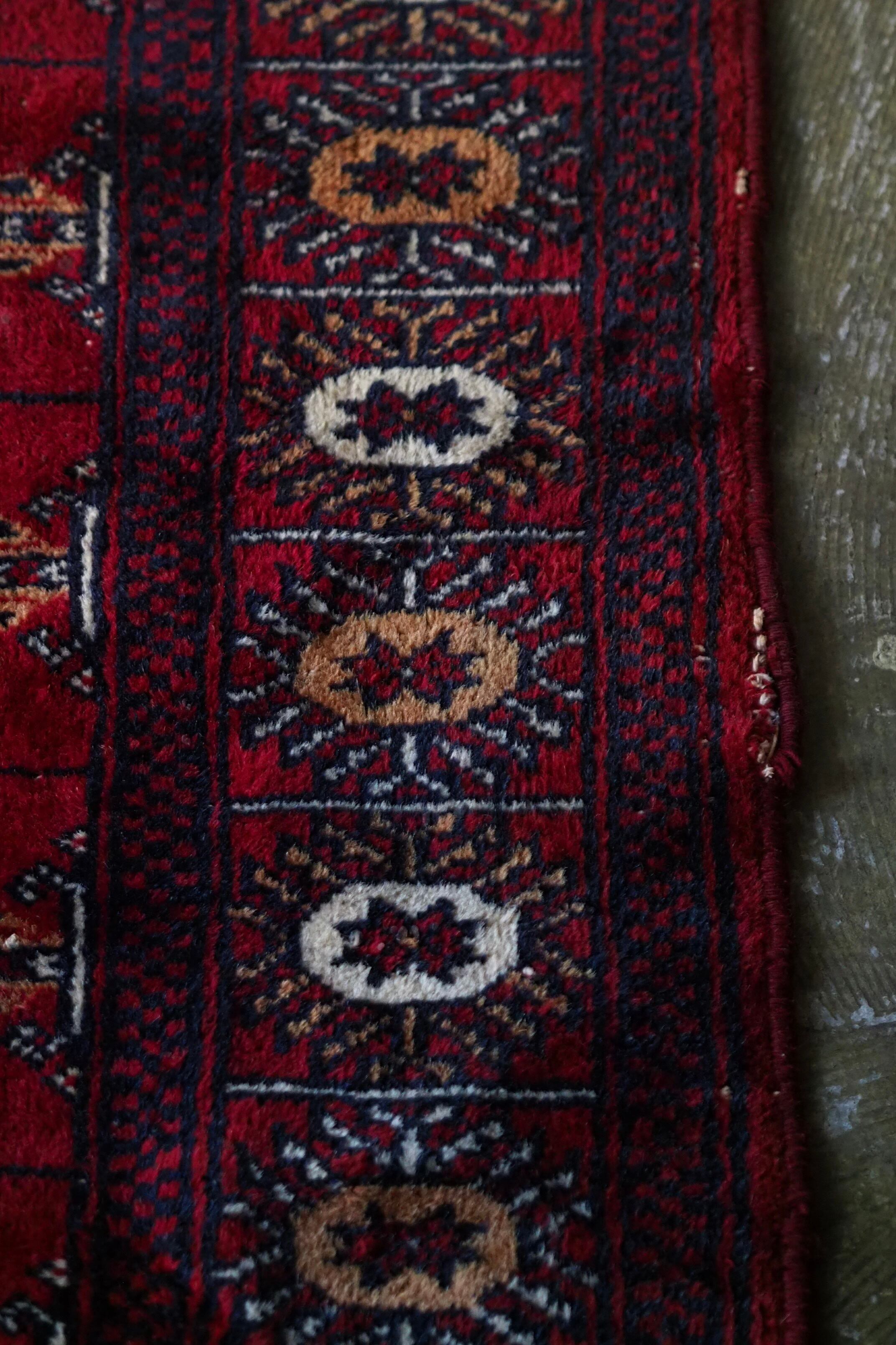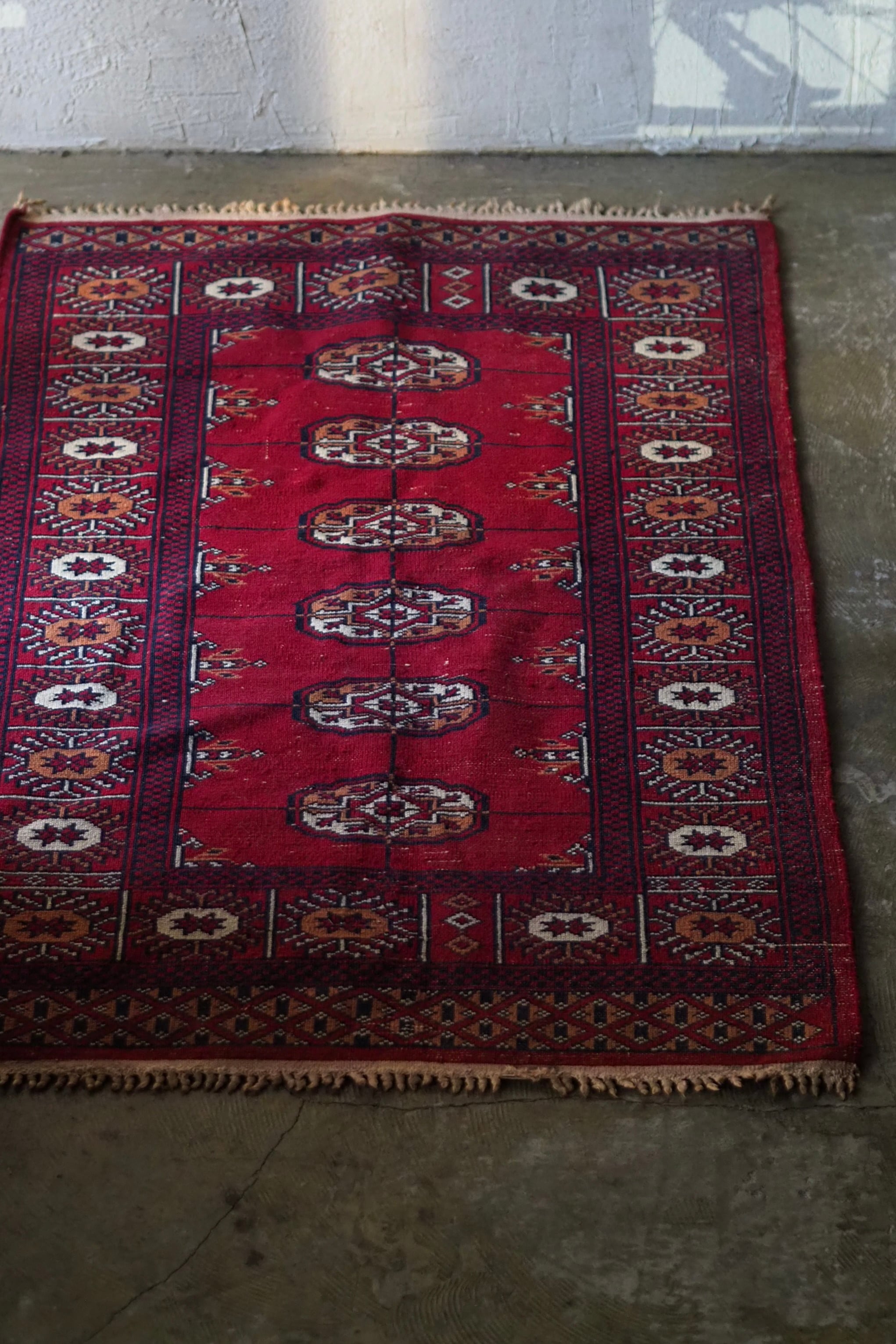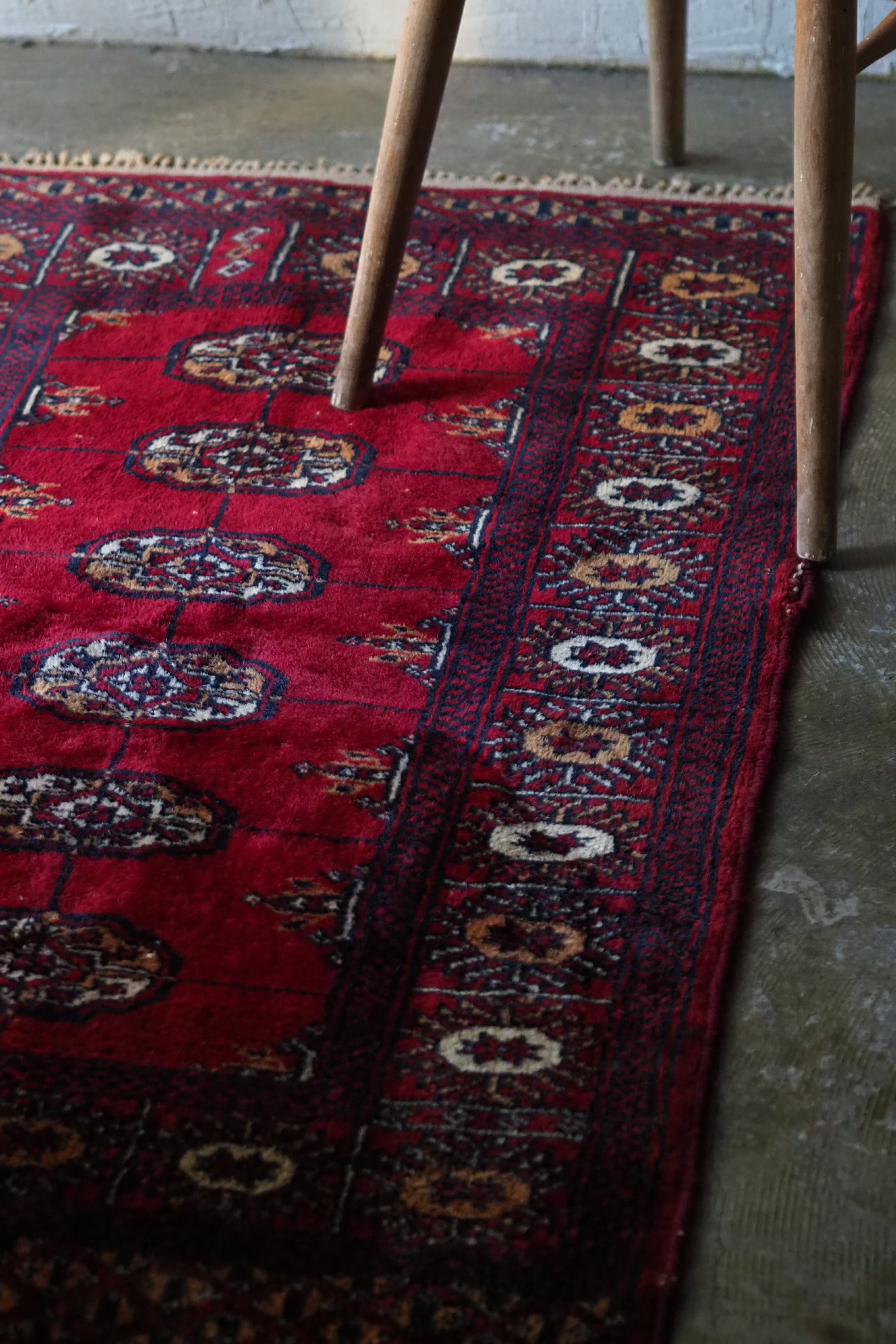 中央アジアトルクメン族独特のギュルと呼ばれる部族や家紋を表す文様が随所に織られている。