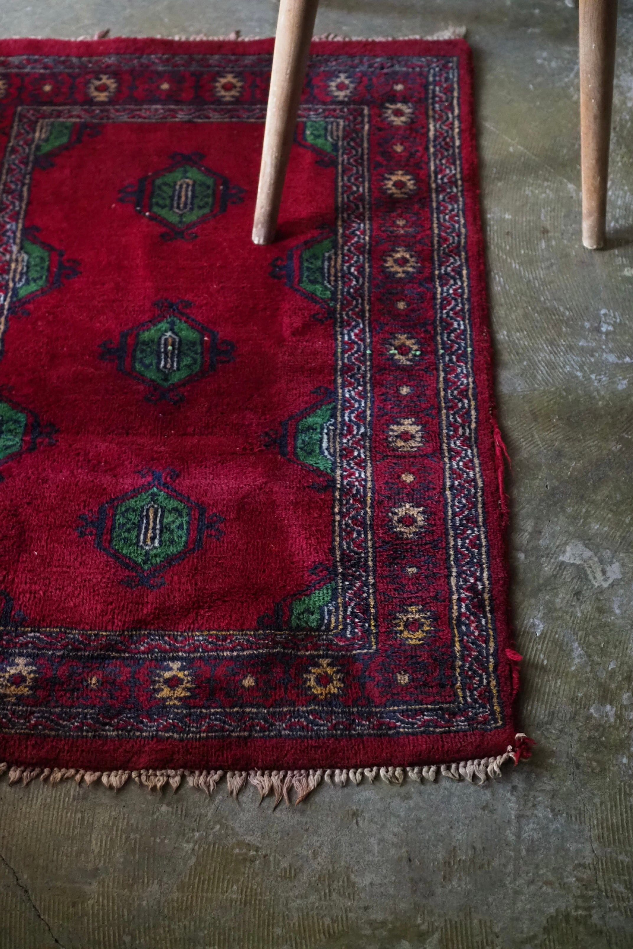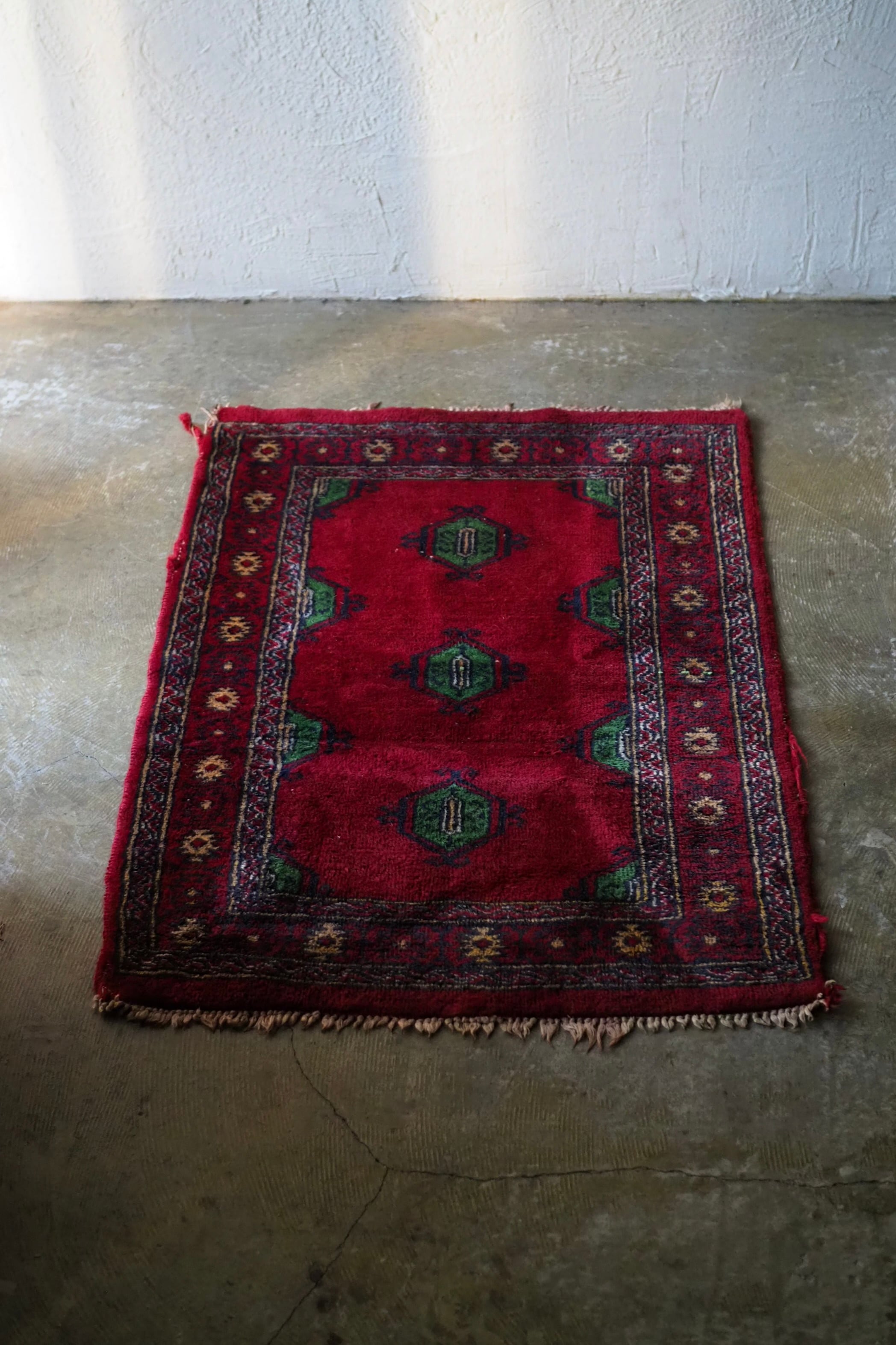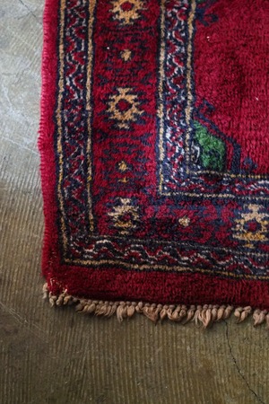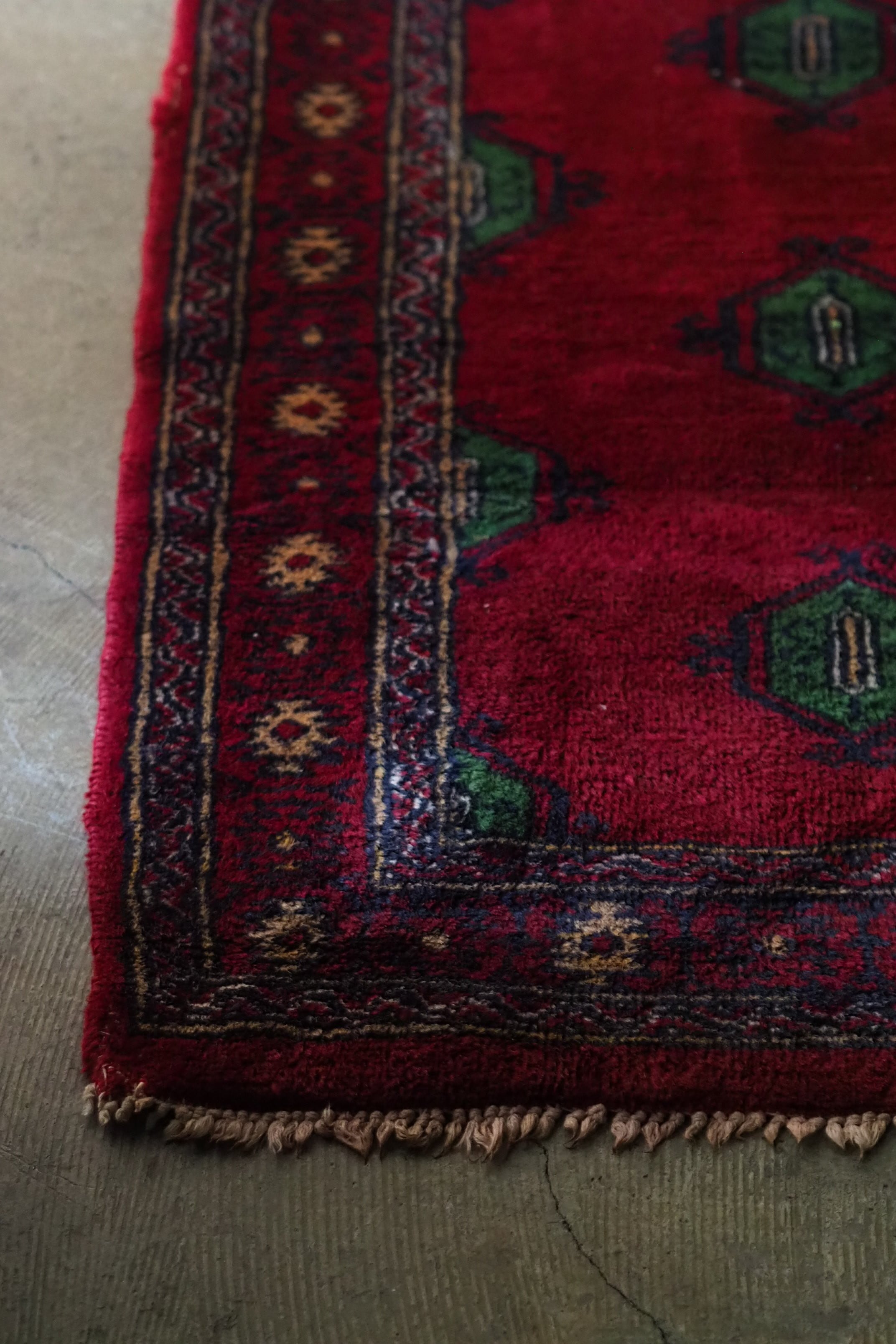 アフガンラグに見られる深い赤の印象に生成りの縁取り、珍しいグリーンと黄色が織り込まれてアクセントとなっている一枚。