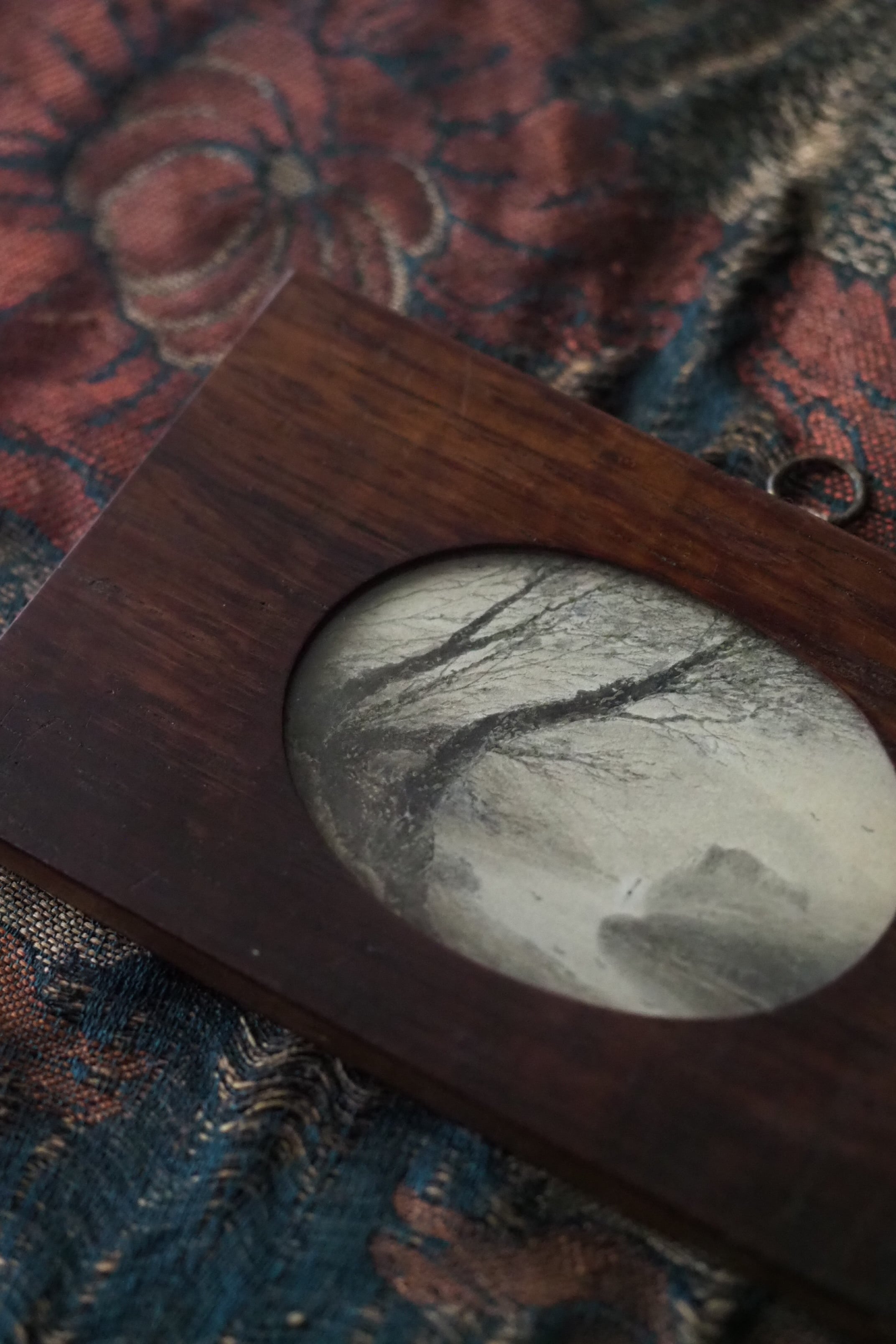 細いタッチの墨黒水彩で描かれておりとても静かな印象を受けるのはモチーフがダイナミックに左方から枝葉を伸ばす木、対岸、遠近法で遠目に薄く山は遥か向こうに。