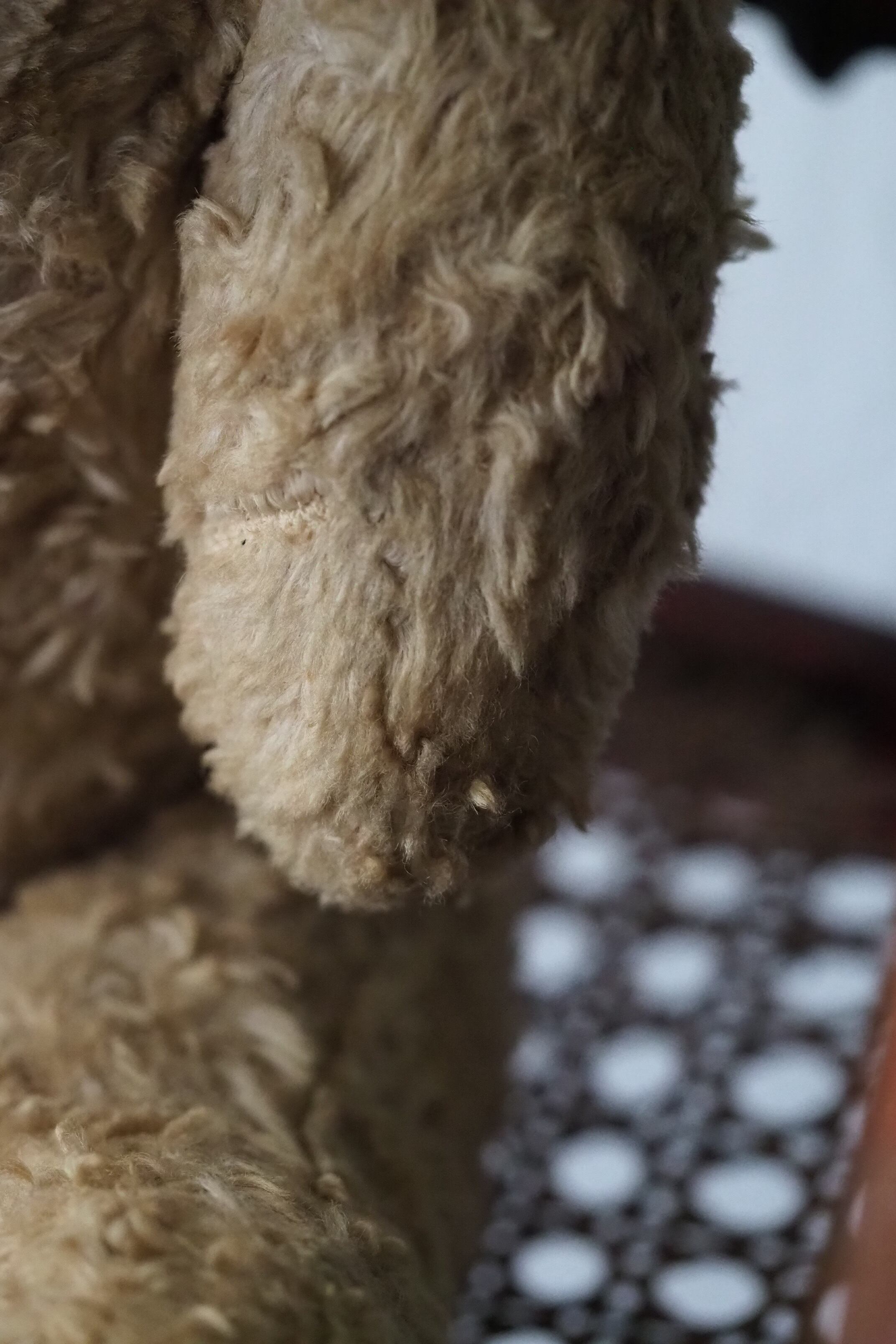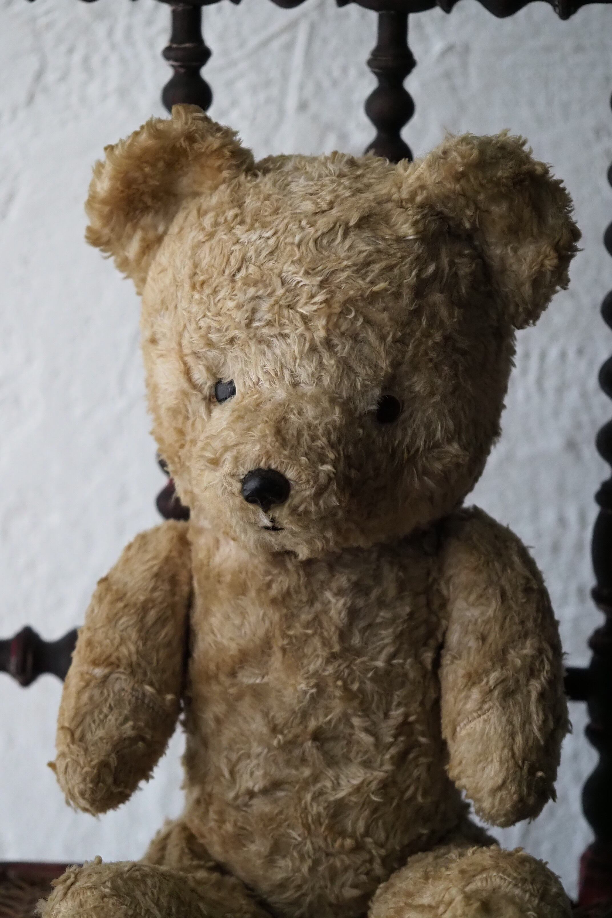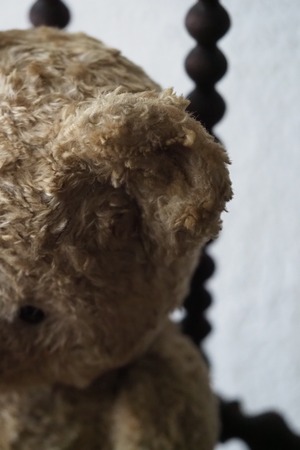 にっこり笑ってこちらを見つめるエクリュ色のテディベア。