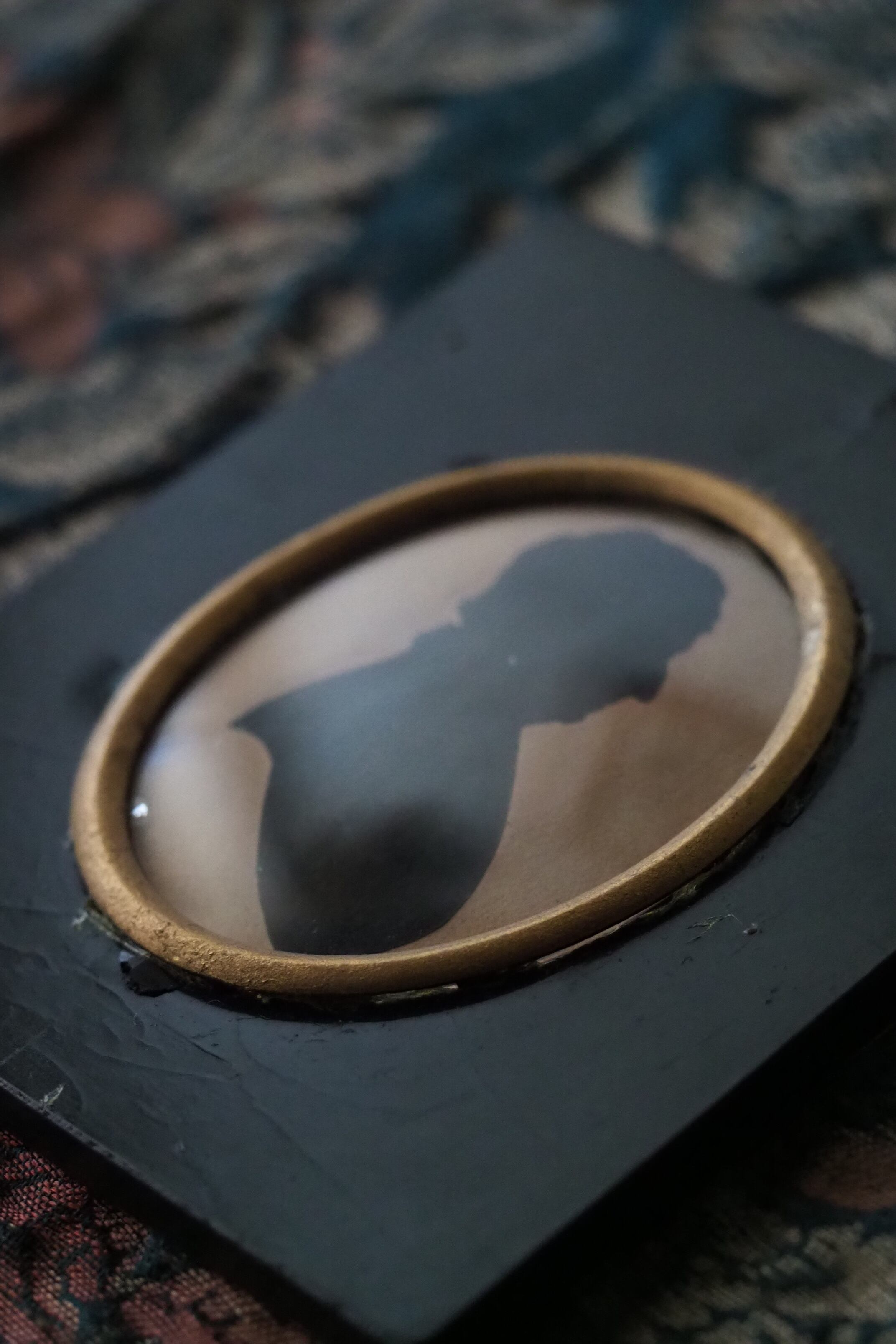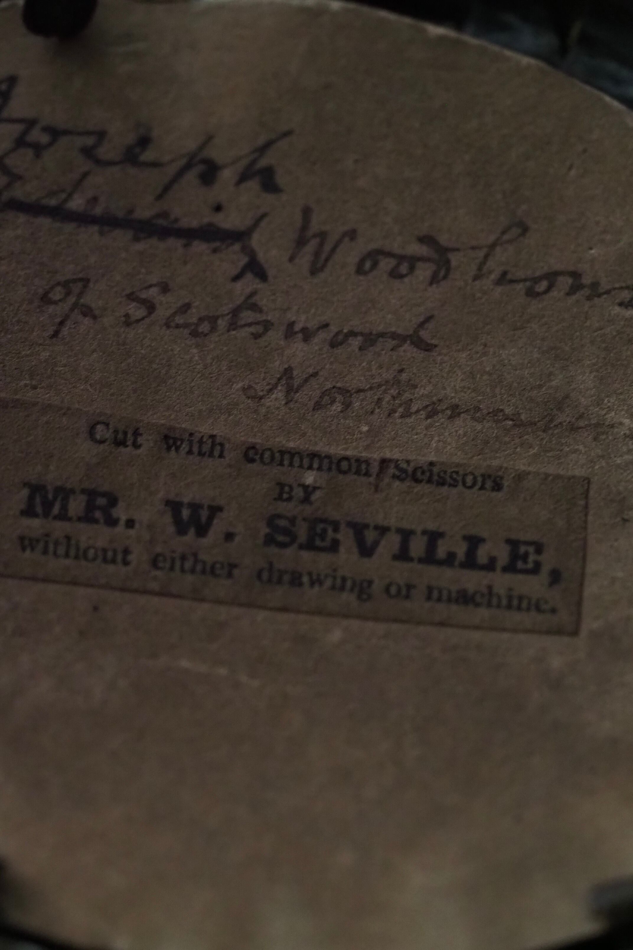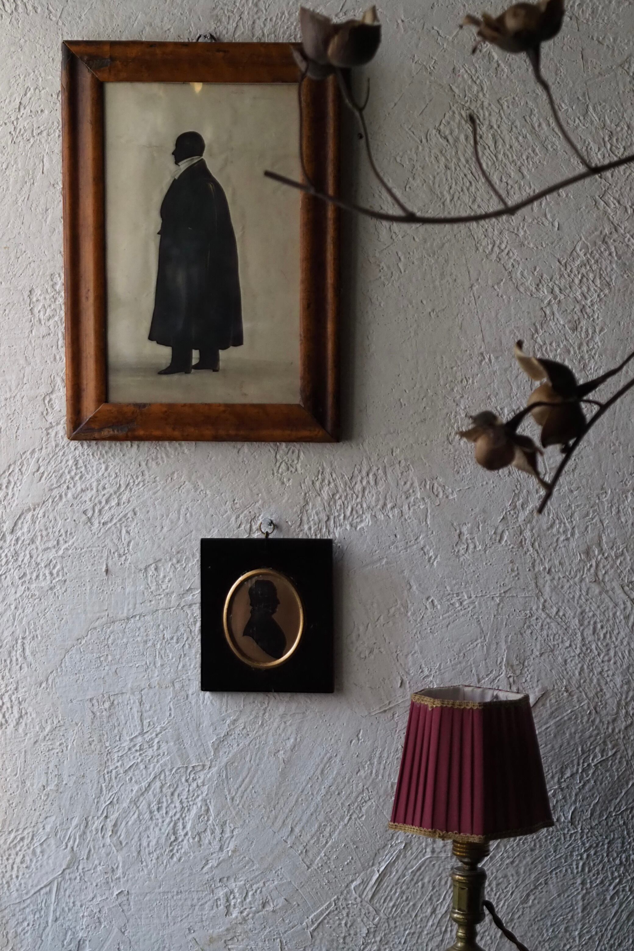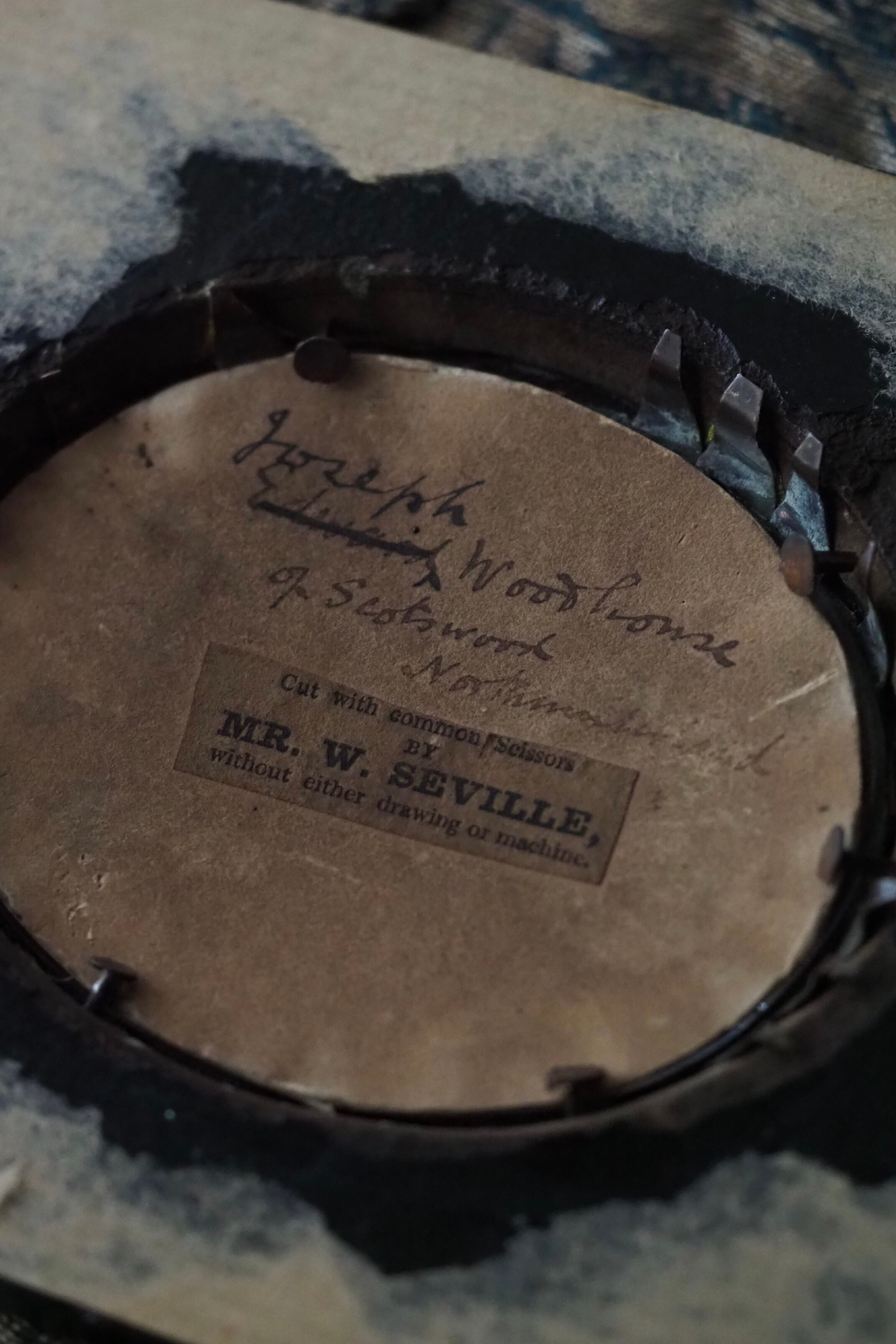 19世紀イギリス ニューカッスルのジョセフさんなる男性の横向き、虫眼鏡で覗くと影があるので絵ではなく切り取ってあるシルエット、まつ毛のみ鉛筆でさっと一筆伸びている。