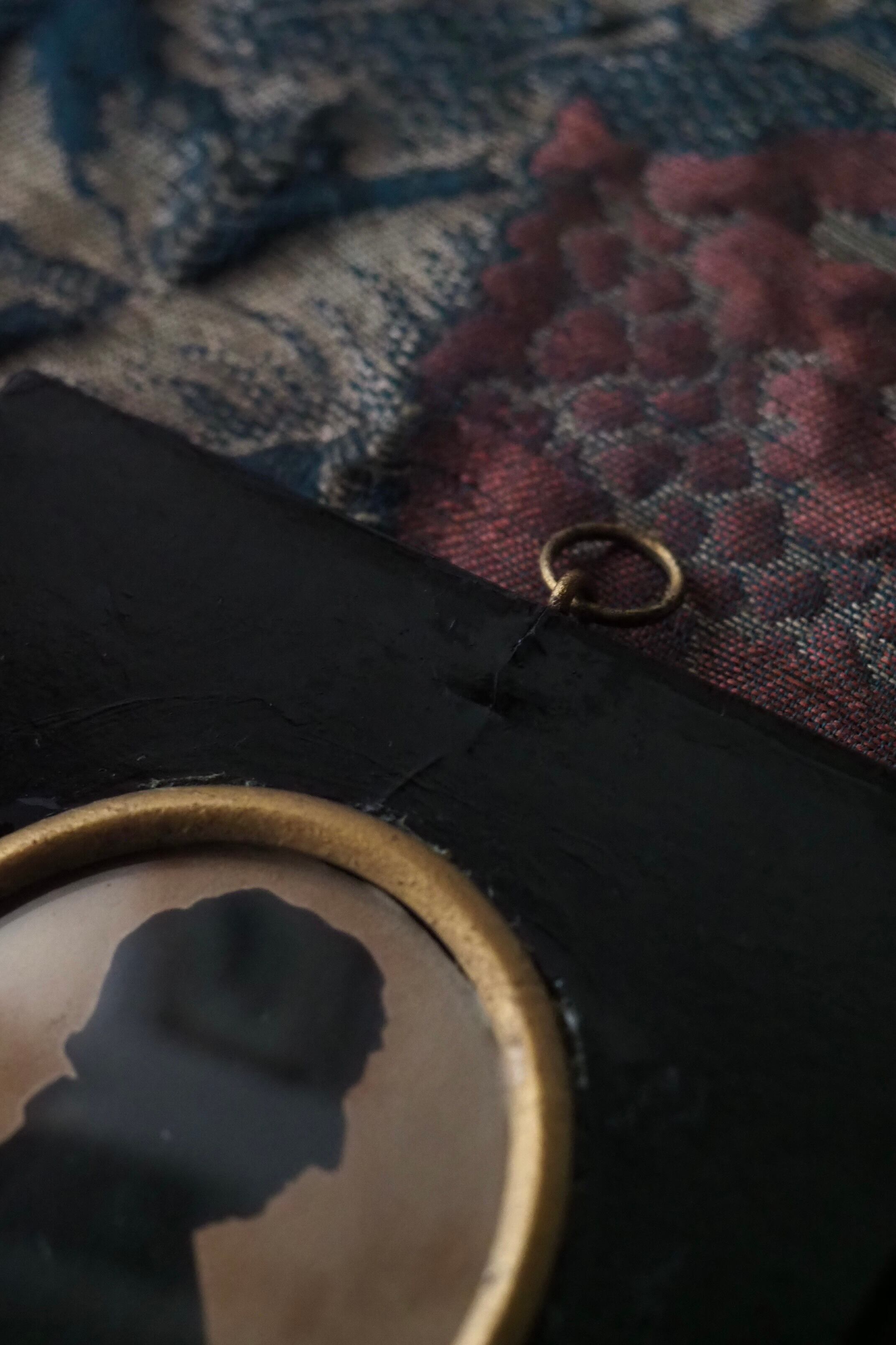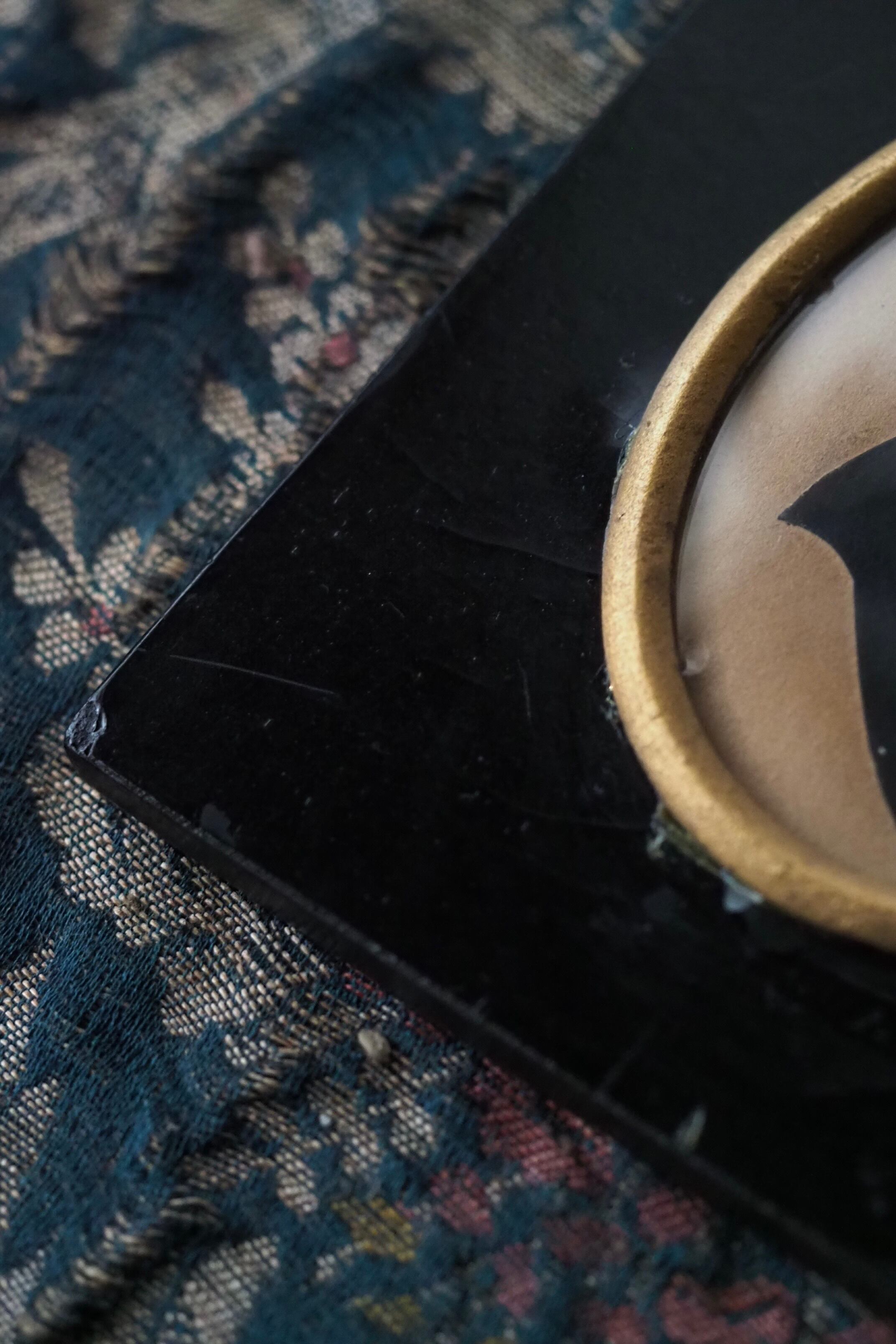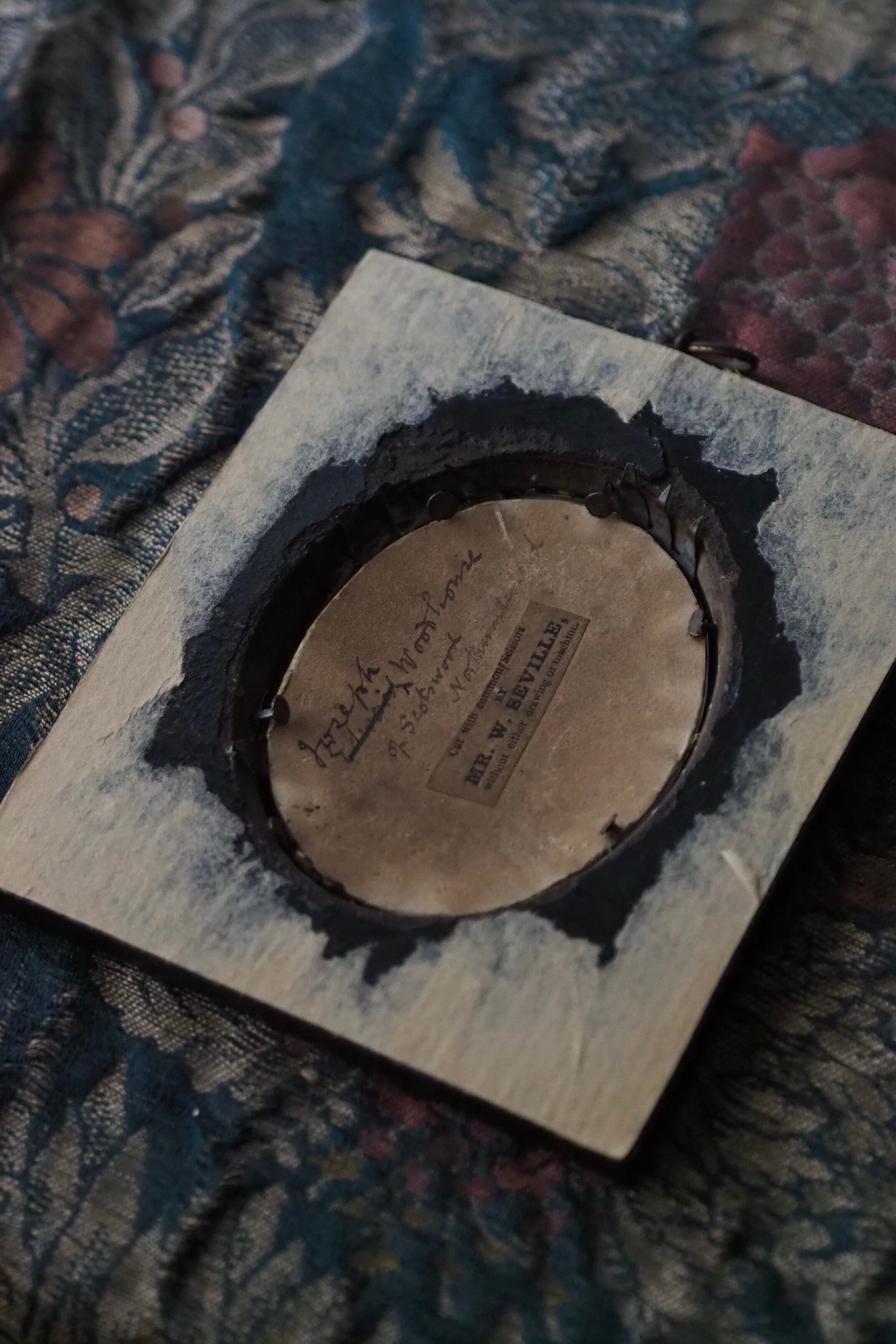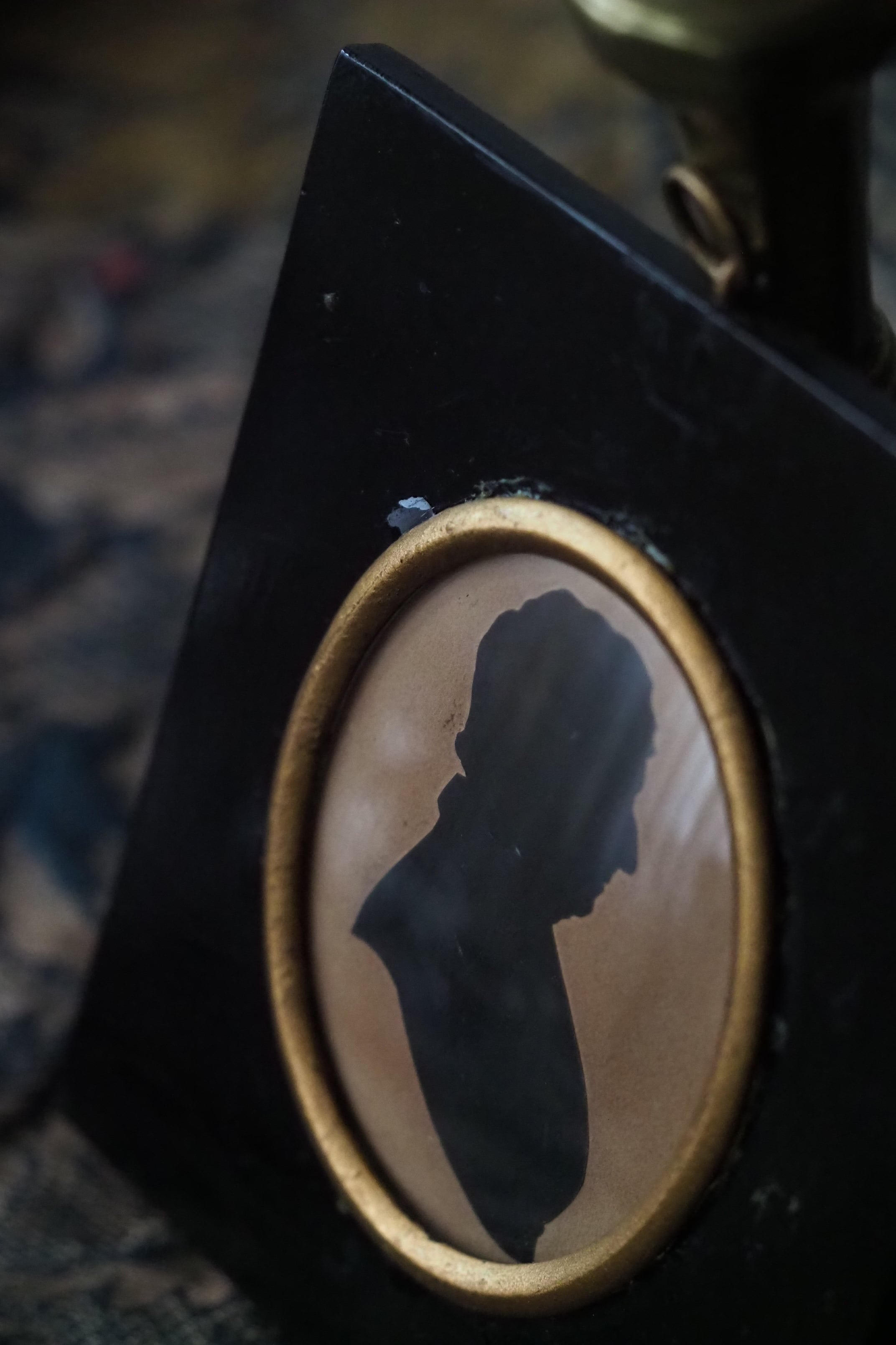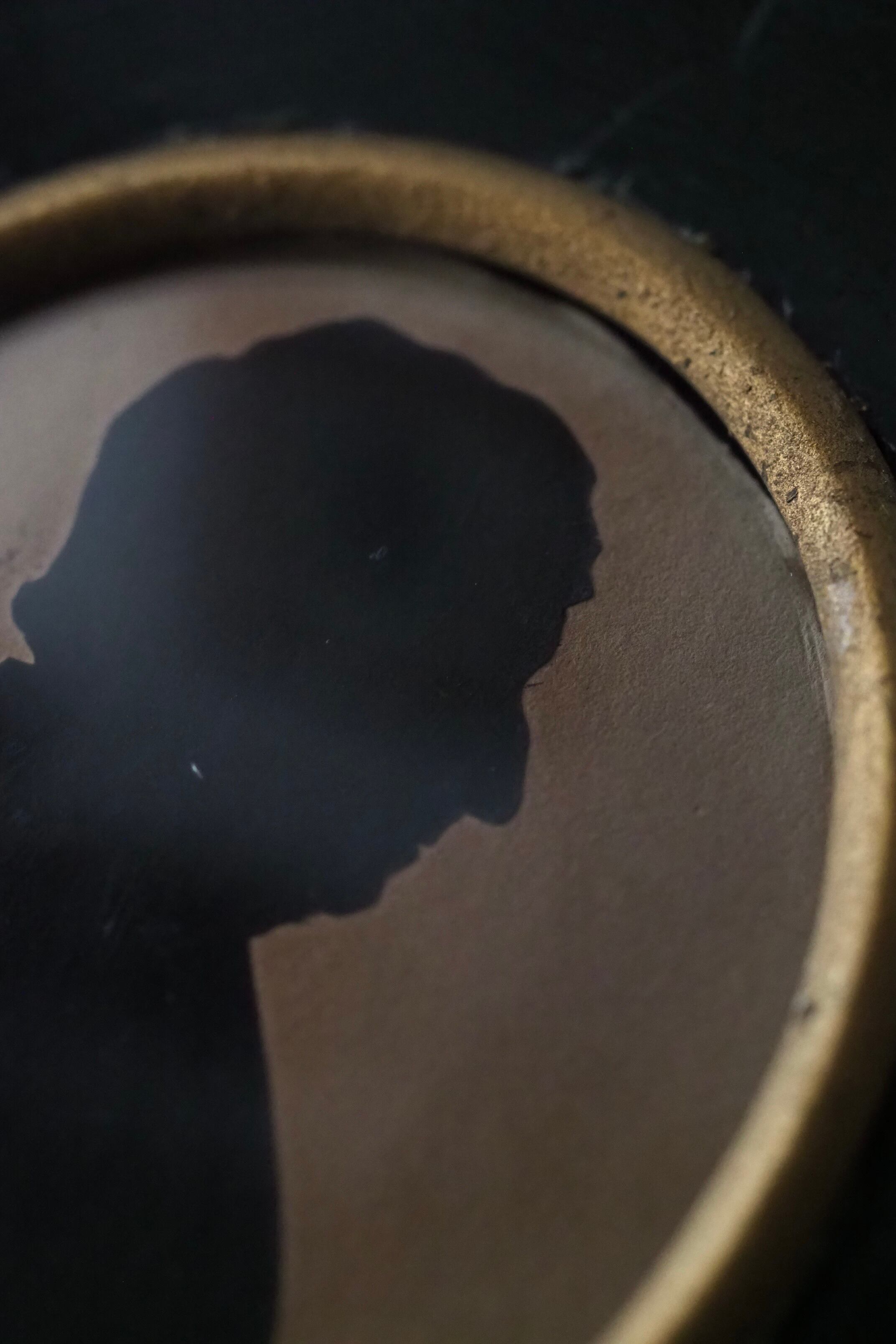 19世紀イギリス ニューカッスルのジョセフさんなる男性の横向き、虫眼鏡で覗くと影があるので絵ではなく切り取ってあるシルエット、まつ毛のみ鉛筆でさっと一筆伸びている。