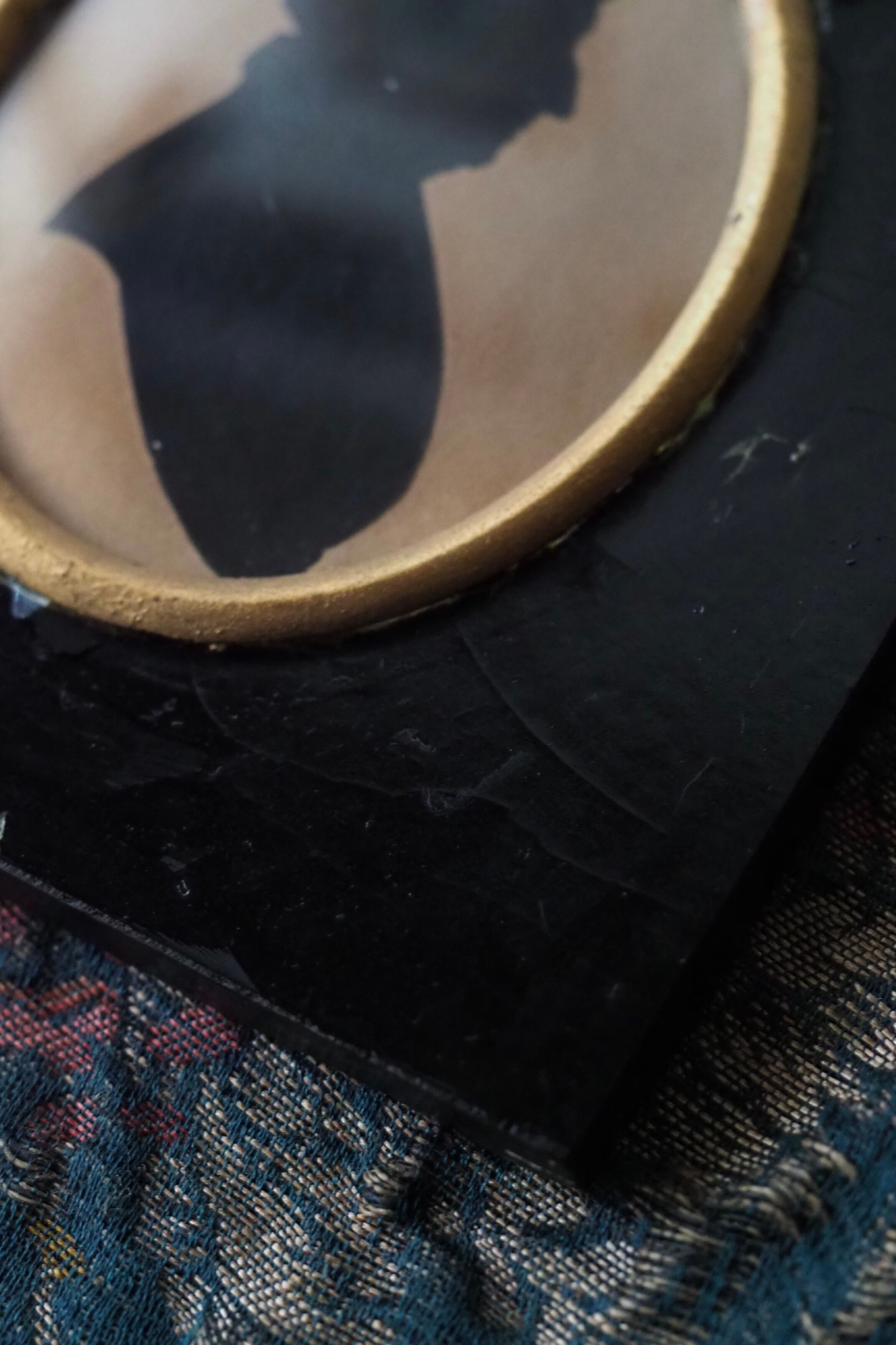 ピアノ塗装の黒木枠に要所クラックや浮きが見られますがその様正にアンティークの風合い。