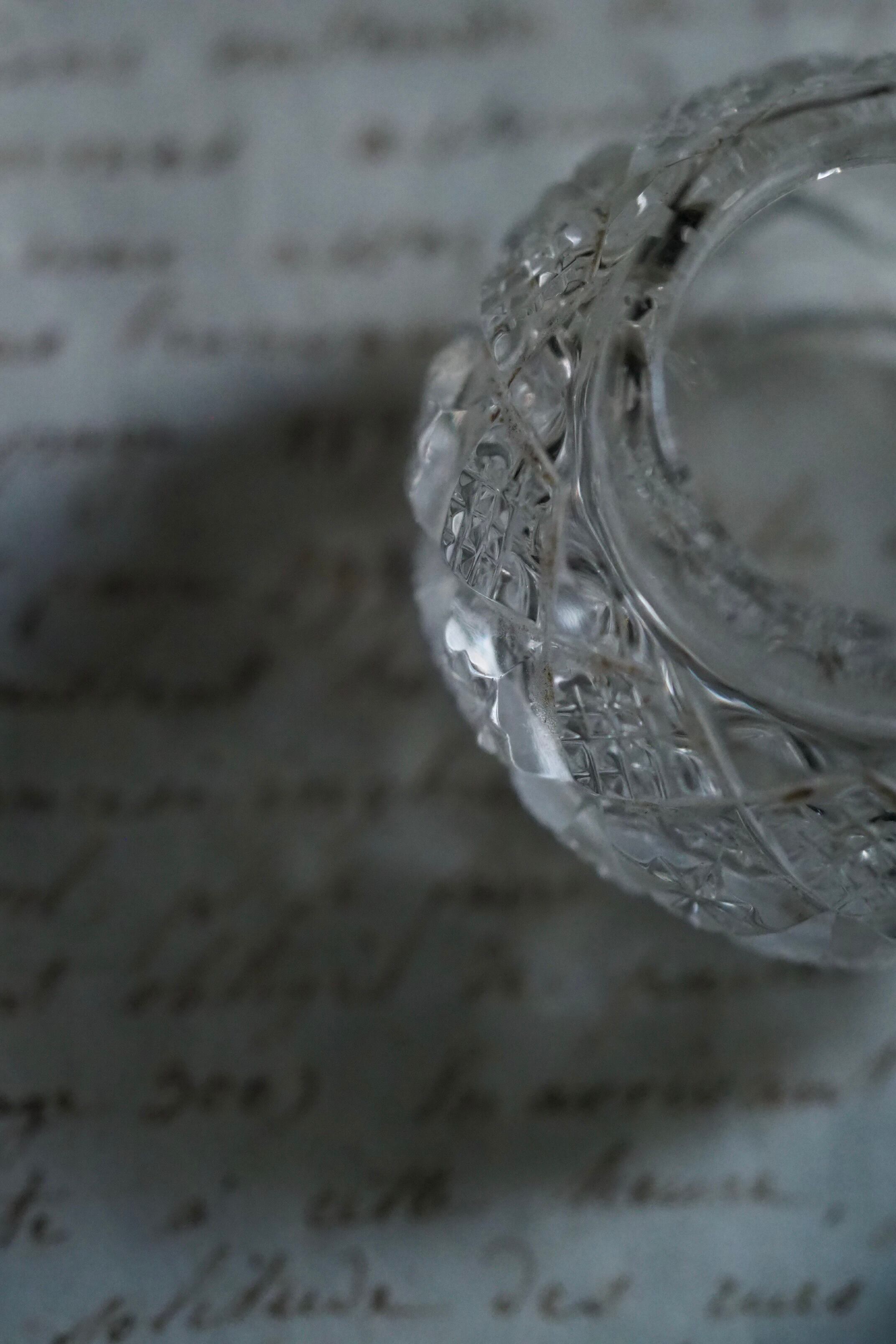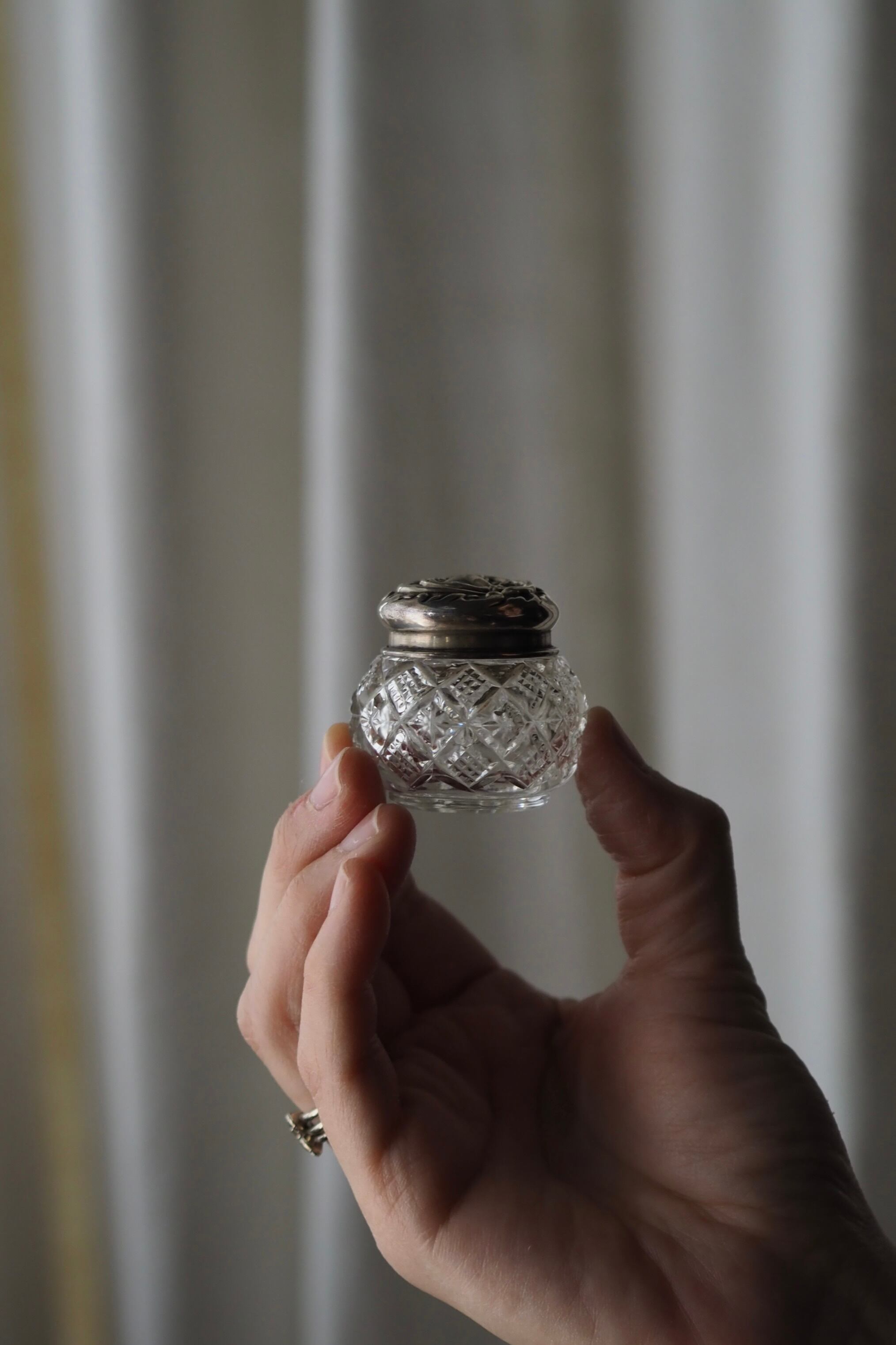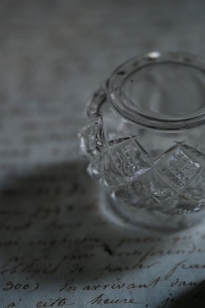 ガラス容器には幾何学カットが施されその小ささも相まって愛らしい存在感。