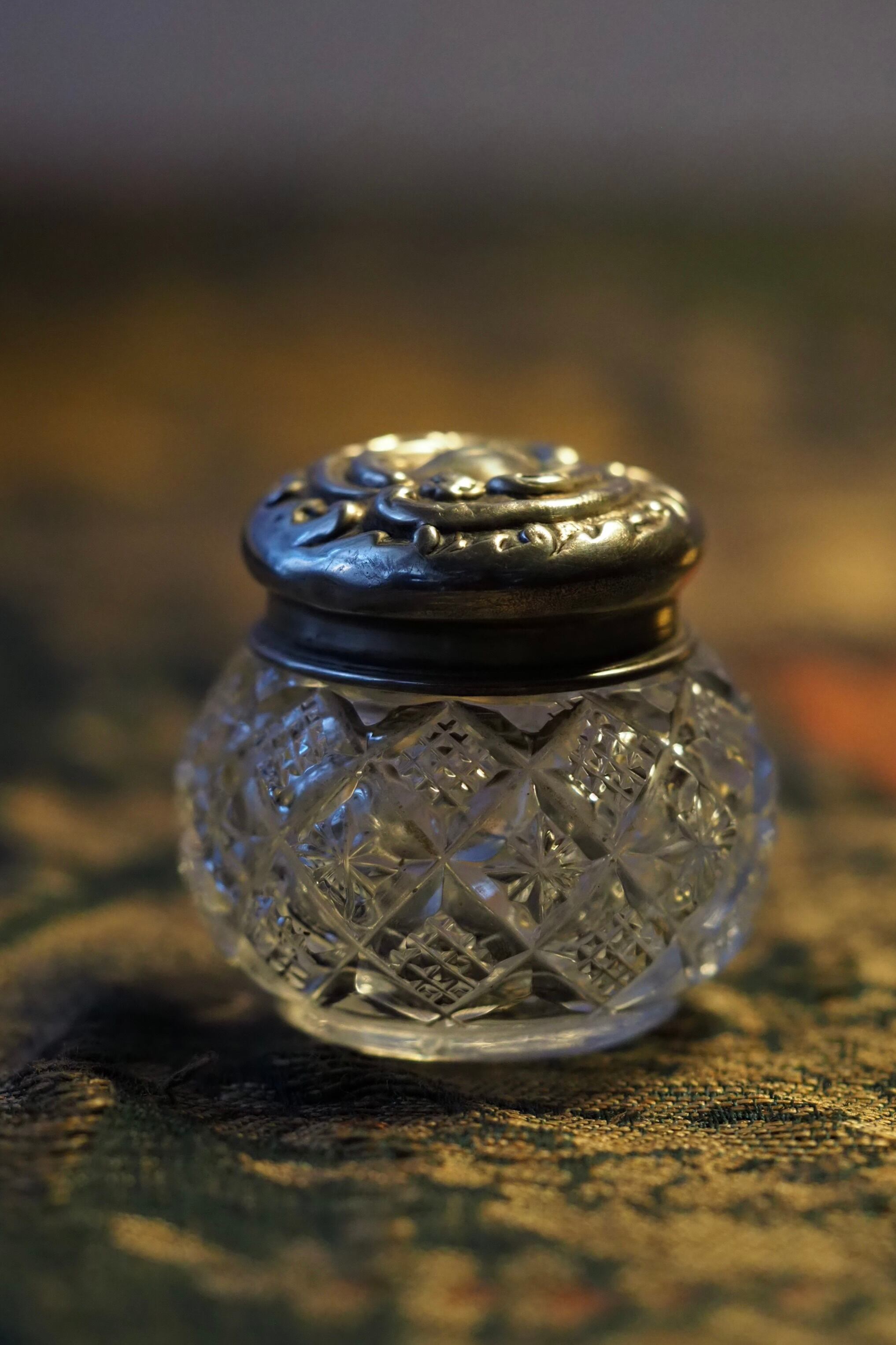羽羽ばたく様な文様と一輪のお花、葉が浮き彫りされた華麗なスターリングシルバーの蓋、イギリスのコールドクリーム入れ。