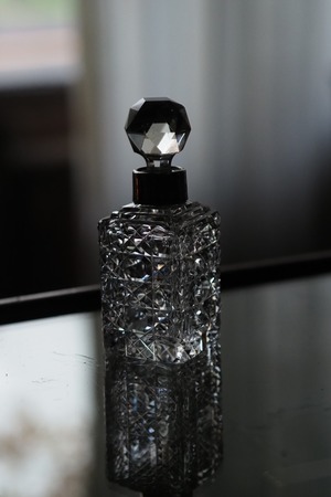 多面体カットの蓋と共に細かな幾何学デザインの明暗散らばる四角い香水瓶。