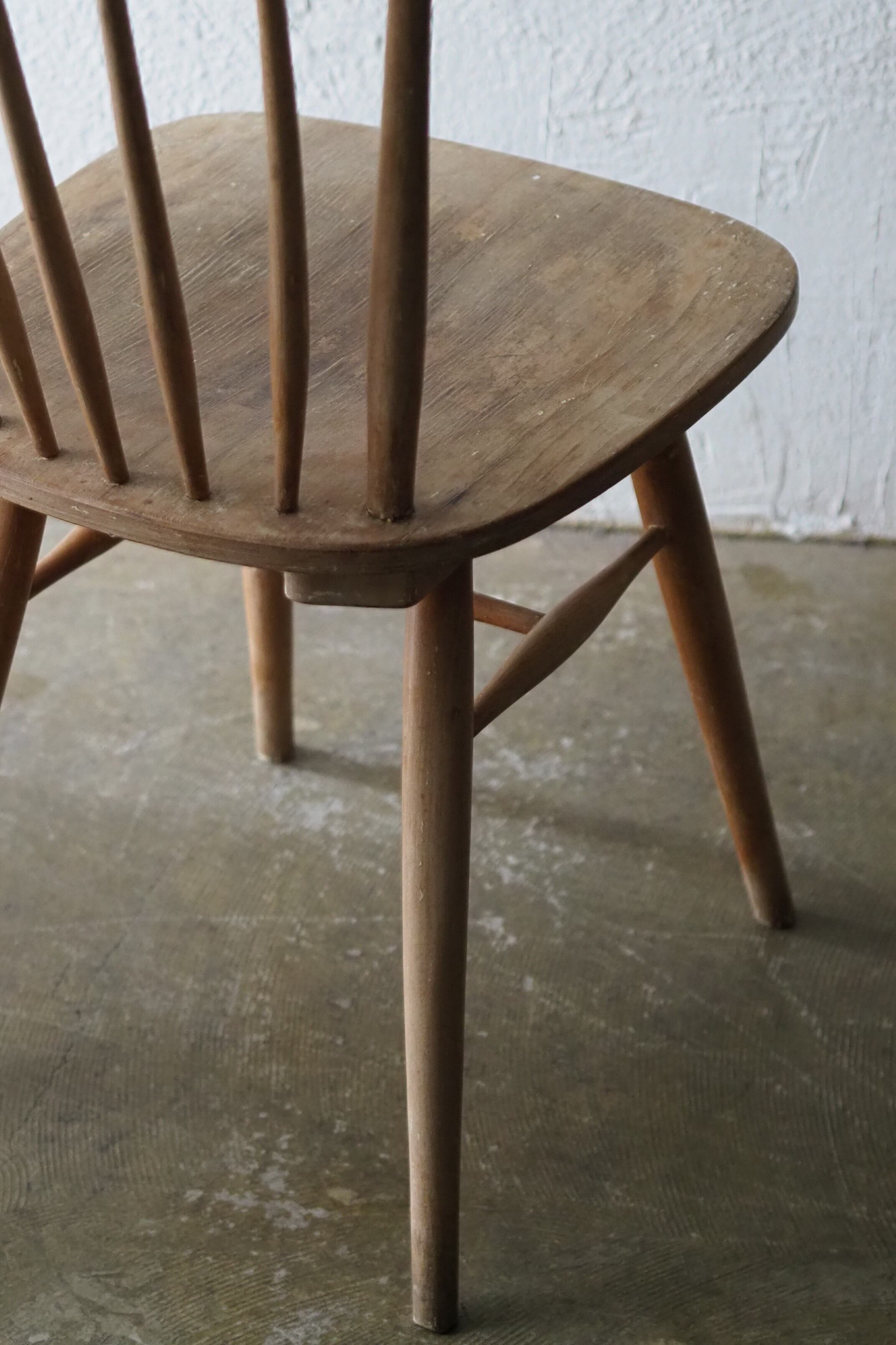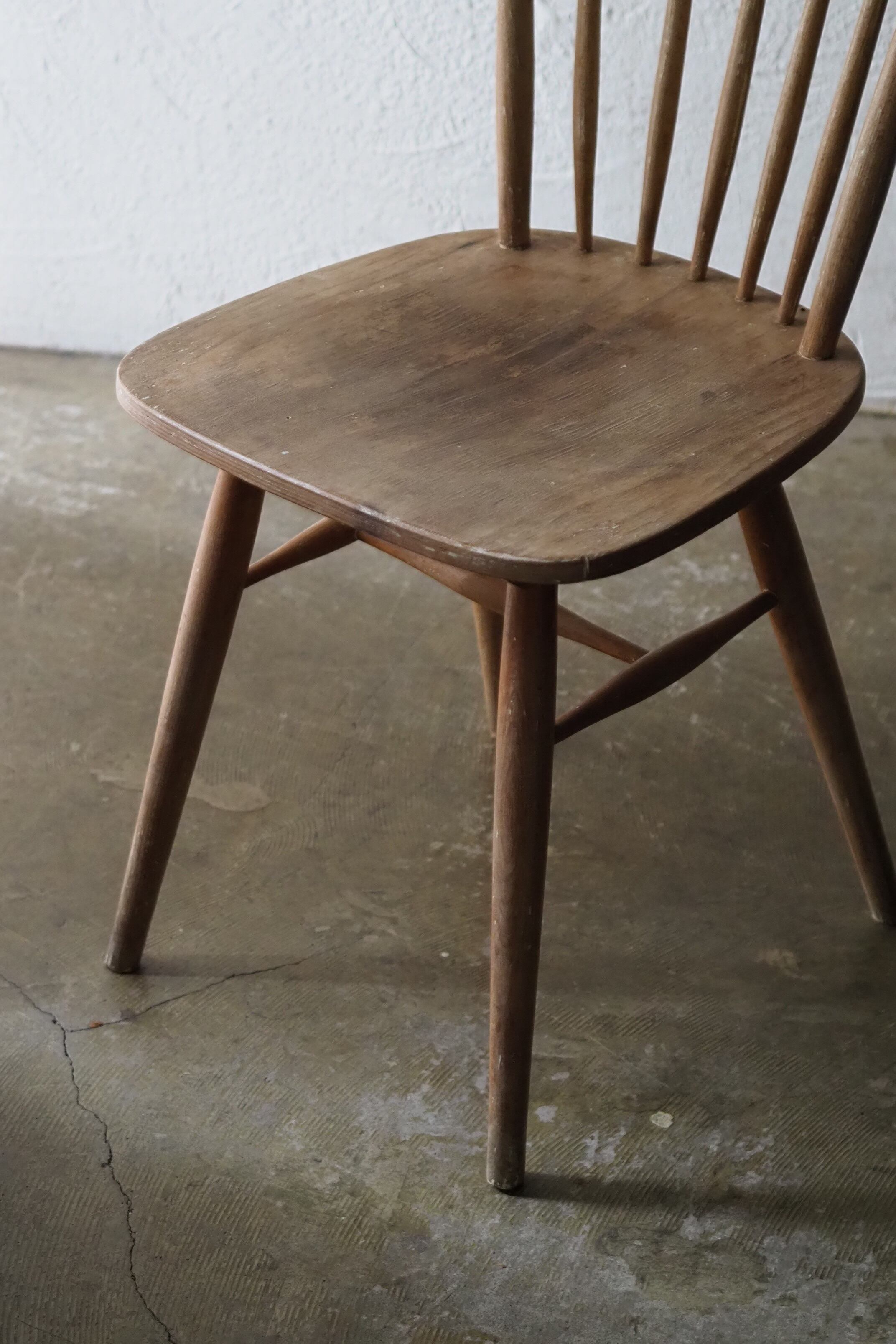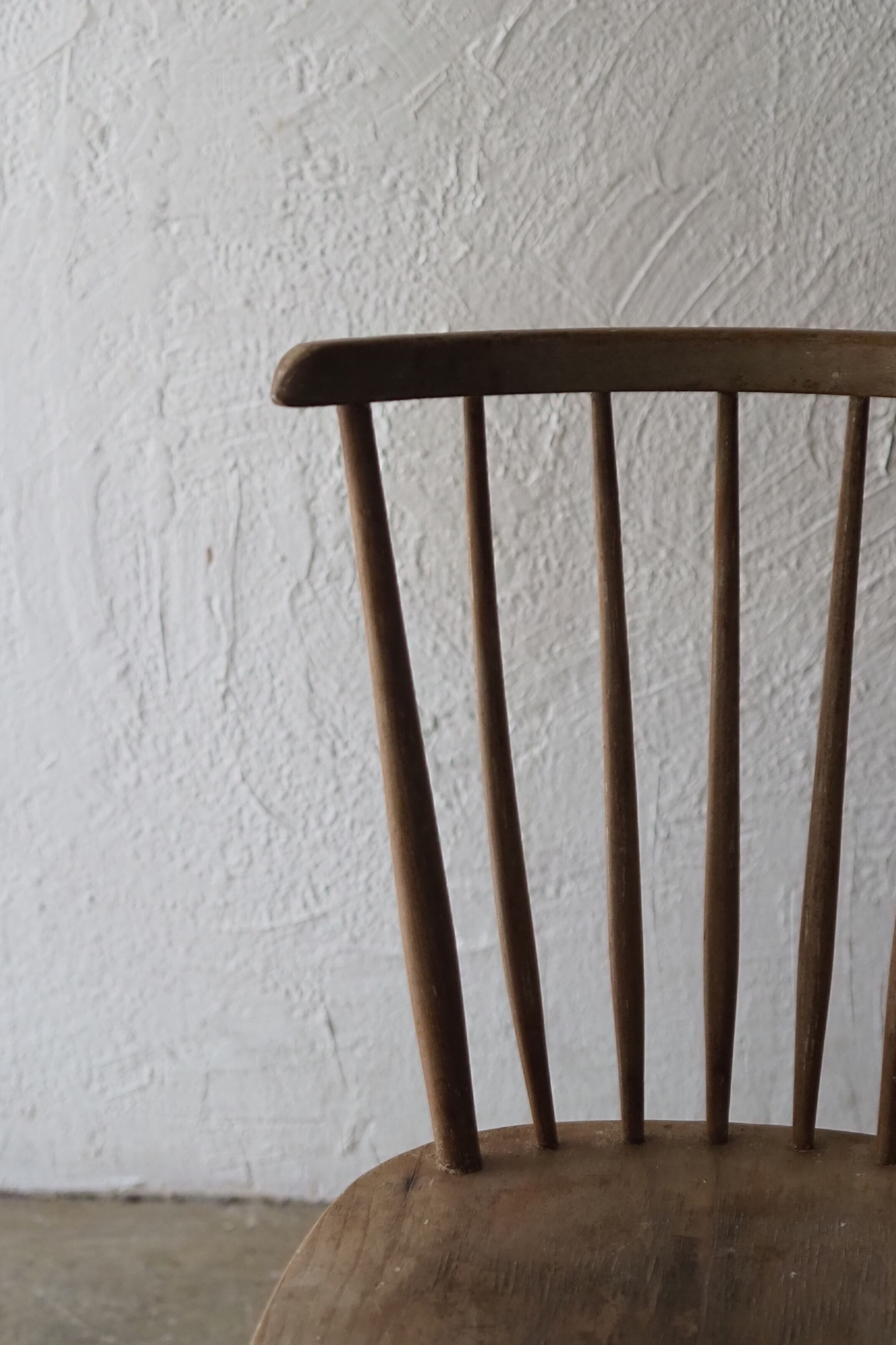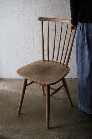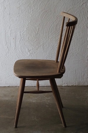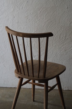 20世紀半ばイギリスのスティックバックチェアで背柱除いた背板が多くエンドは座面の溝に収まっている一脚。背の重さを受け止めるのに適当という事かと。