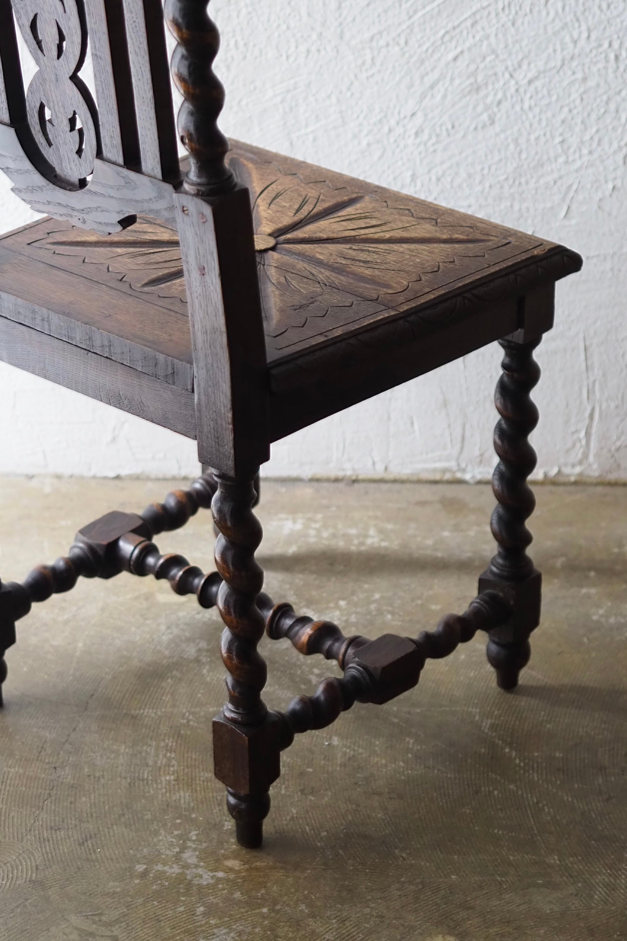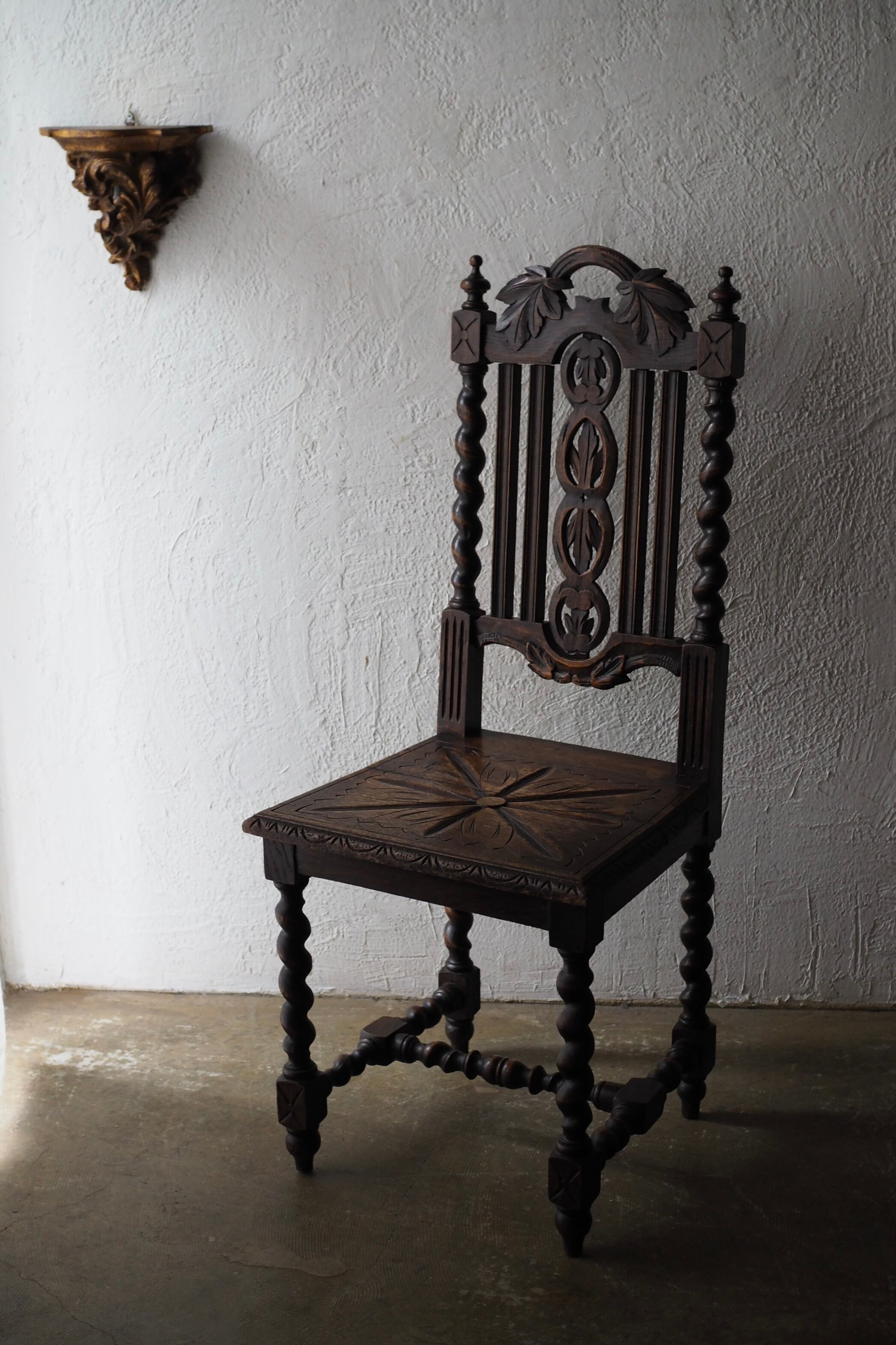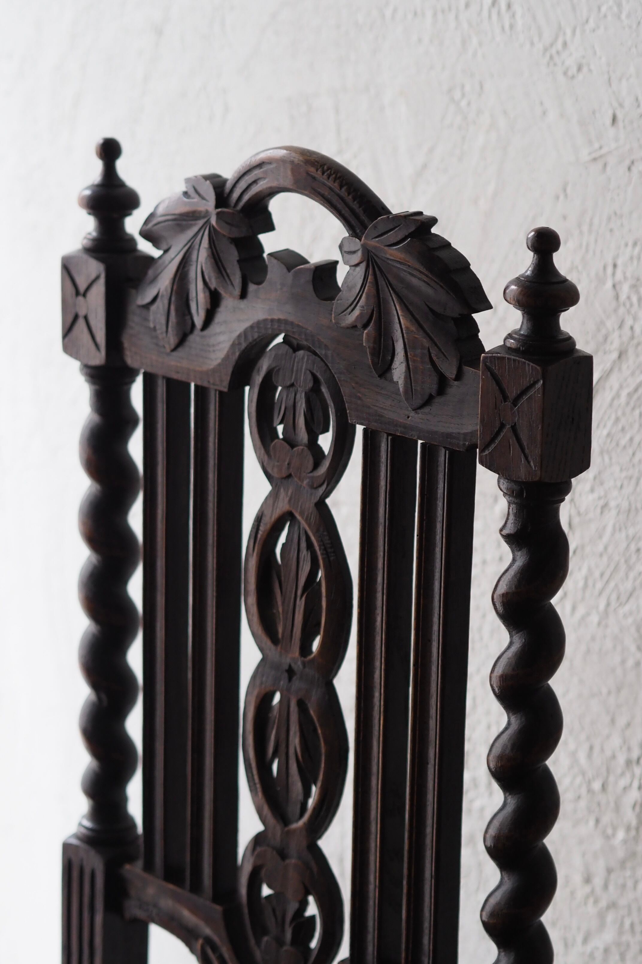 手彫りの味わいある座面の彫り模様、葡萄の葉を筆頭に植物の連続性を感じるモチーフで美しい透かしの背もたれになっている。