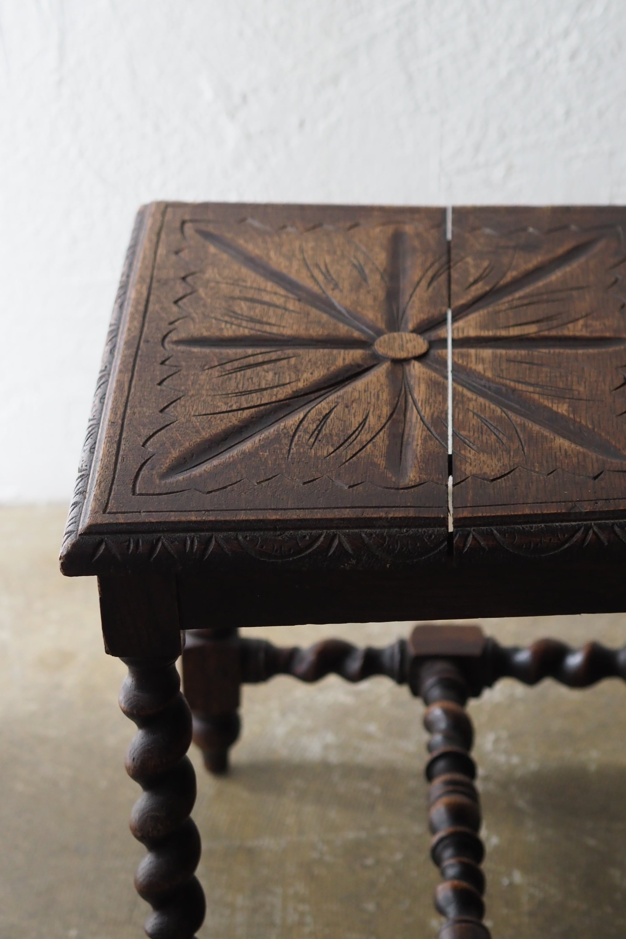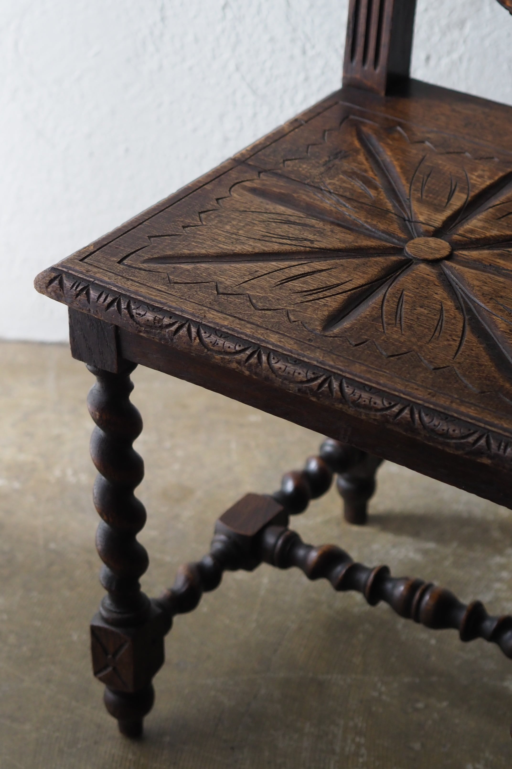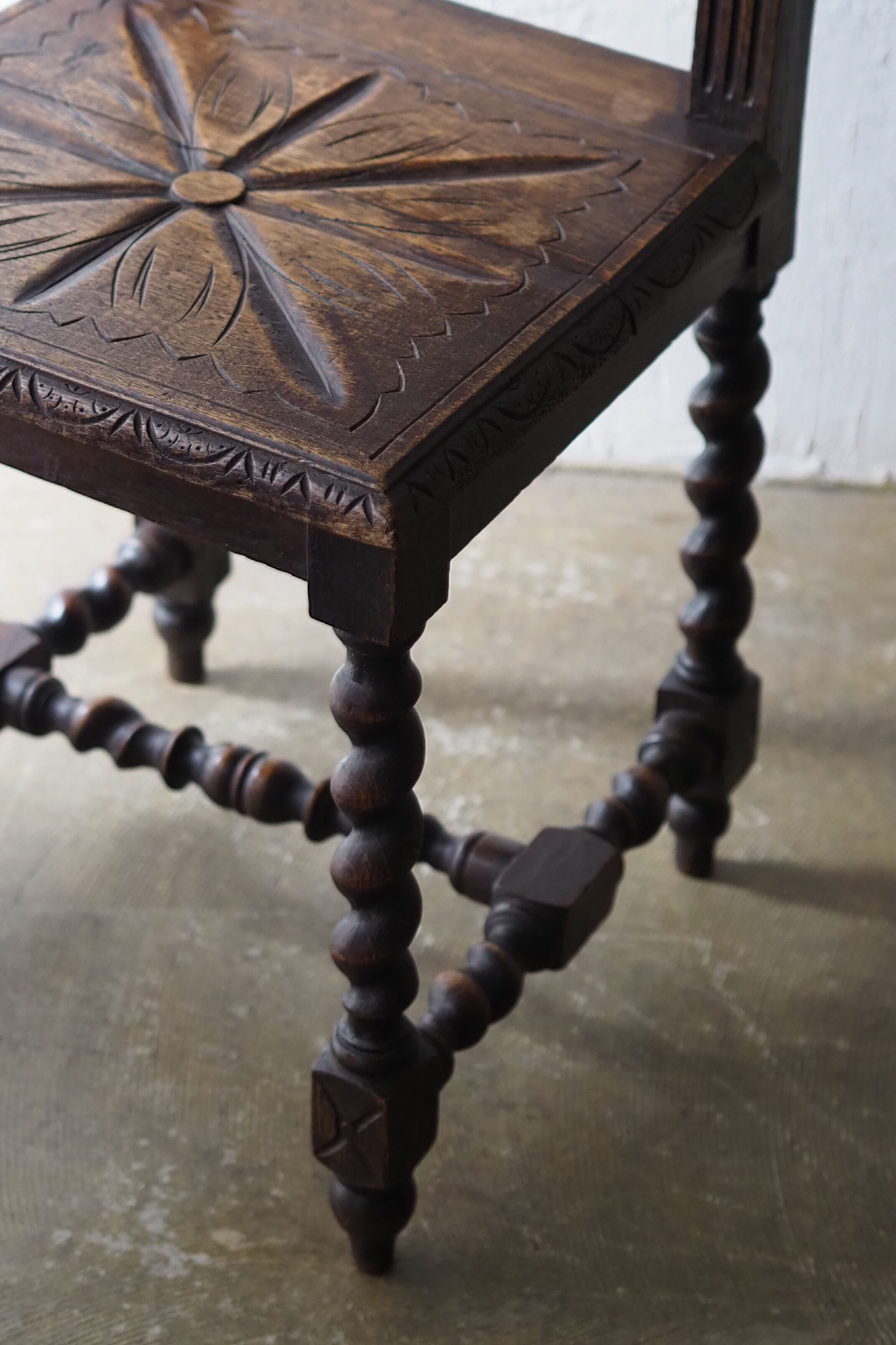 手彫りの味わいある座面の彫り模様、葡萄の葉を筆頭に植物の連続性を感じるモチーフで美しい透かしの背もたれになっている。