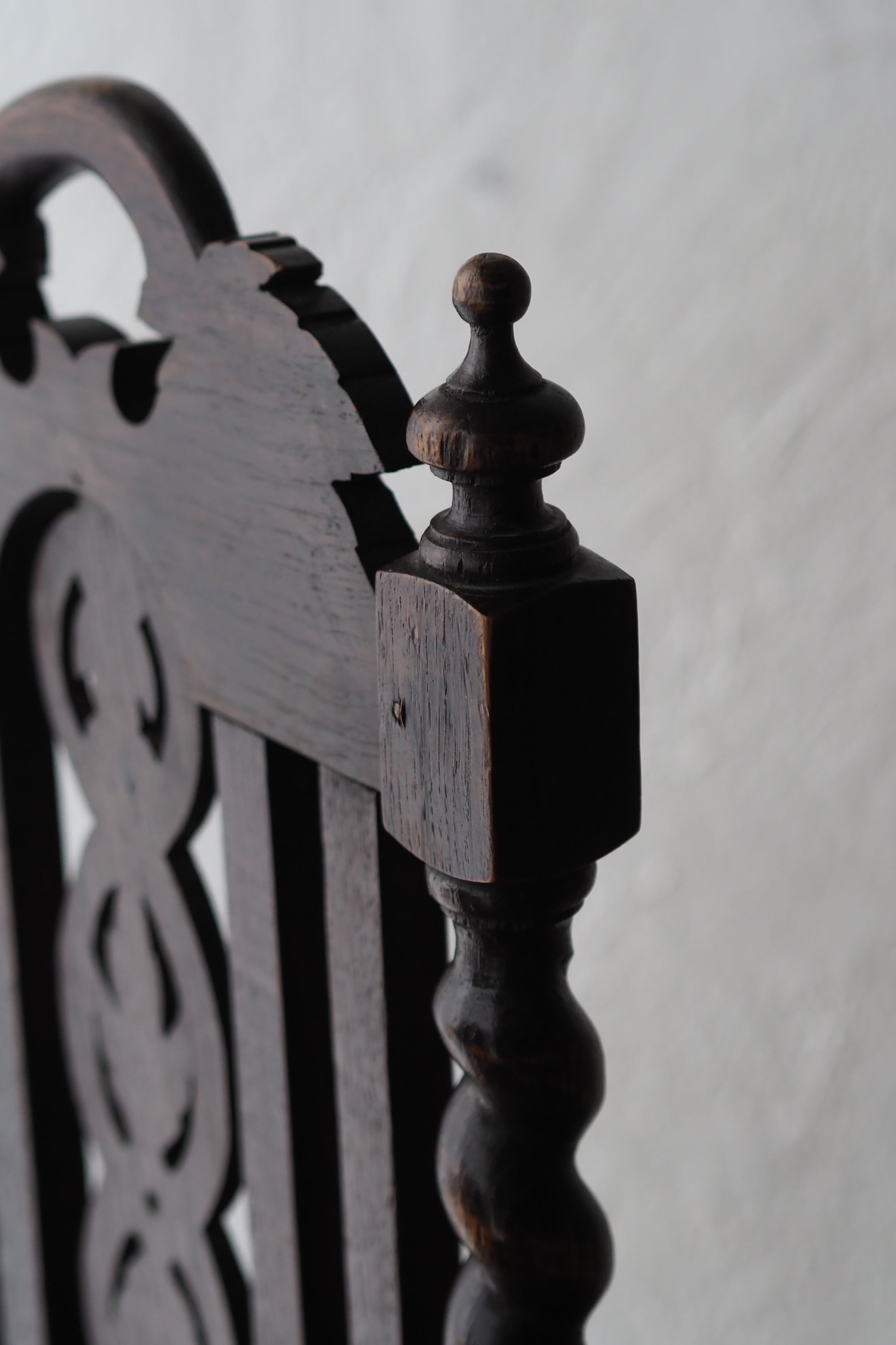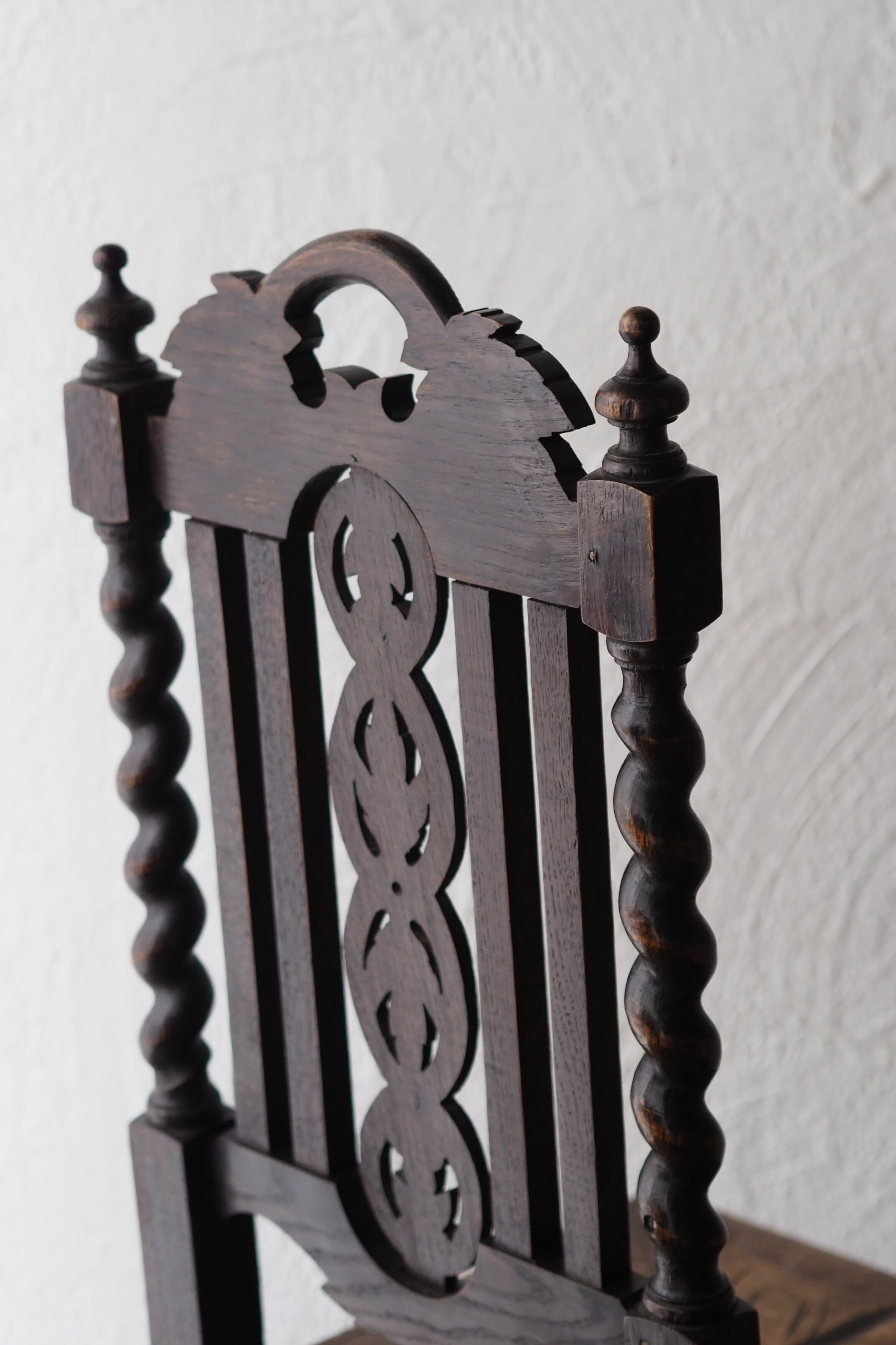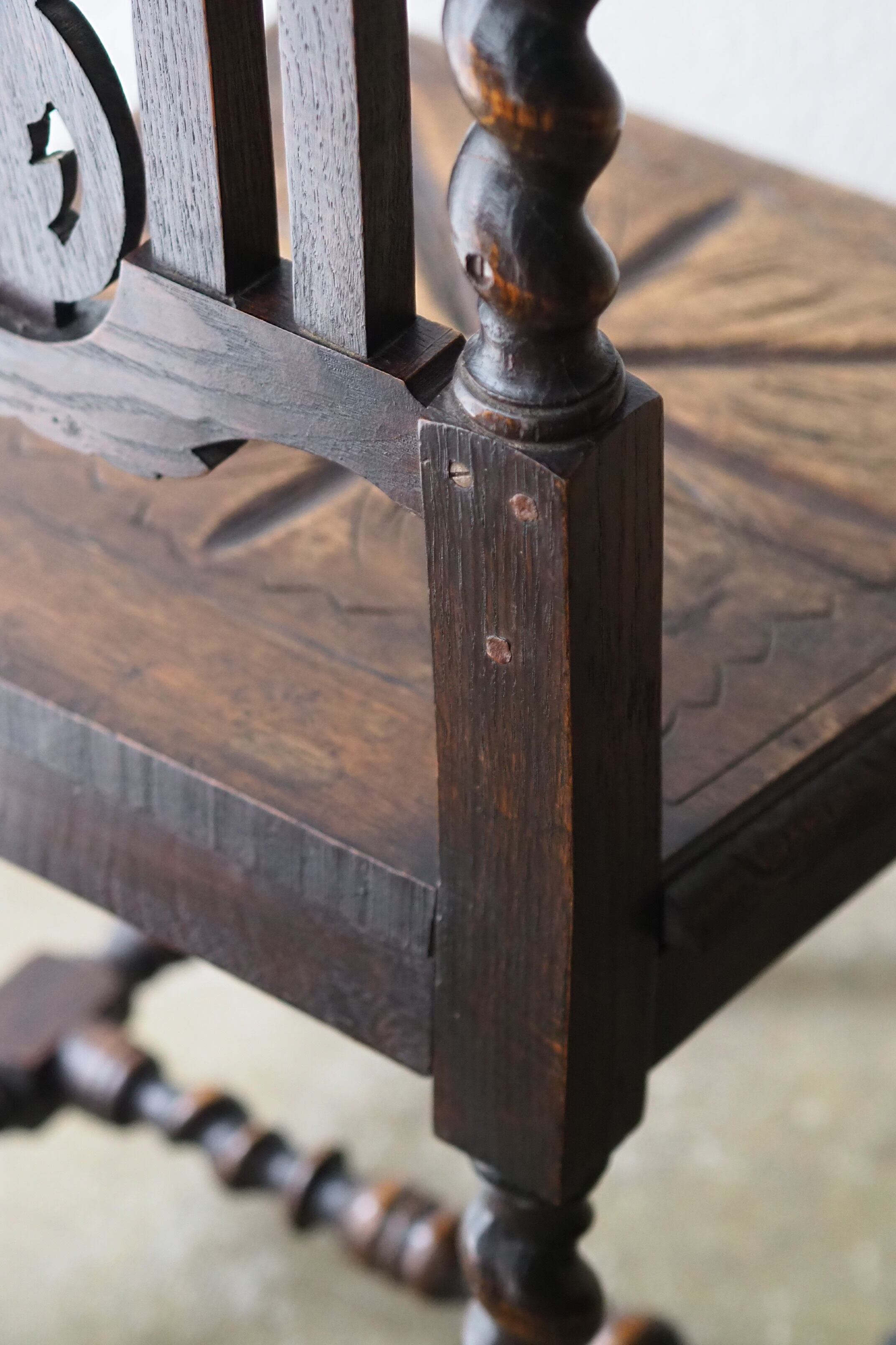 貫や脚、随所に捻りろくろデザインを多用している、イングランド東南部ヨークシャー地方で作られた椅子。