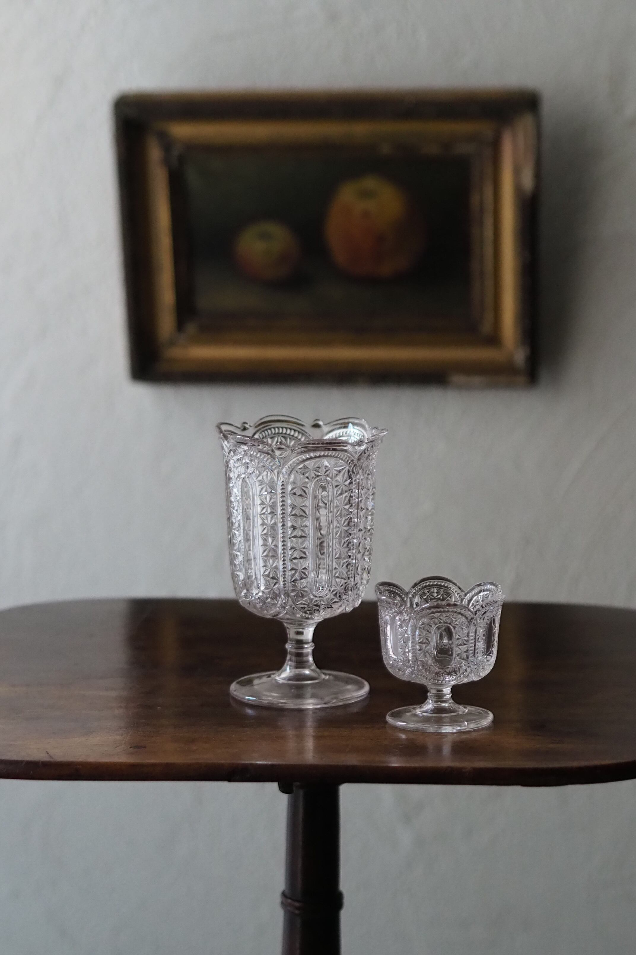 大きいガラスはスプーンホルダーだったもの。こちらも器部分に高さがあるのでハーブでまとめたキッチンブーケを生けては。脚が付いていてバランス良くお花を生けられます。