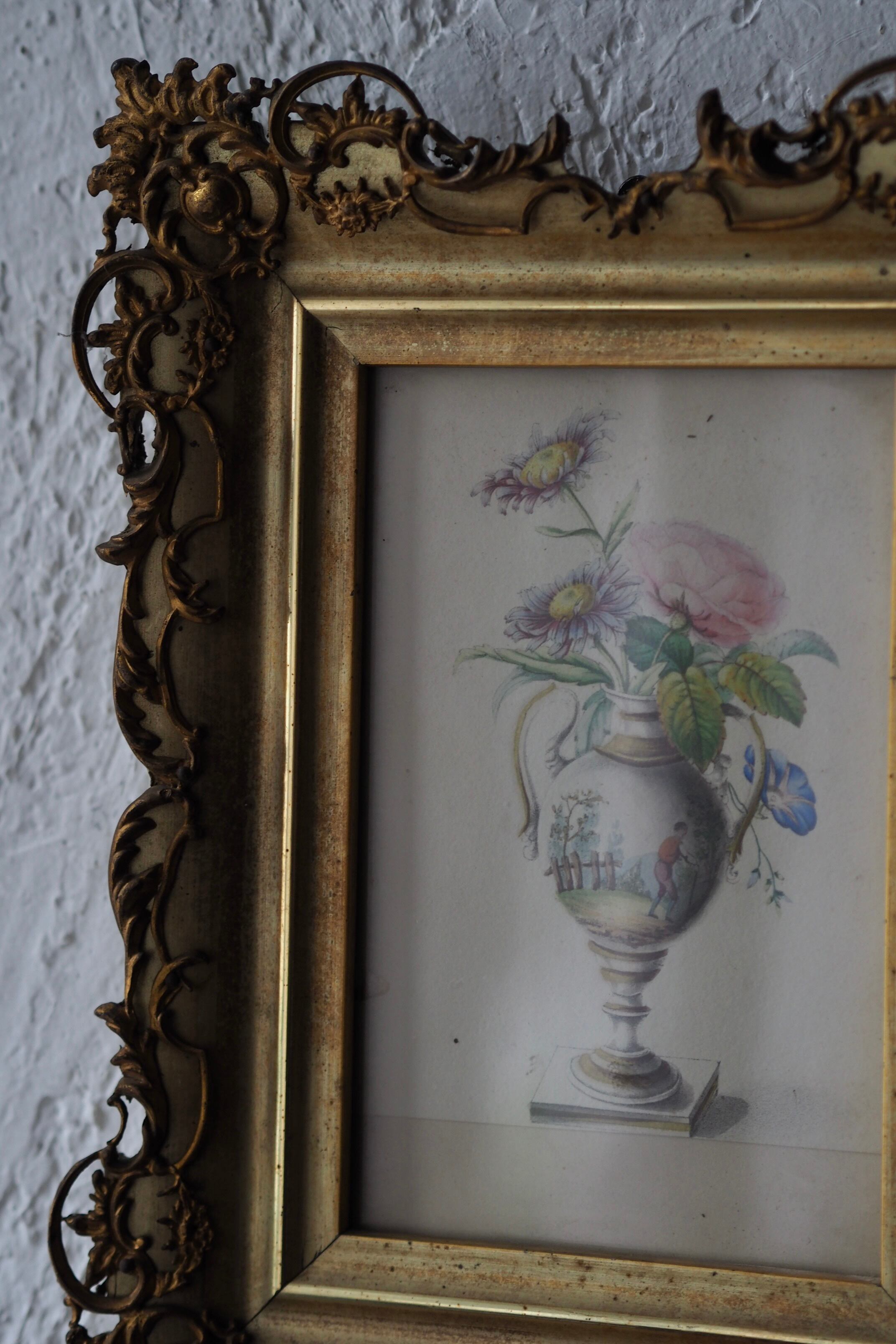 額装されたのは柔らかい線で表現された銅板印刷の壺と植物。