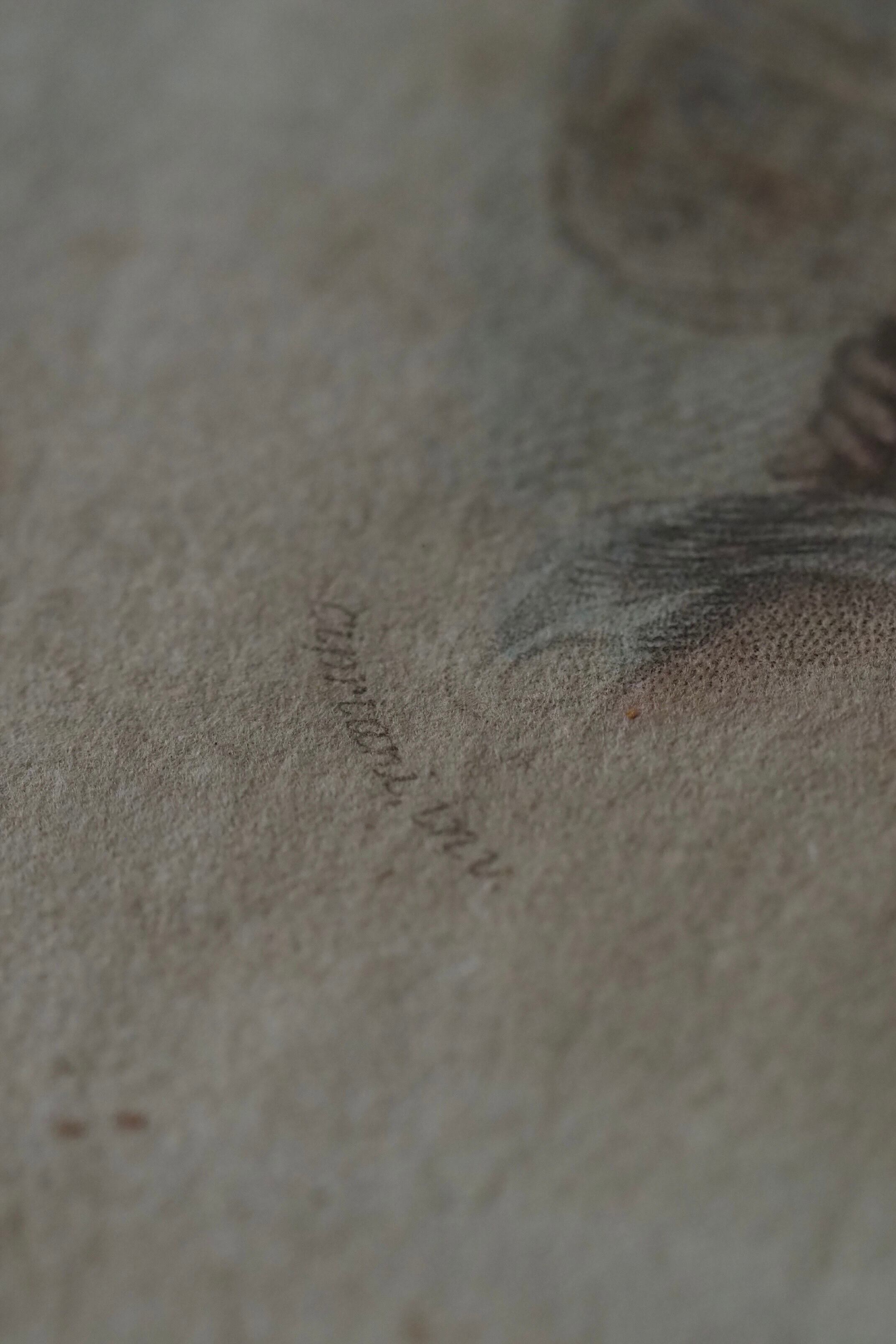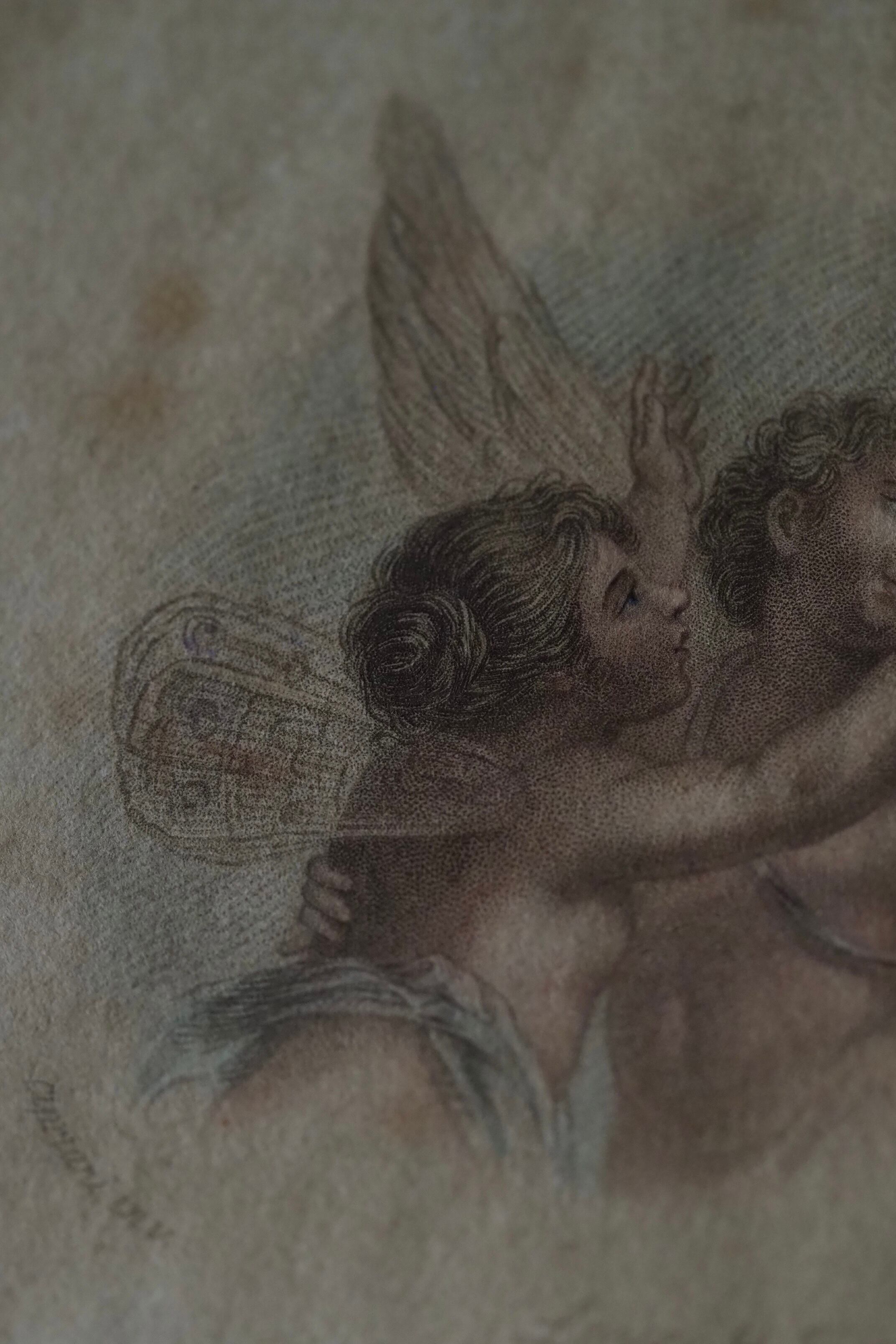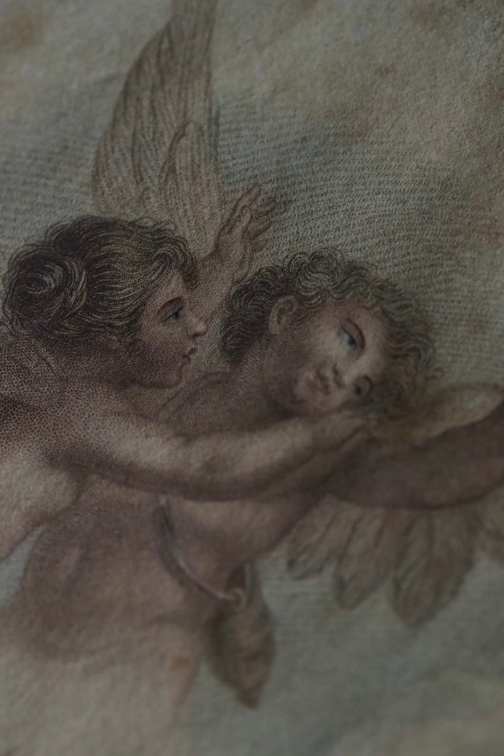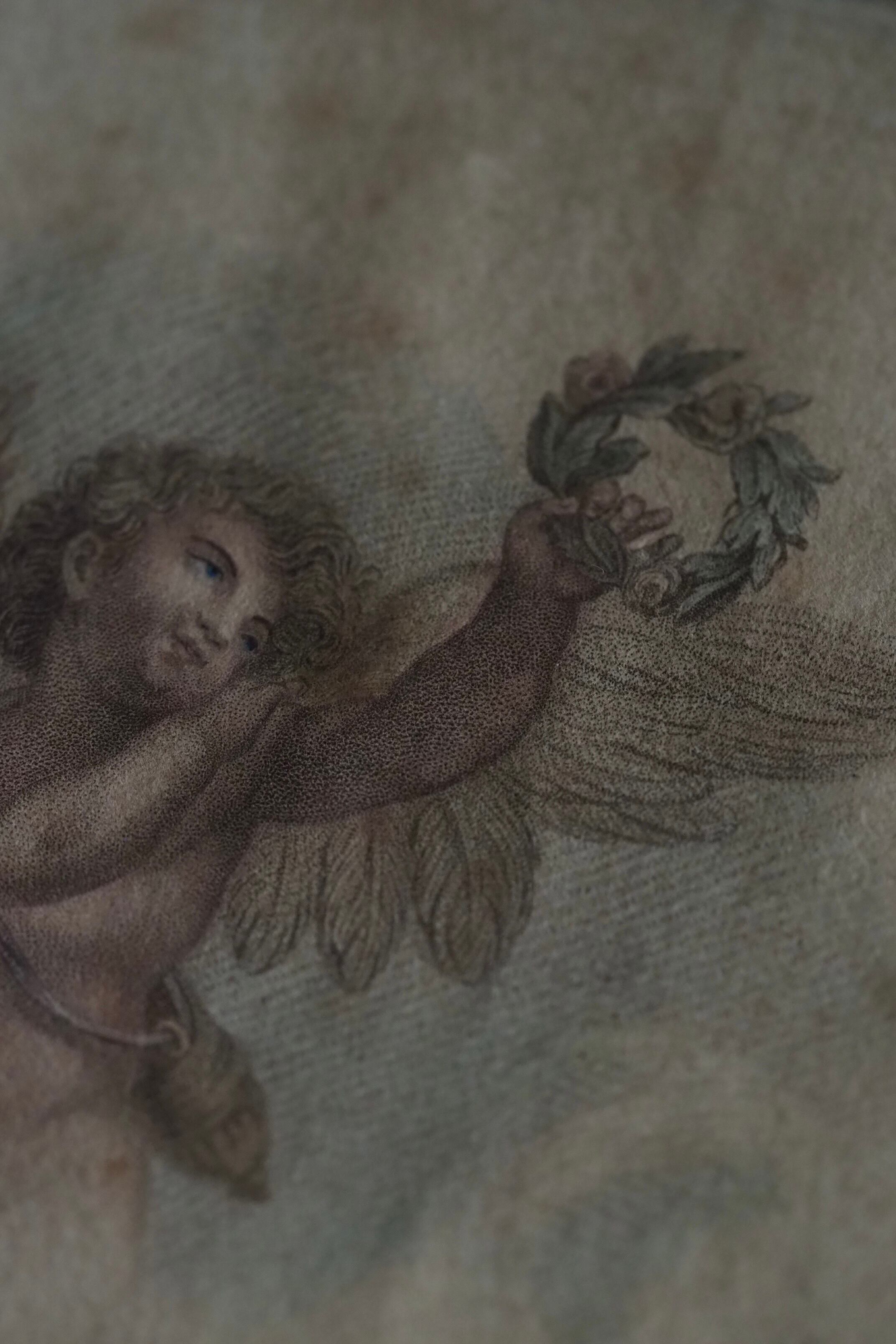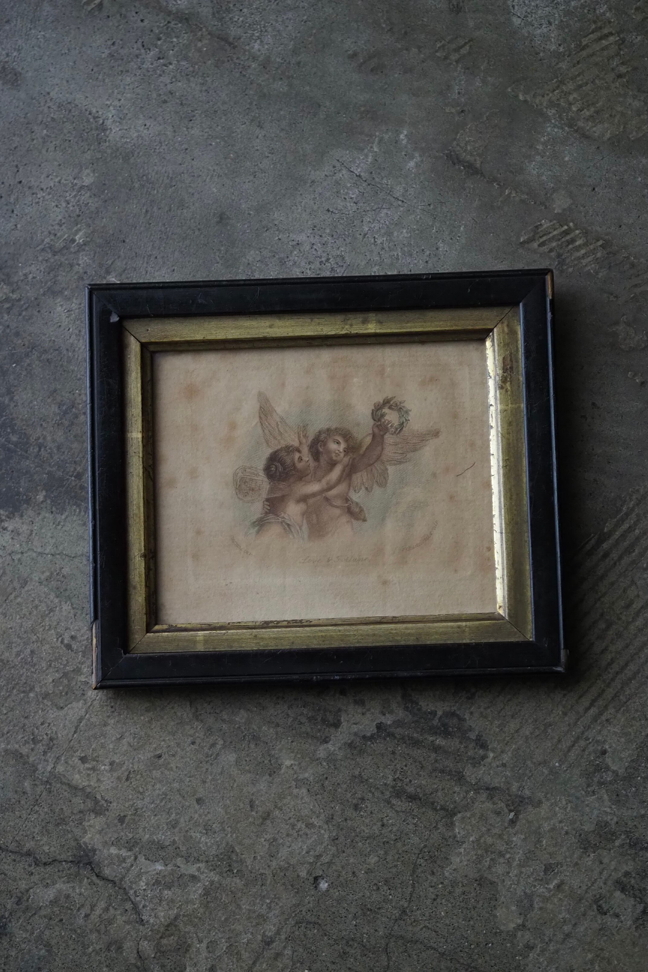 良いお顔の二人。天使ともう一方はトンボの妖精でしょうか、幸せに植物のリースを追っている仕草が微笑ましい。