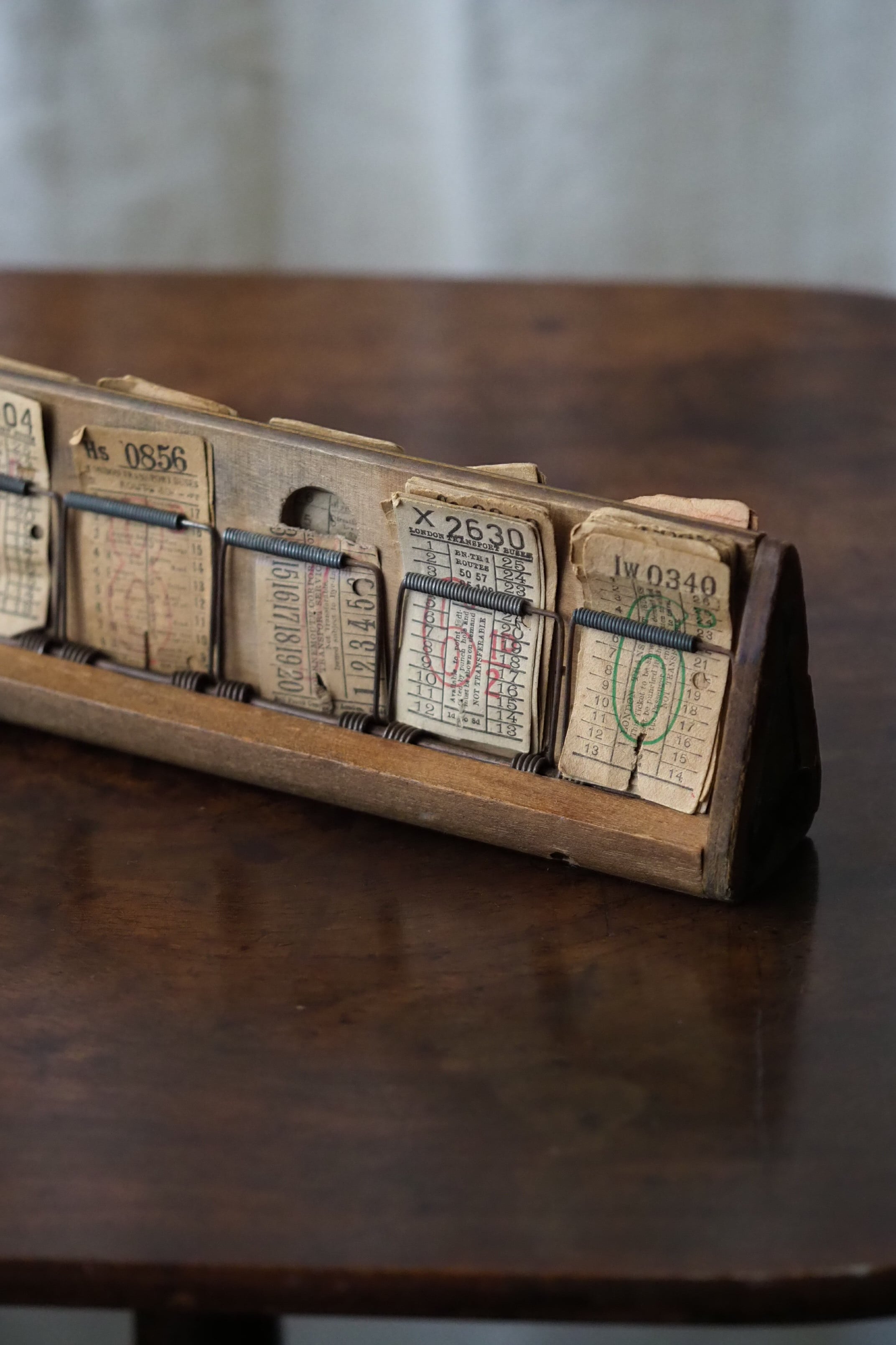 ルート上行き先までの運賃が直ぐに分かるようにスタンプが押されており格好良いフォント文字と使い込まれたチケットホルダーの木の味わいが情緒ある雰囲気に。