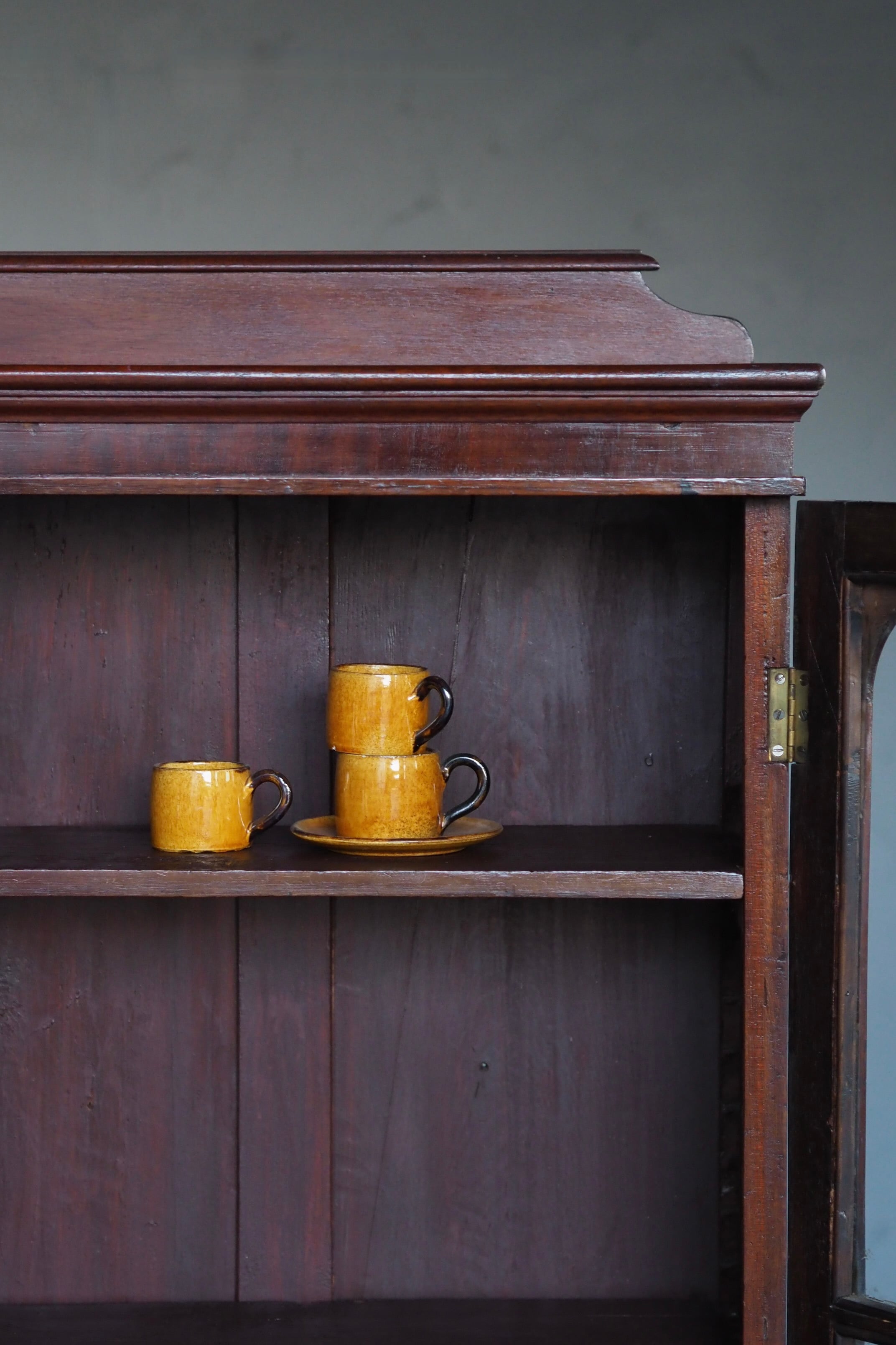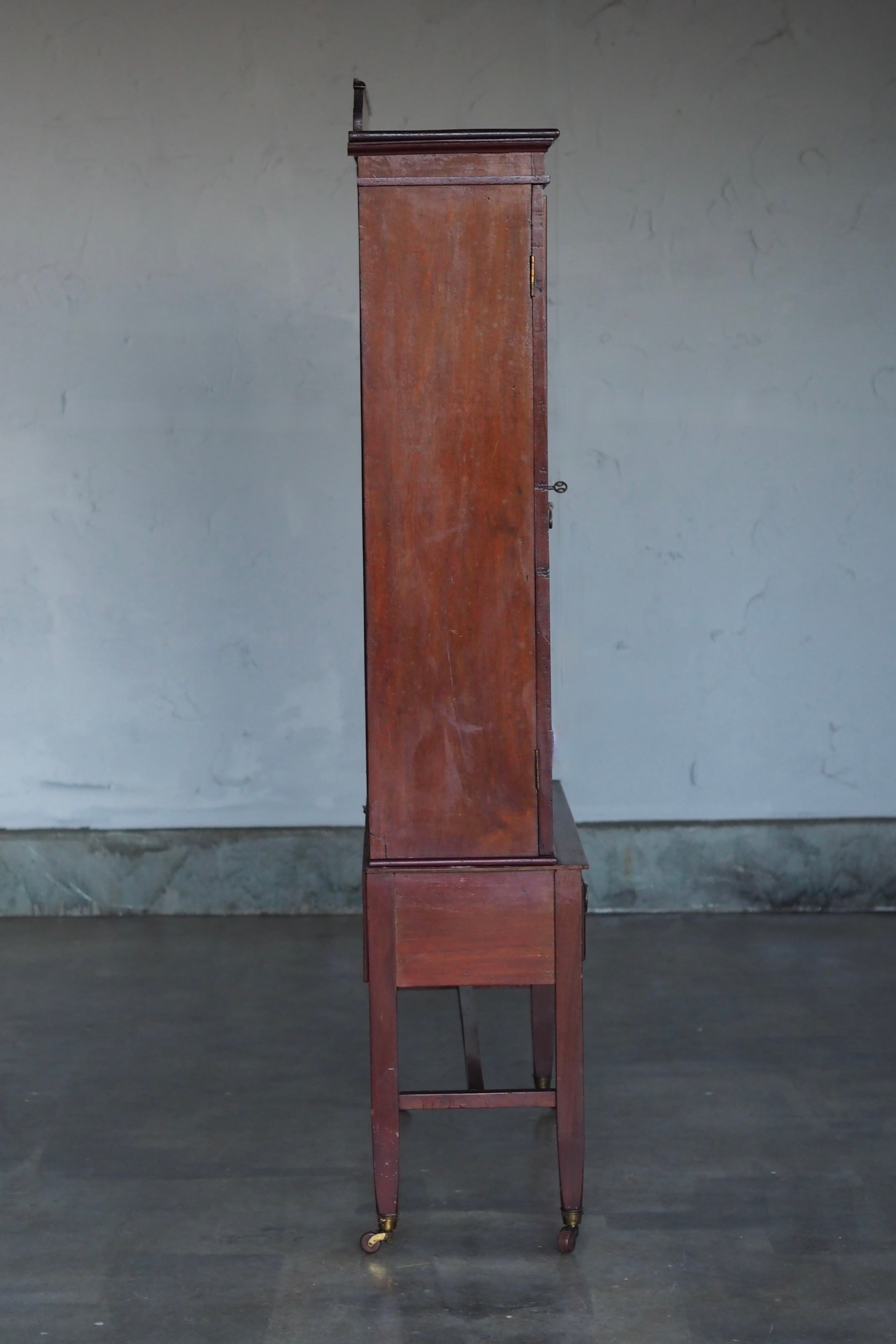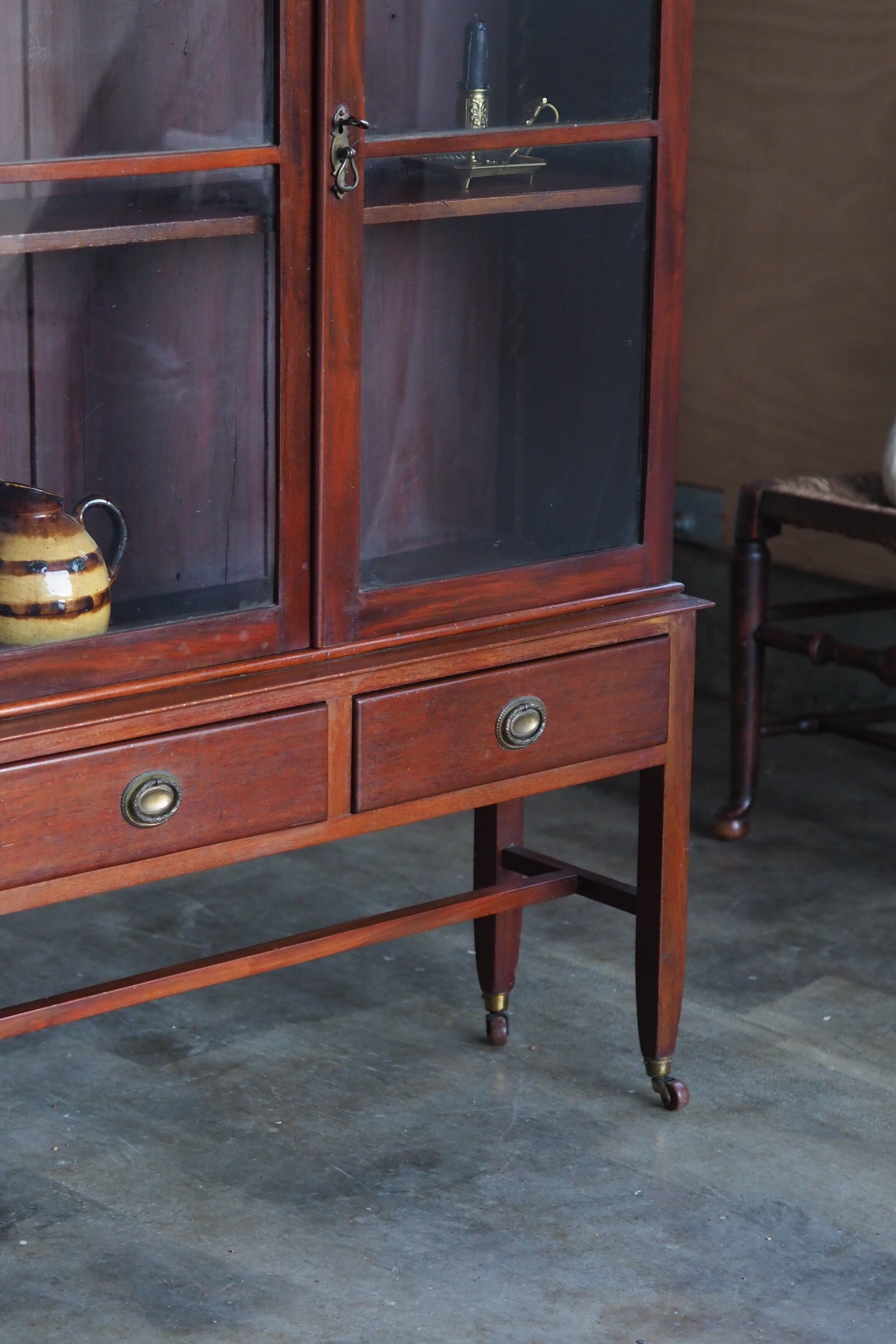 真っ直ぐな脚、引き出しの引き手が20世紀初頭のアール・デコ期のシンプルなデザイン、その中でアールを描いた扉縁とトップの飾りが印象和らげ全体上品な、ショーケースとも言えるコレクションキャビネット。