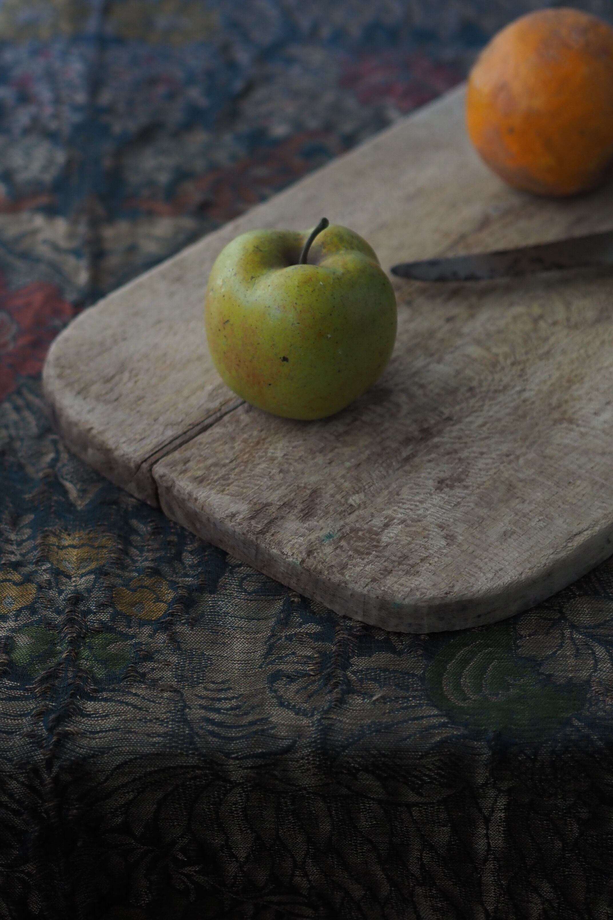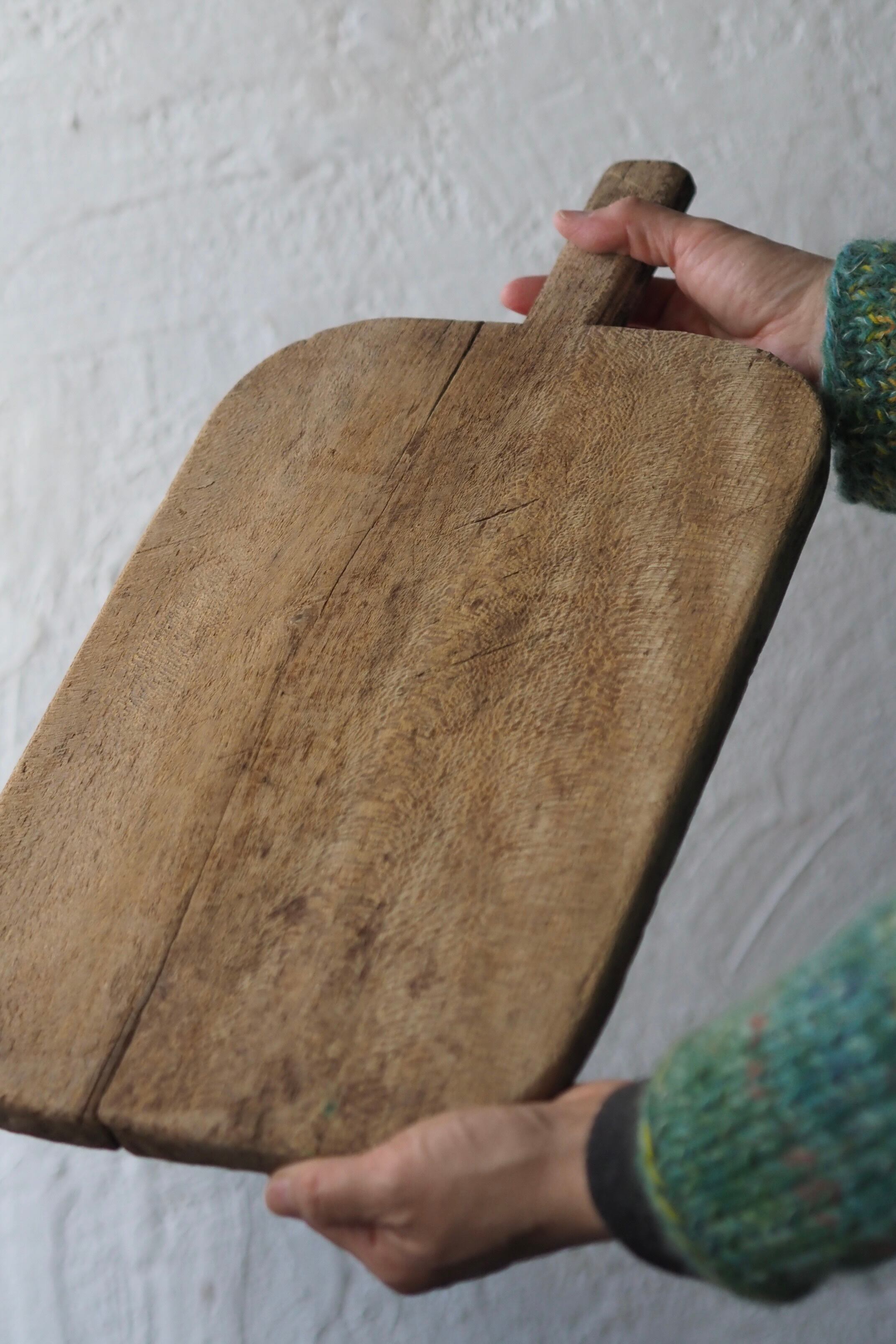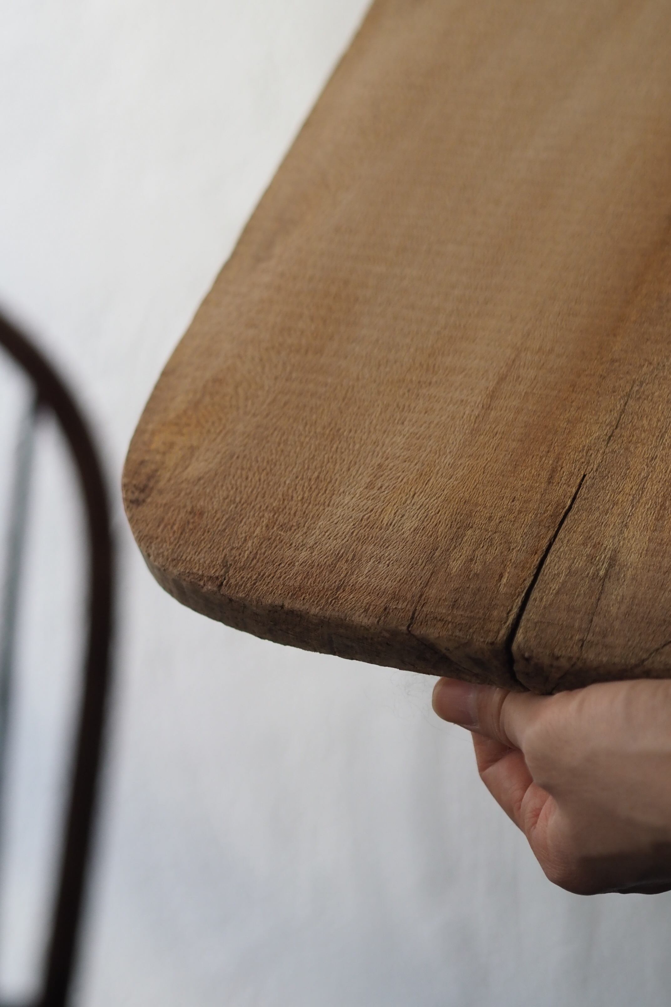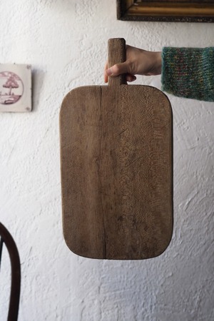 乾いた質感のカッティングボード、それもそのはず、イギリスからのお品で20世紀初頭位のまな板ですが近年表面割と綺麗に削り手入れされた様。
