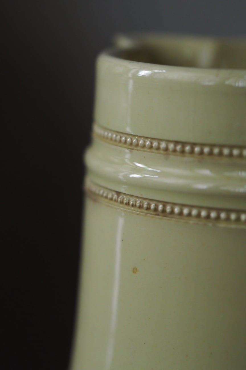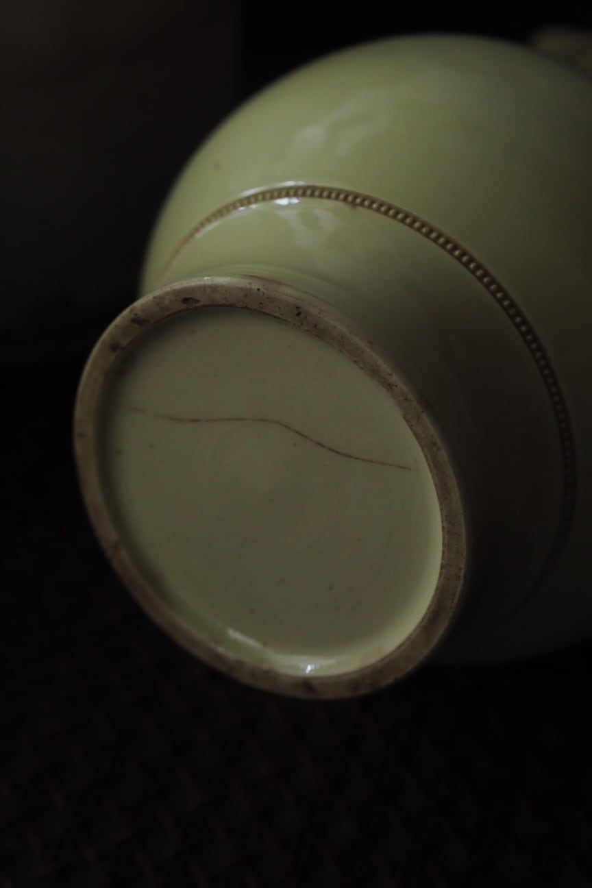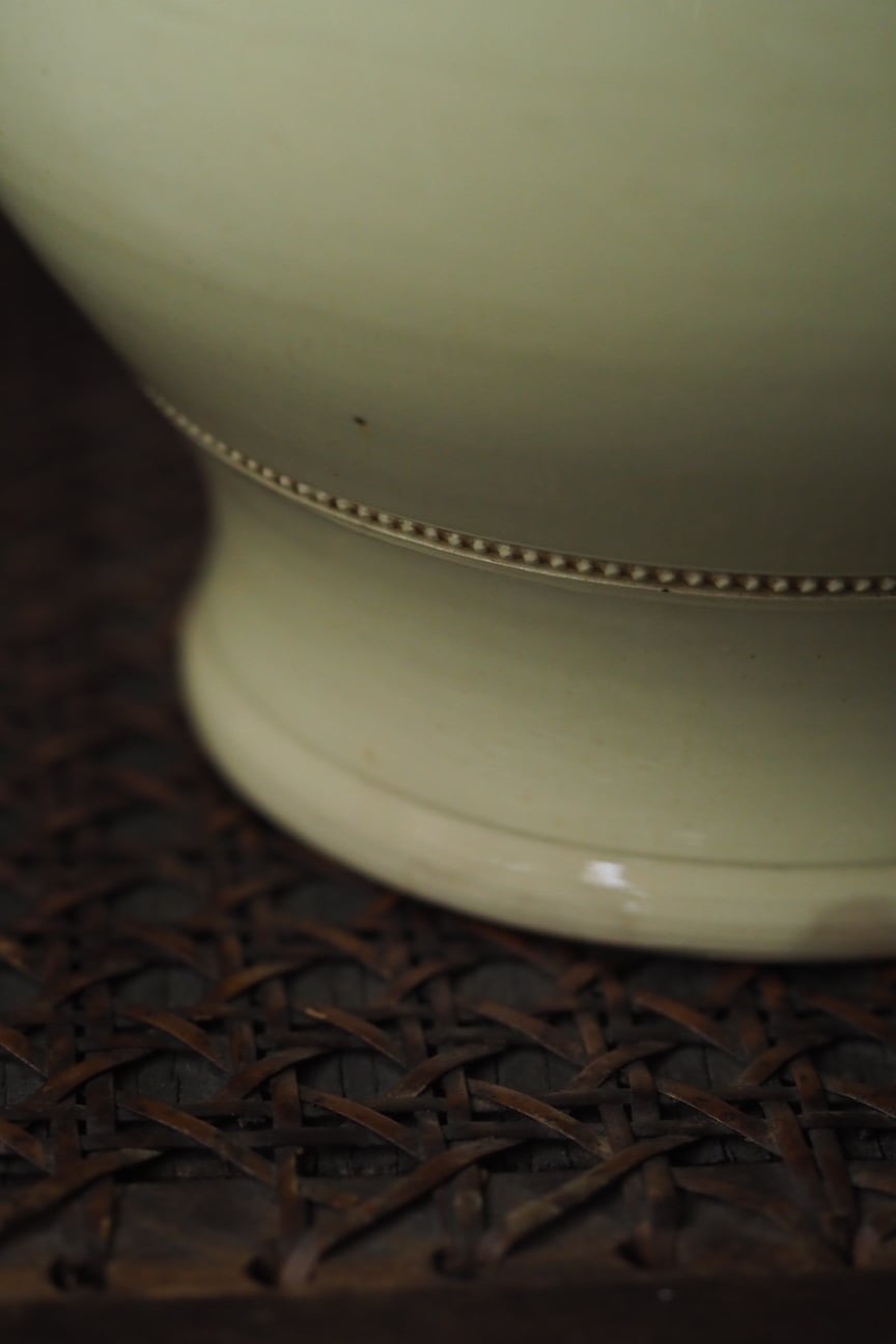 フォルム下に広がり重心低く、そこに真珠が繋がった様に粒々としたモチーフを区切りに高台が付いて優しい印象。