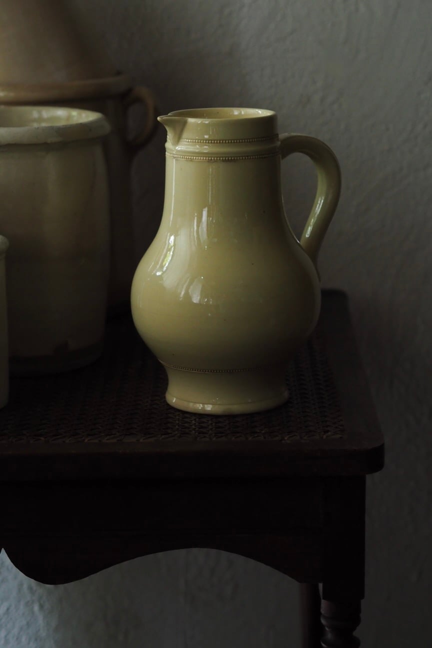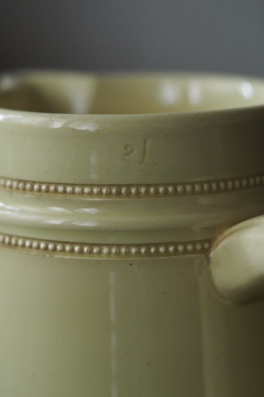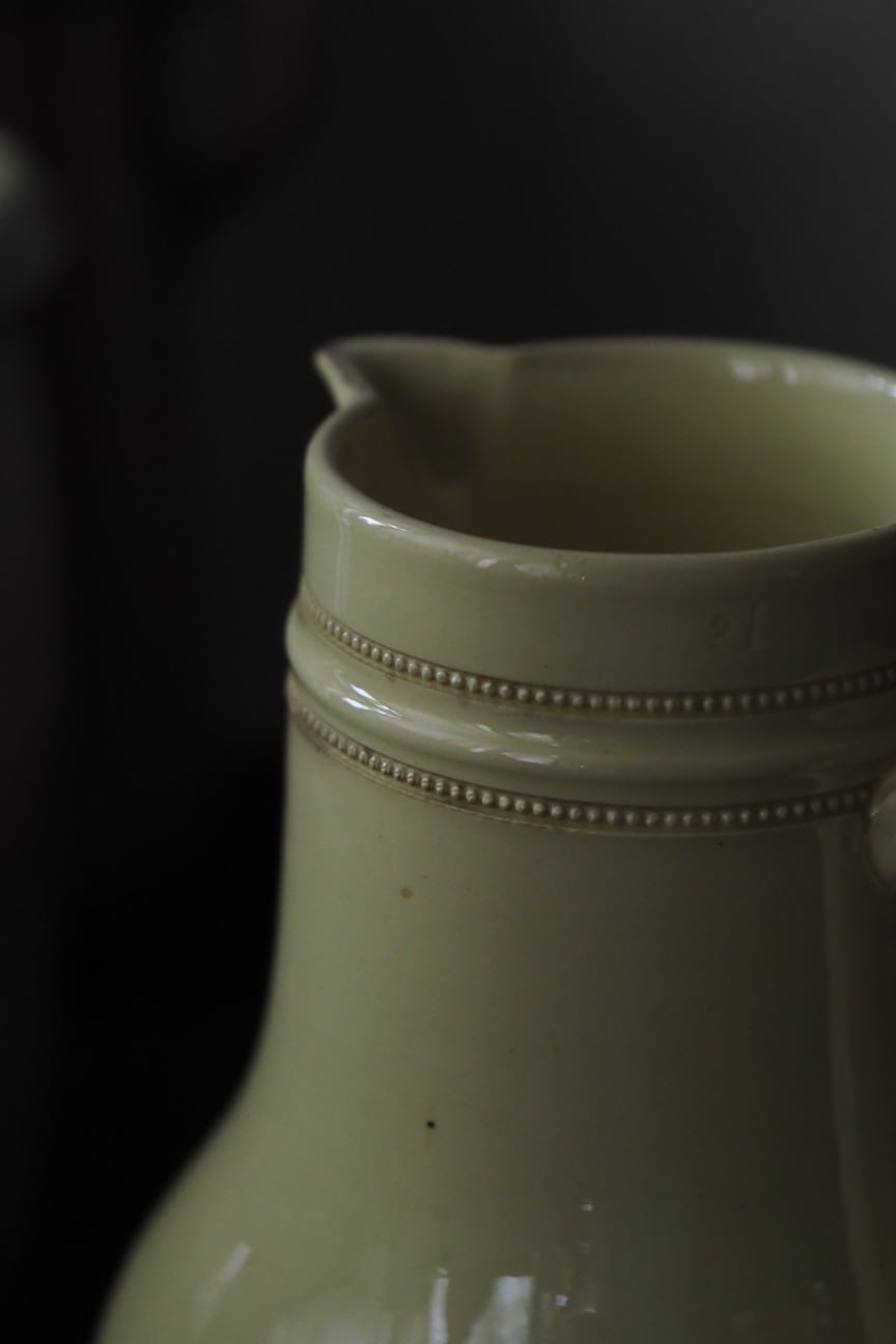 フォルム下に広がり重心低く、そこに真珠が繋がった様に粒々としたモチーフを区切りに高台が付いて優しい印象。