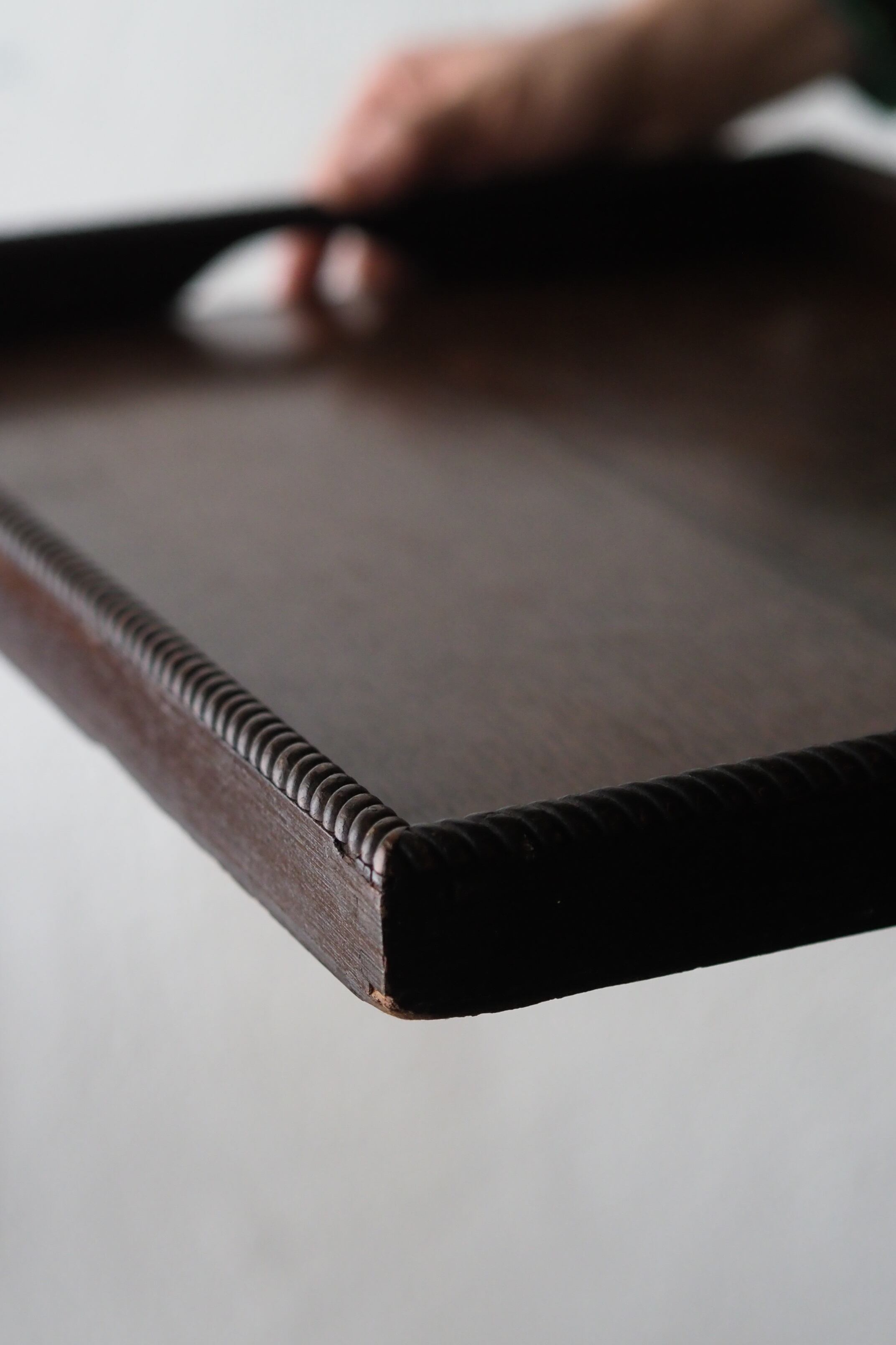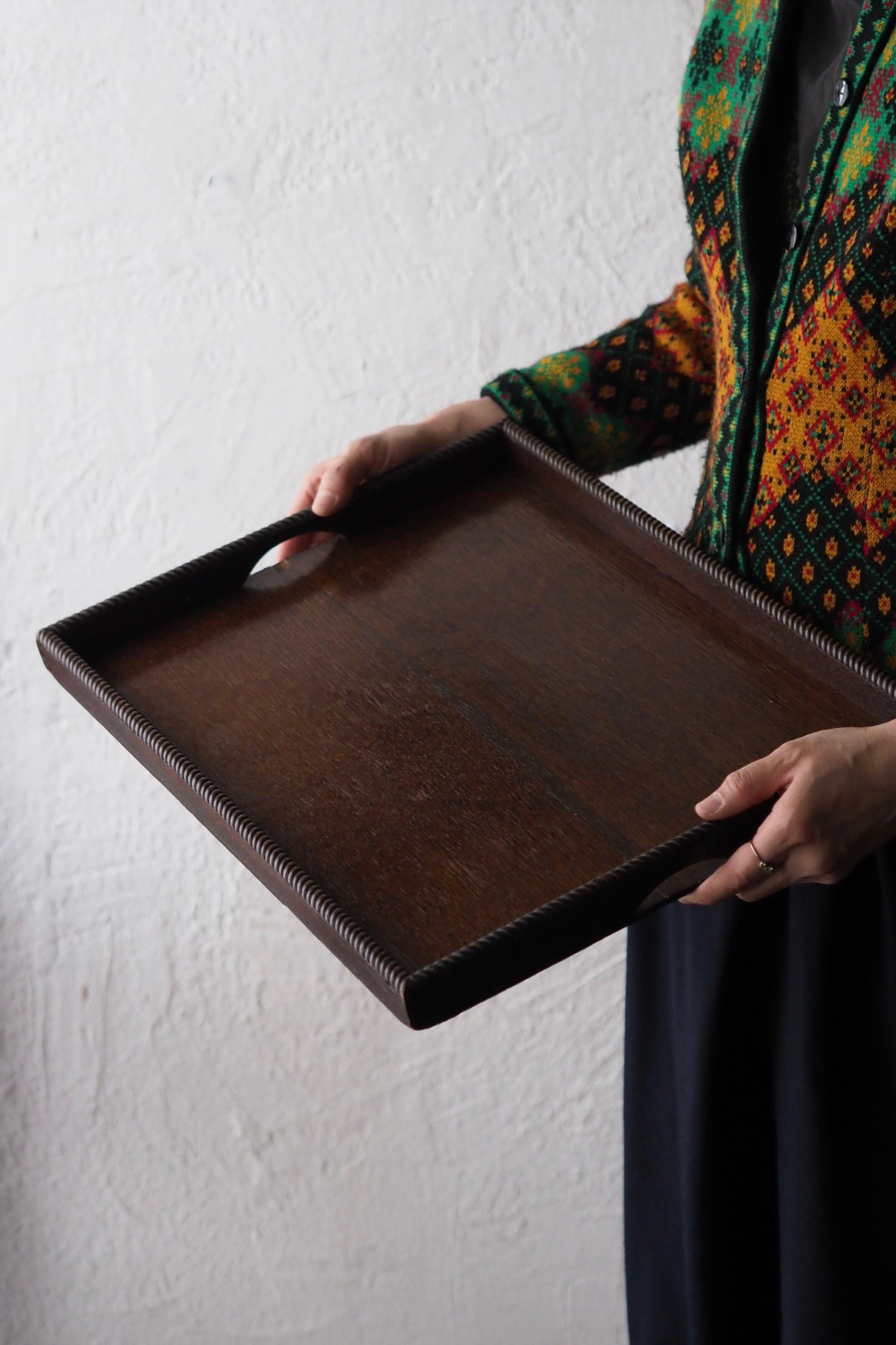 立ち上がっている縁には捻りの意匠が付いていて両手に馴染むオークのサービングトレイ。