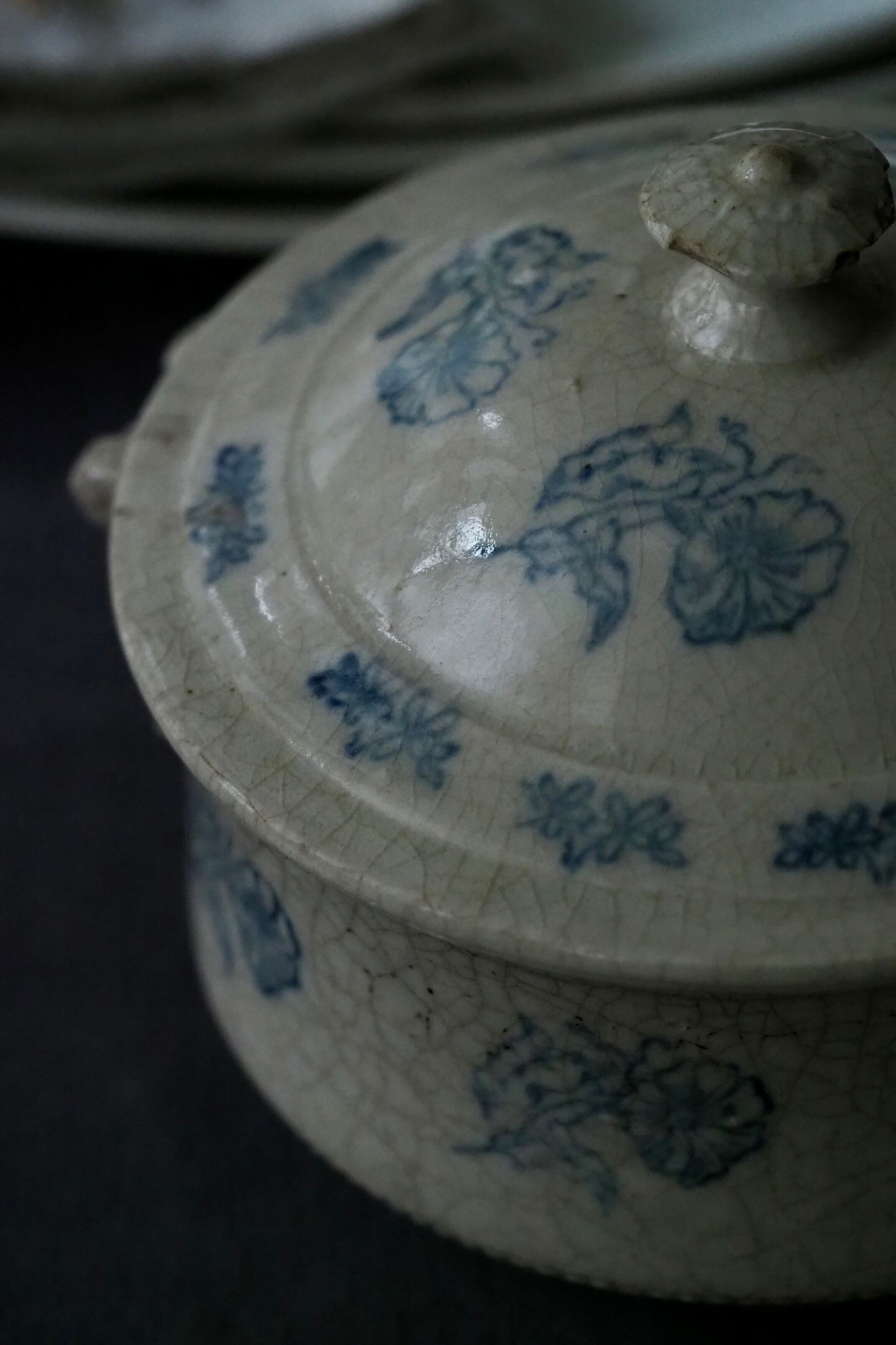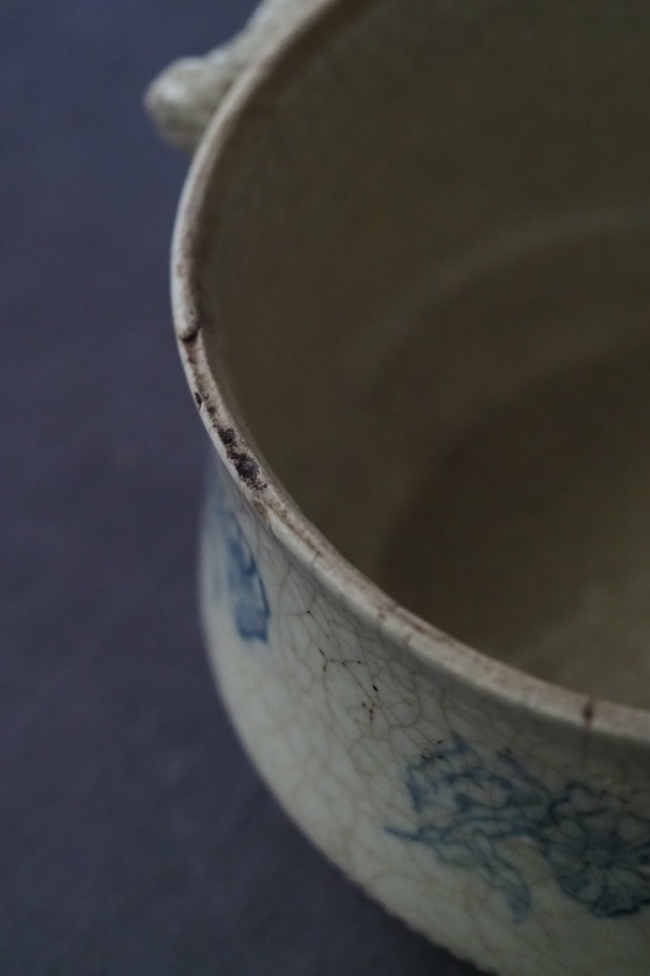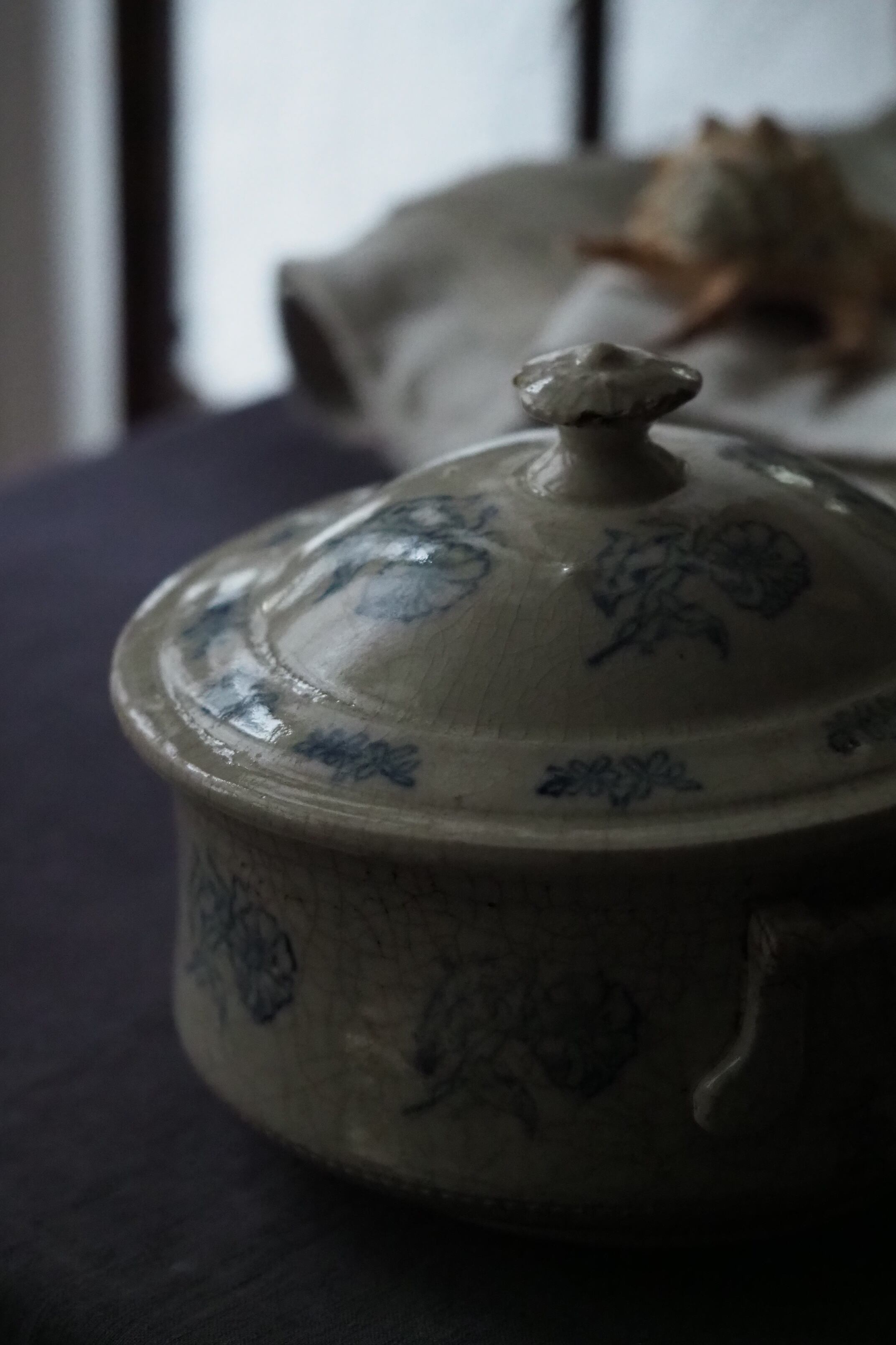 染み入る貫入の不規則な網目の中、朧げな青いお花が浮かぶスープサーバー。