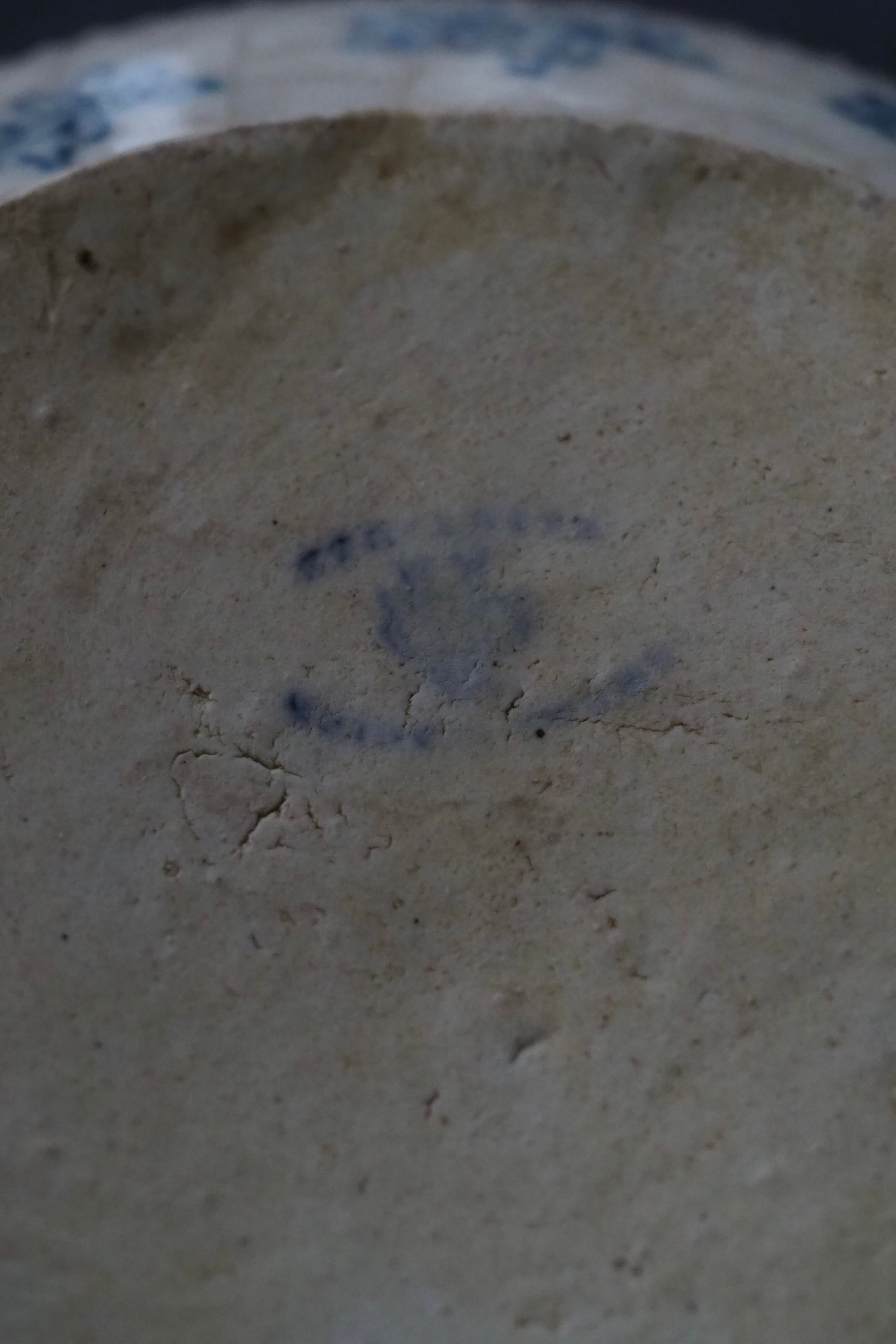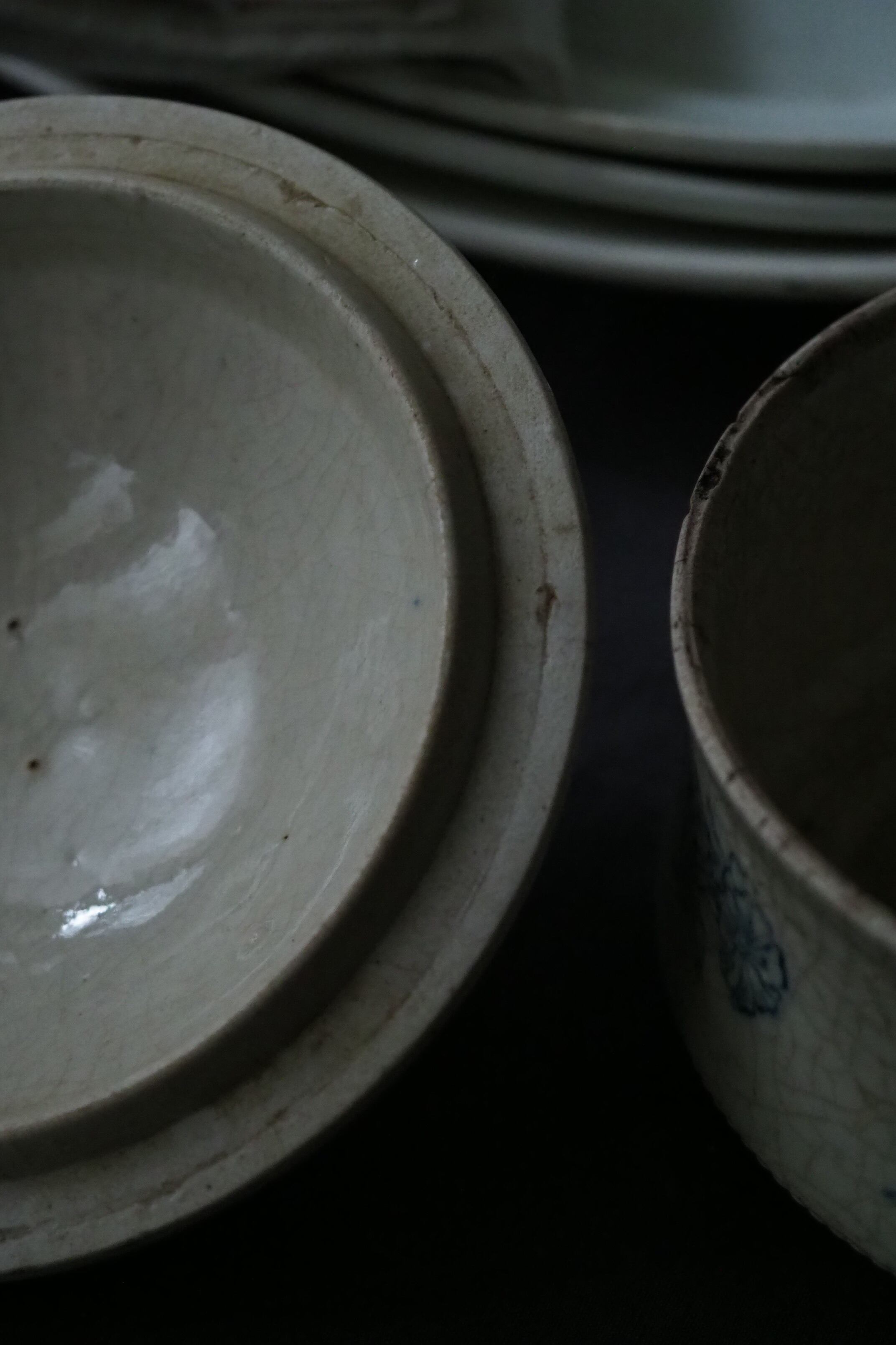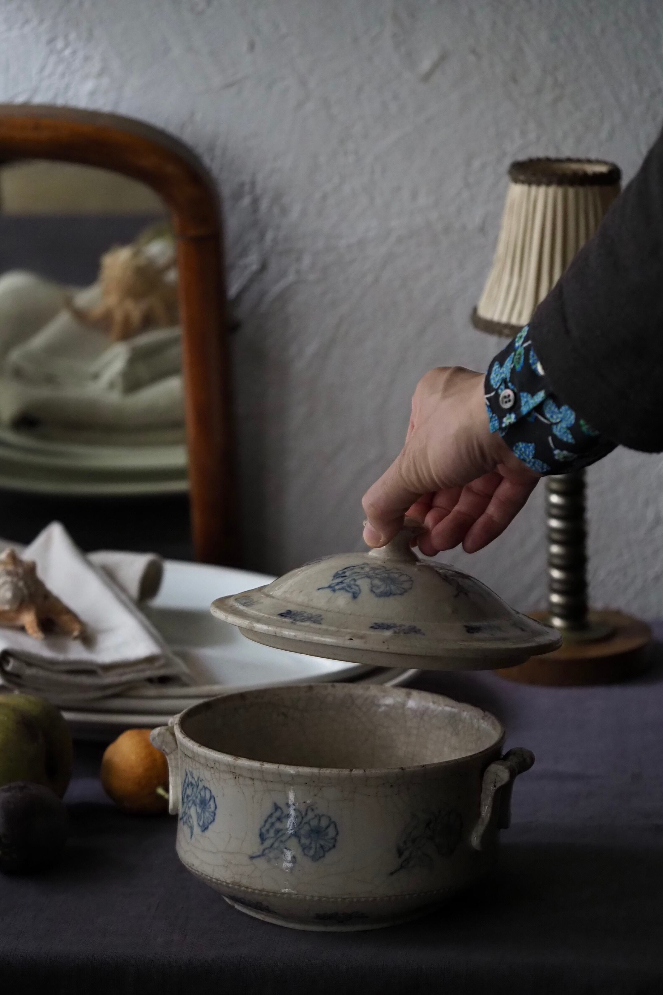 染み入る貫入の不規則な網目の中、朧げな青いお花が浮かぶスープサーバー。