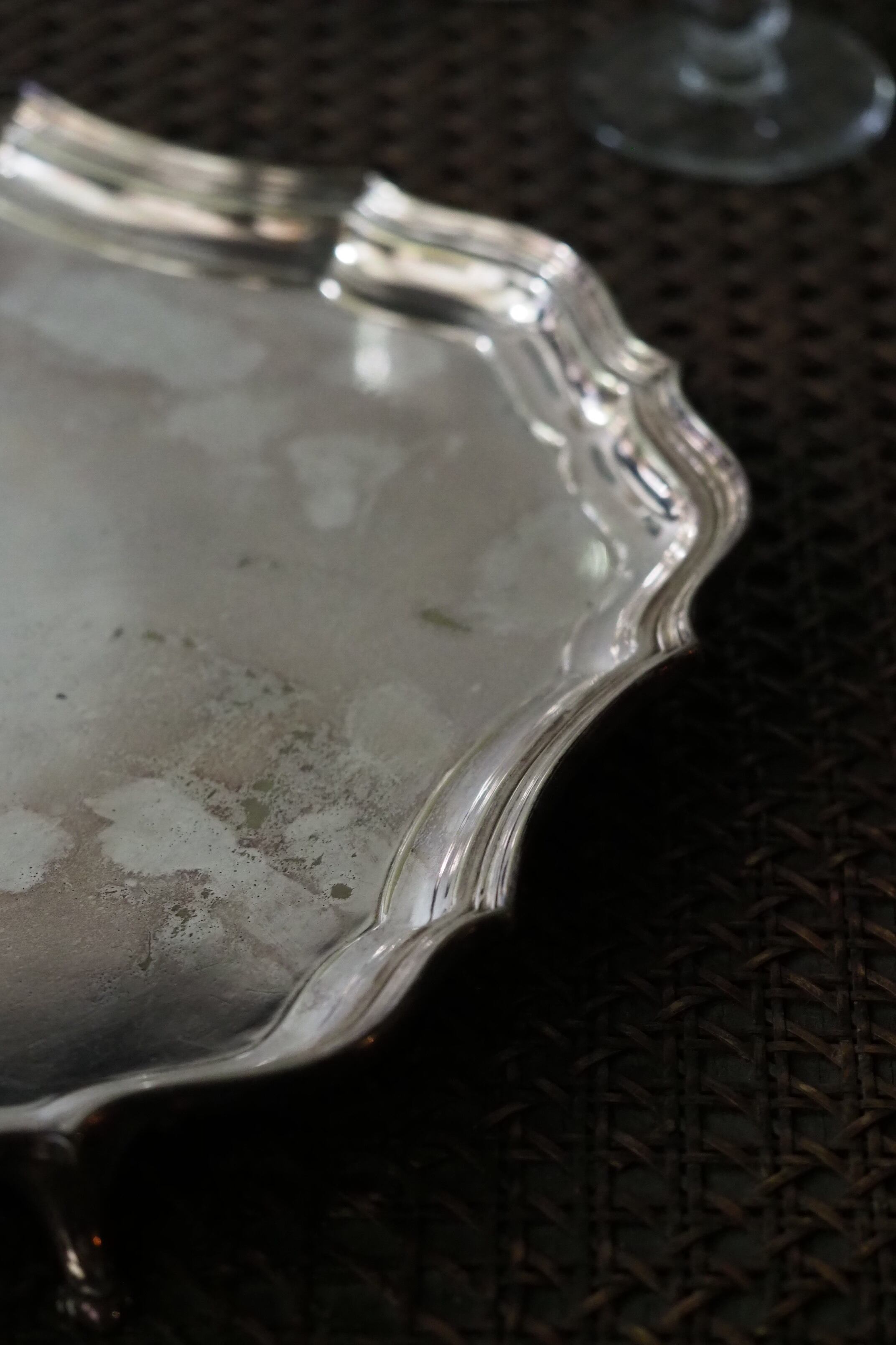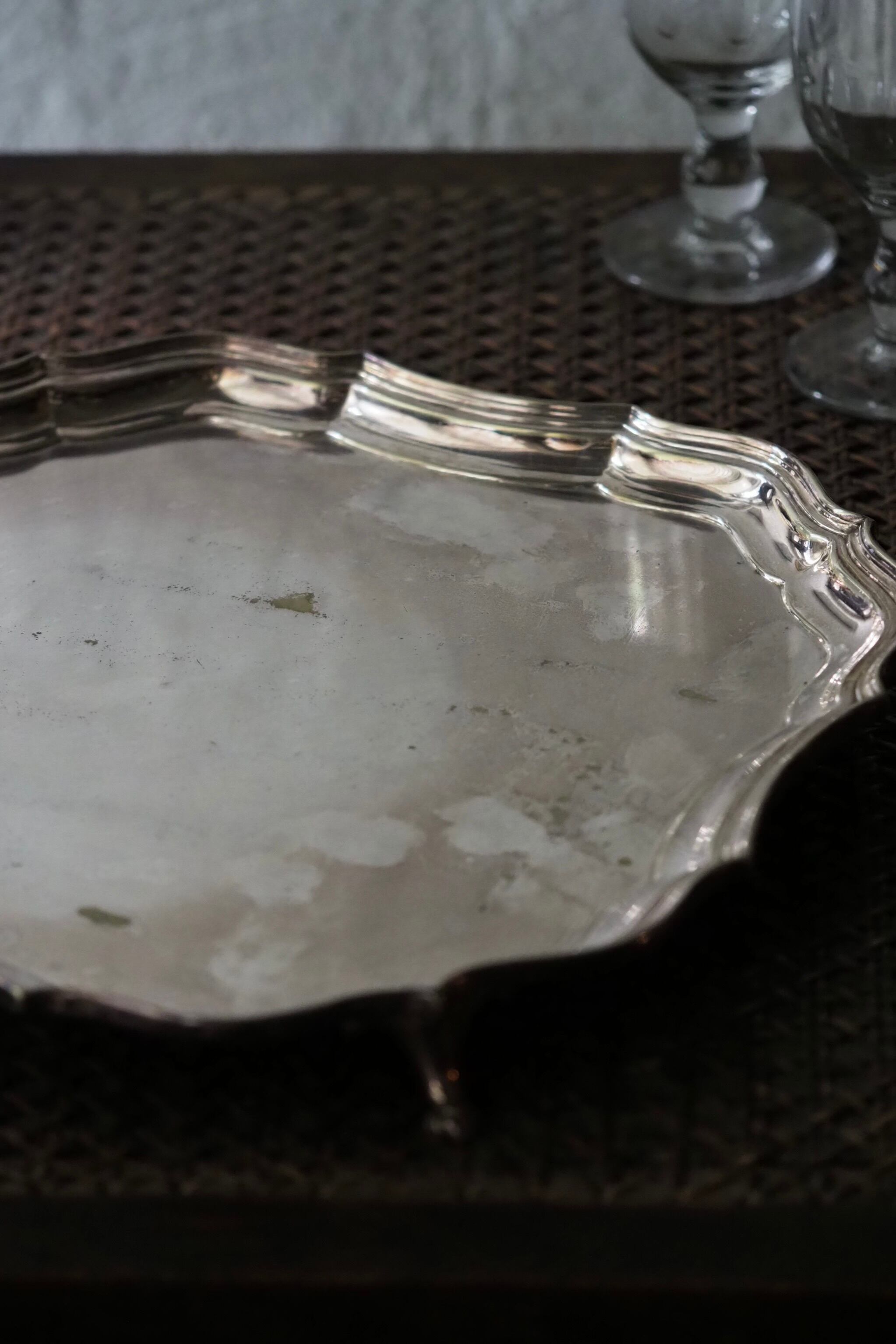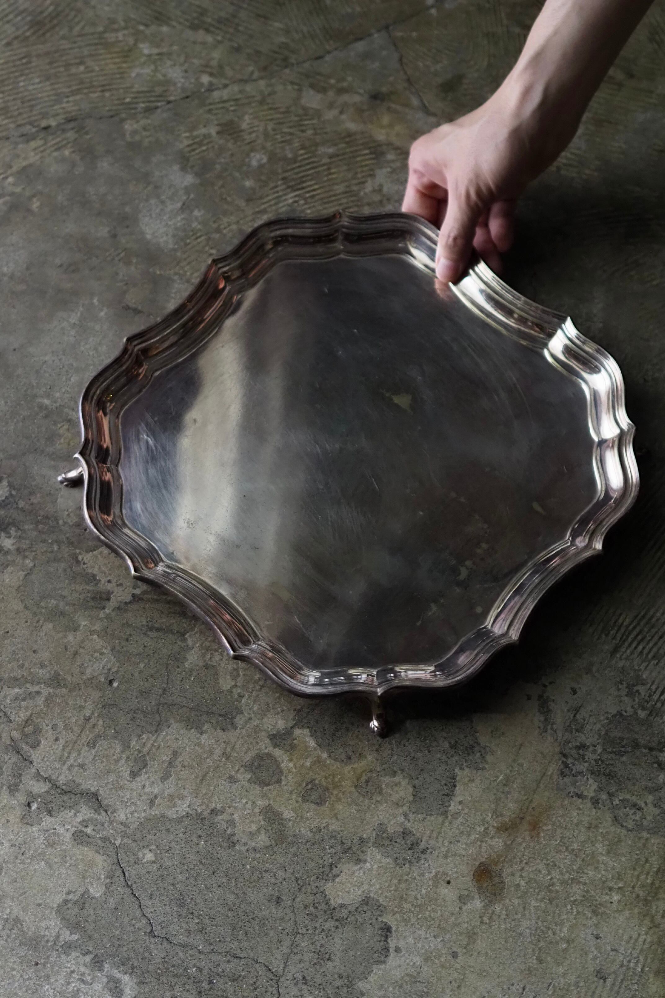 クラシカルなデザイン、縁が波打つパイクラストになっている足付きのトレイ。