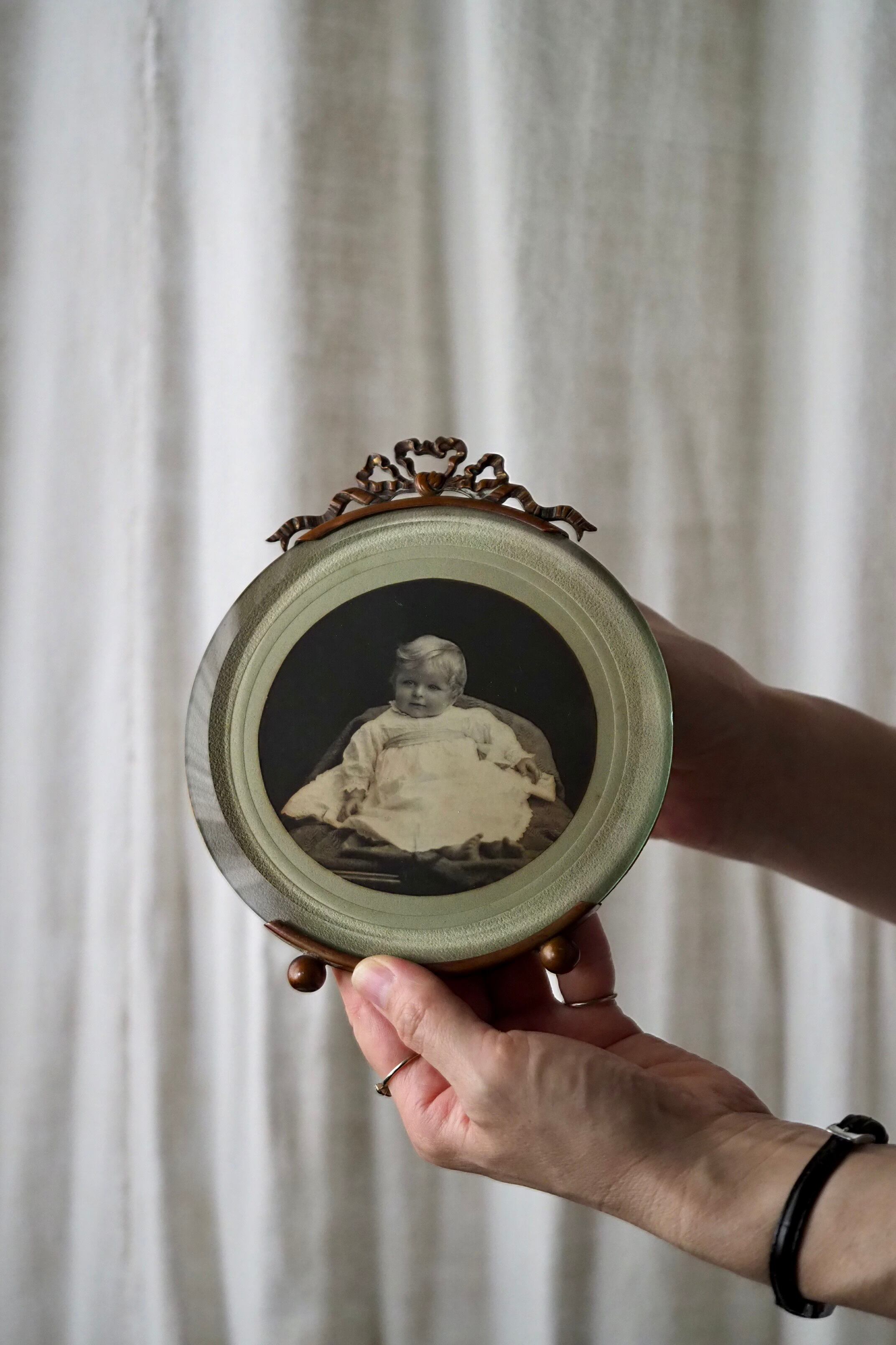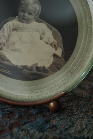 縁にカットが入った丸いガラスのスタンドフレーム。