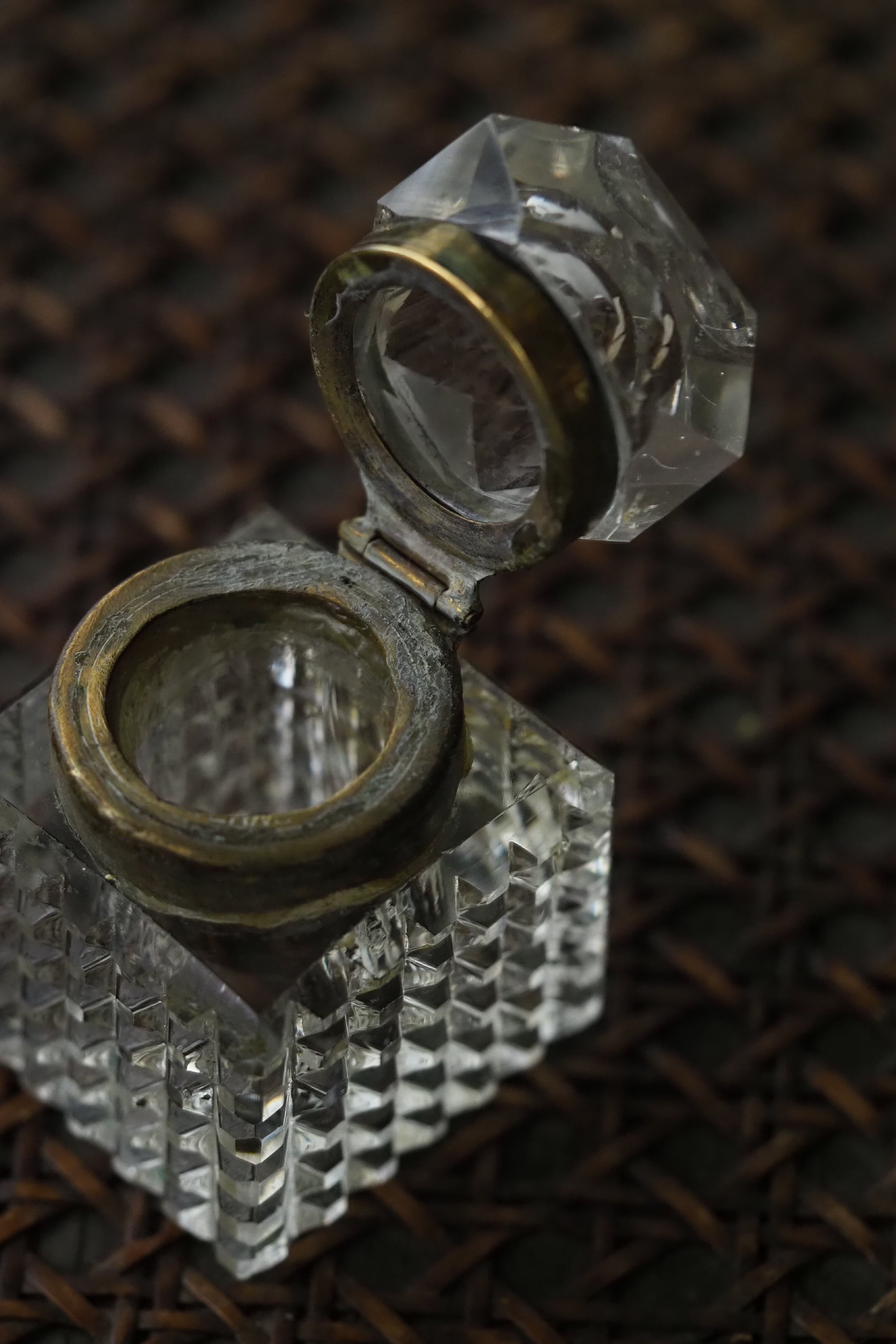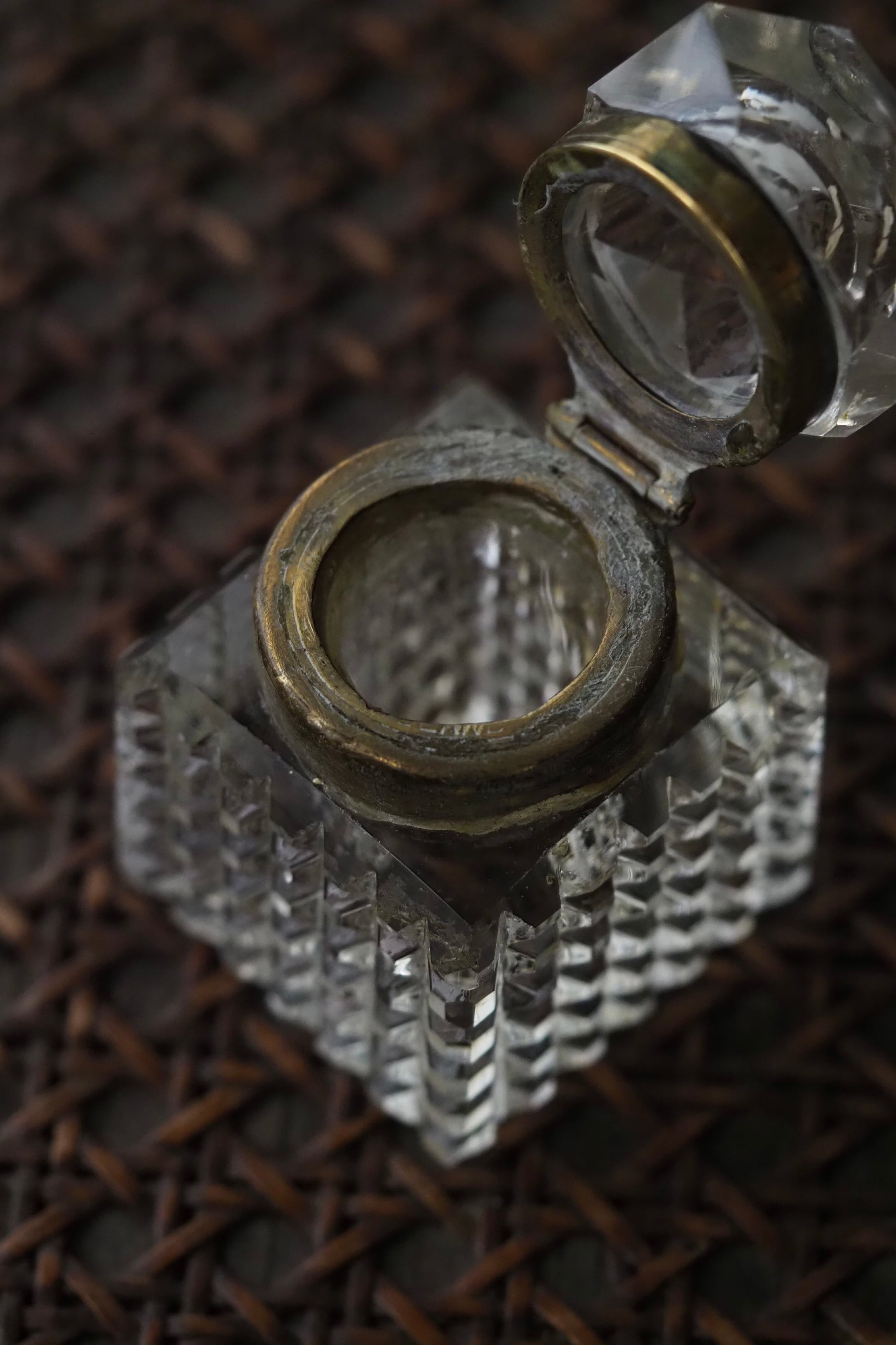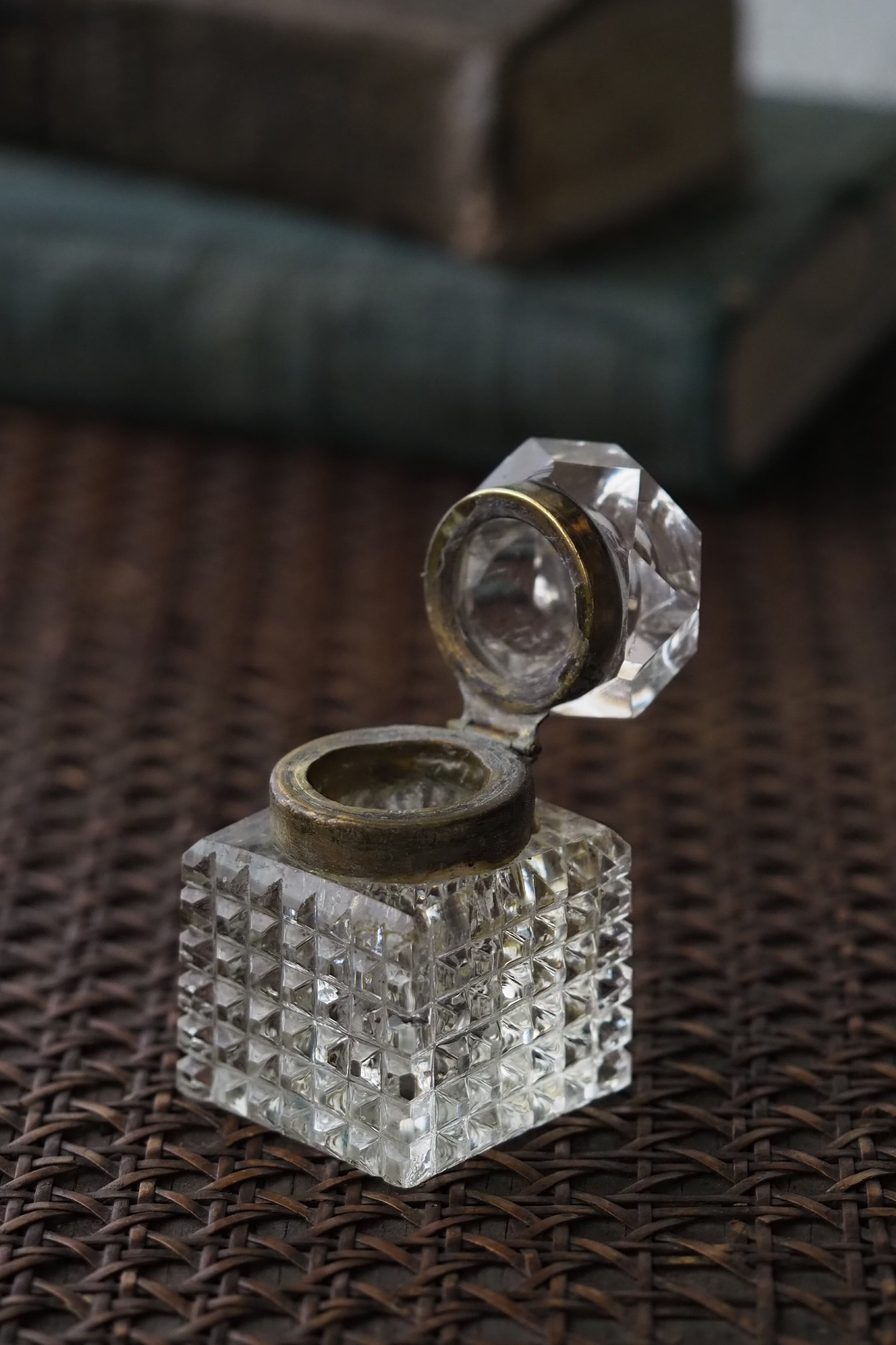 洒落たブロック状のカットガラスが四方にあしらわれているインク壺。