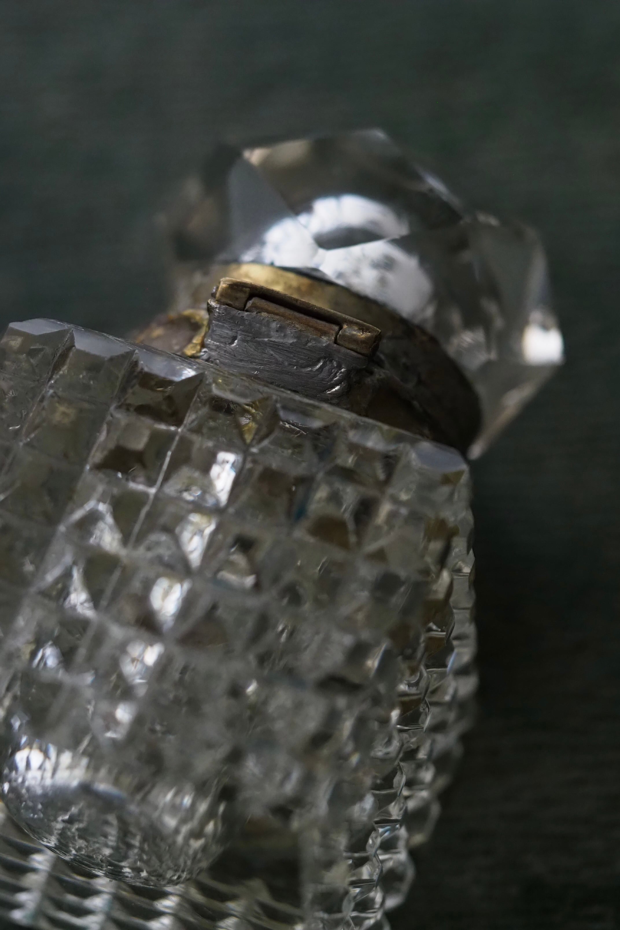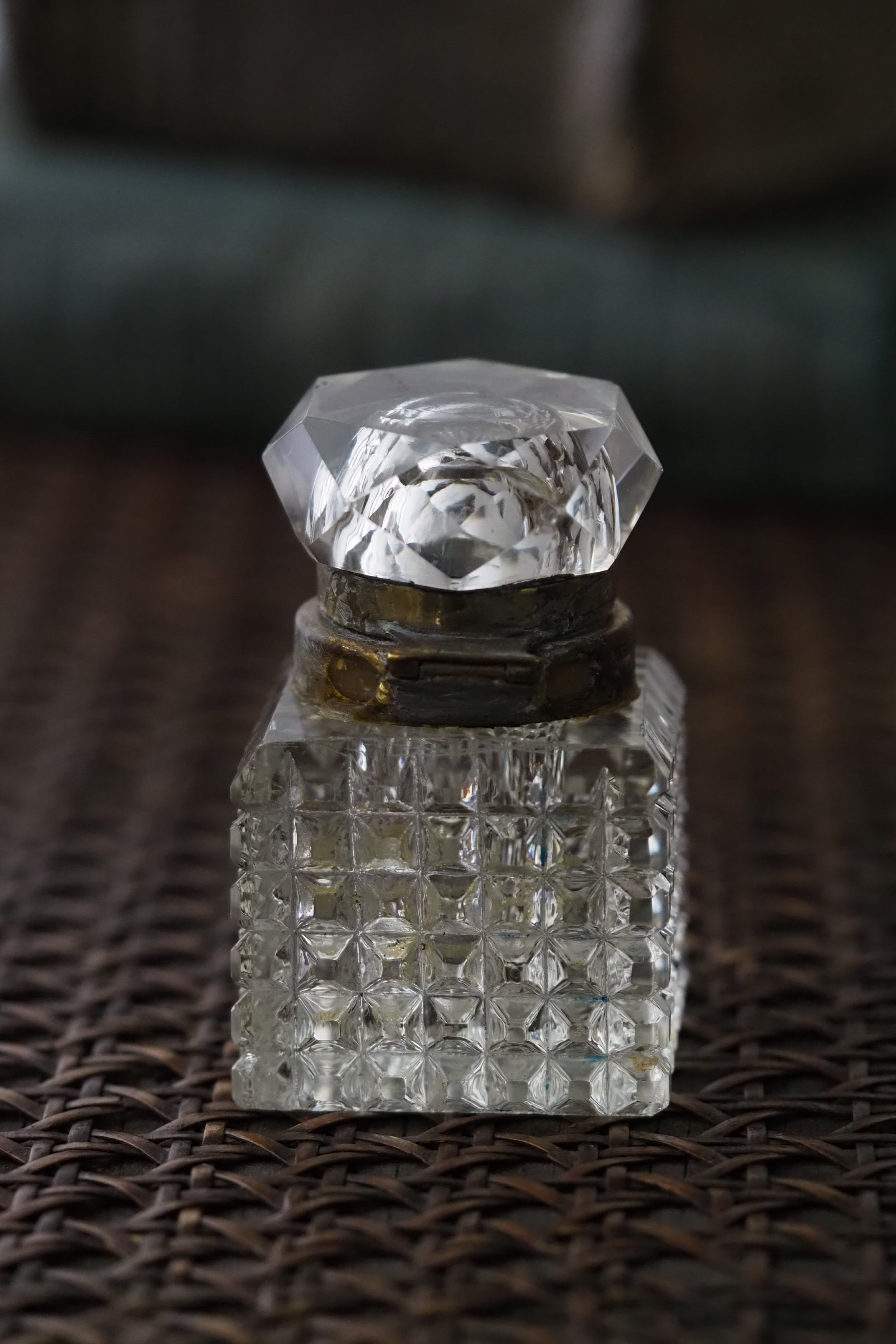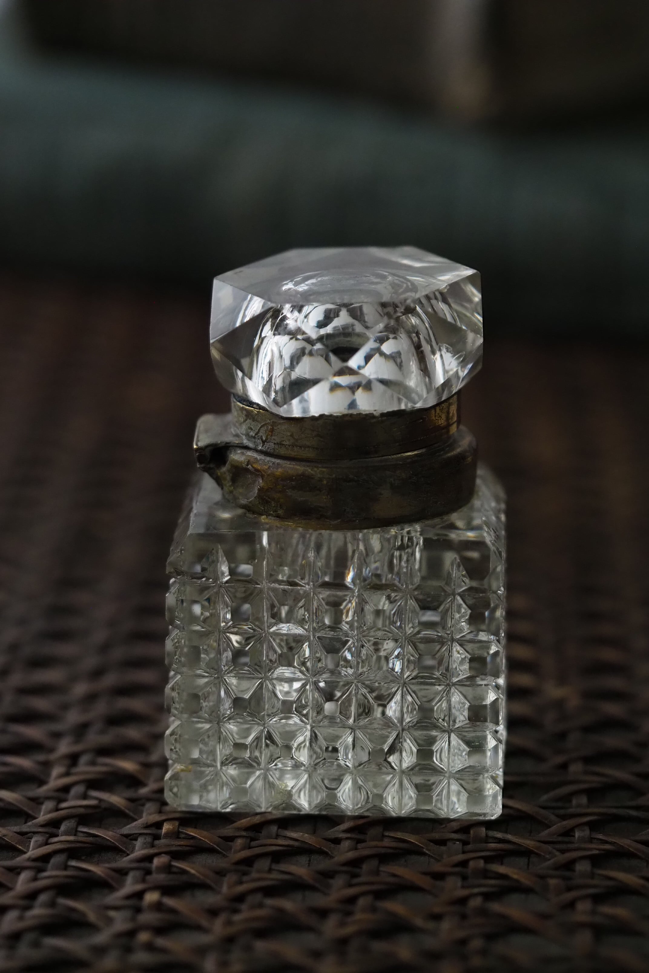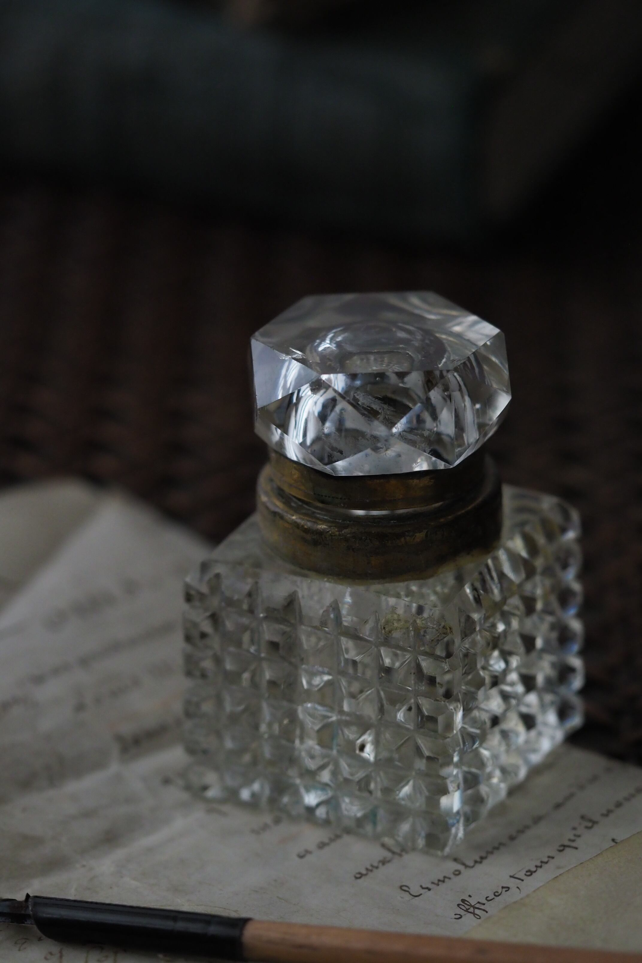 洒落たブロック状のカットガラスが四方にあしらわれているインク壺。
