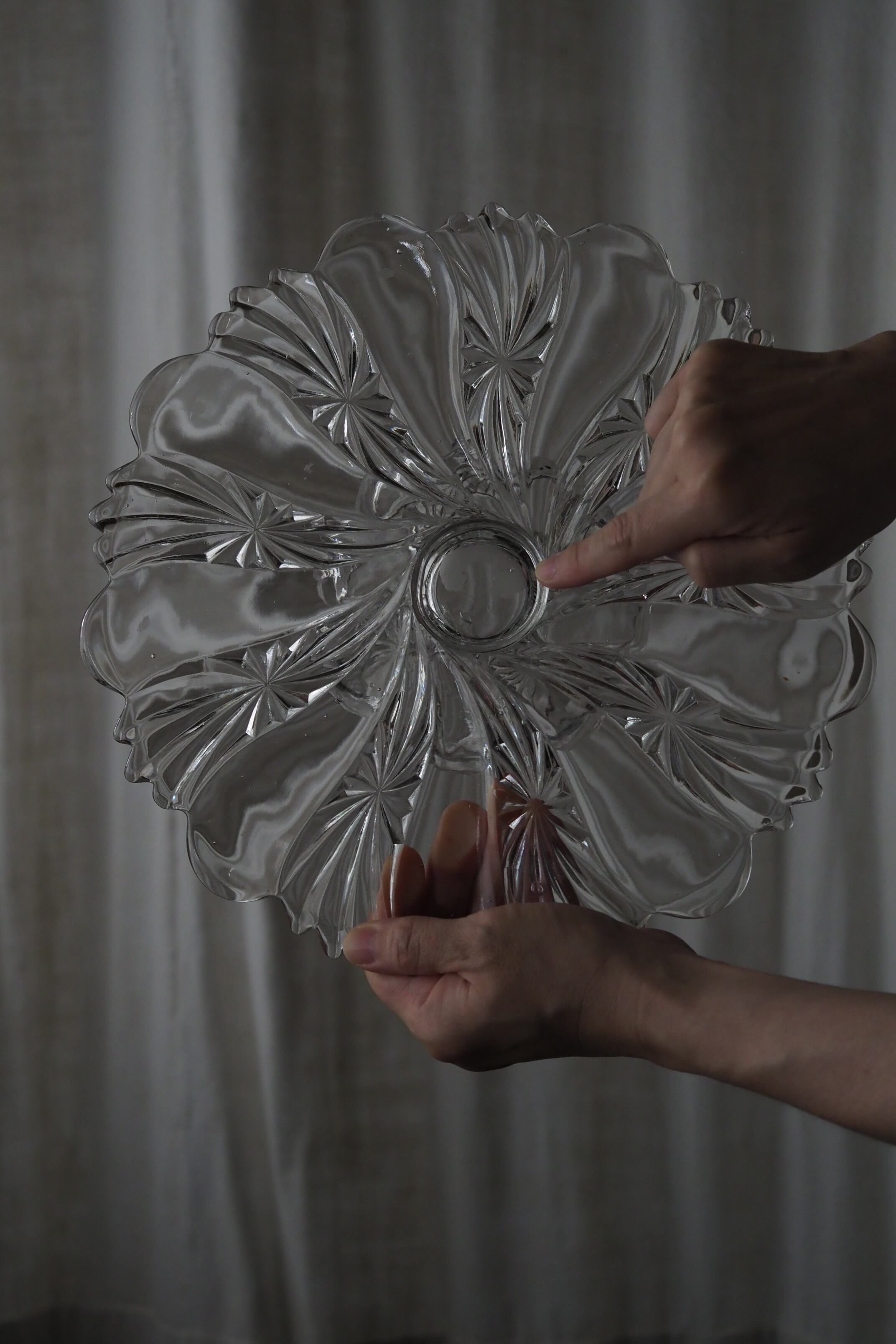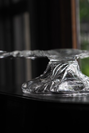 エレガントなデザイン、中心から放射線状に伸びるカットがあしらわれた低めなガラスコンポート。