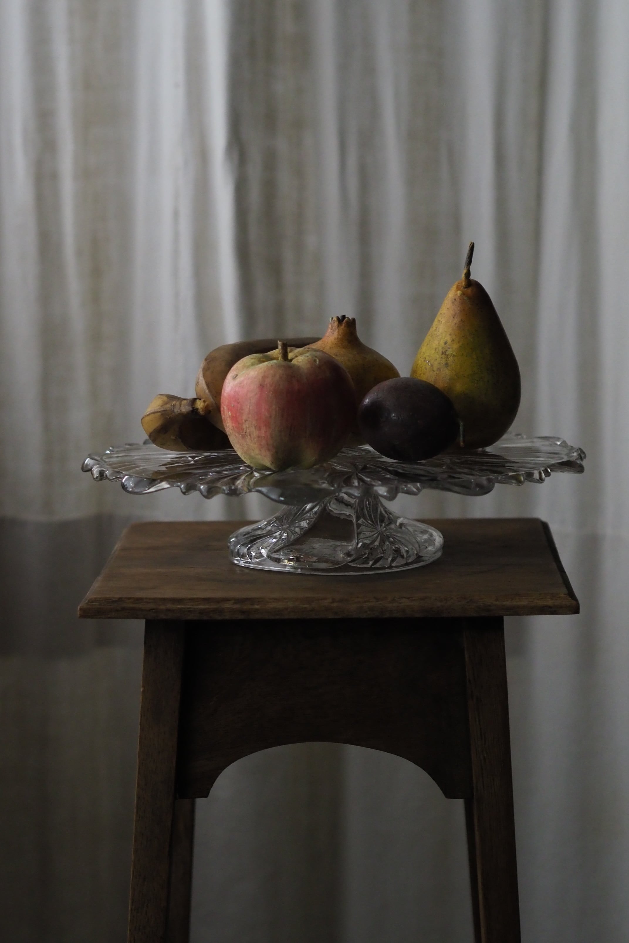 ひらひらとした縁などのカットモチーフが受ける光の強弱、フルーツやお菓子、多様なものを飾って。