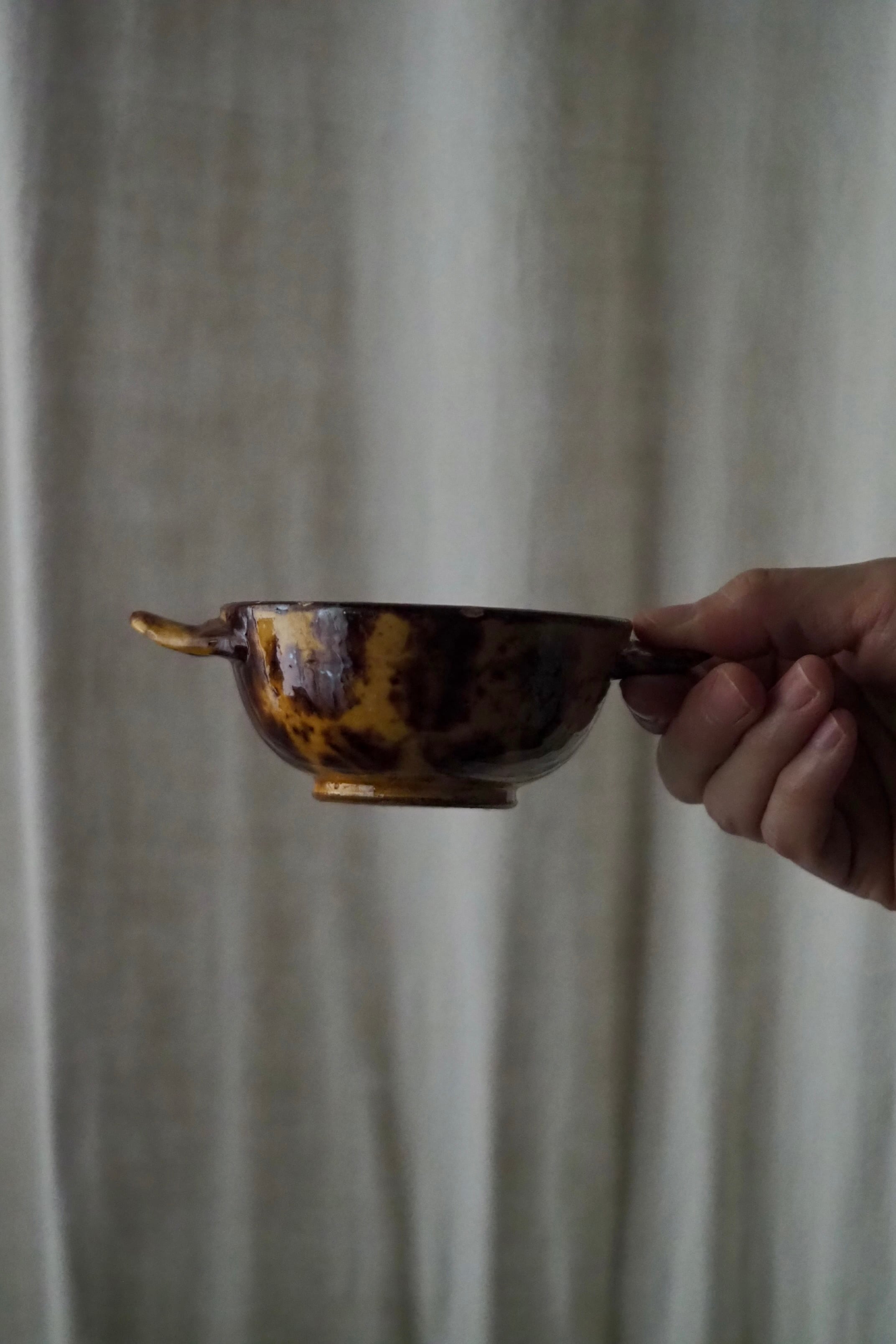 南仏の滲む釉薬が掛かったスープカップ、小さめなサイズで食卓の調味料入れにも良さそう。