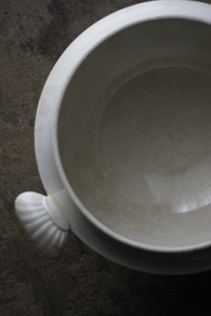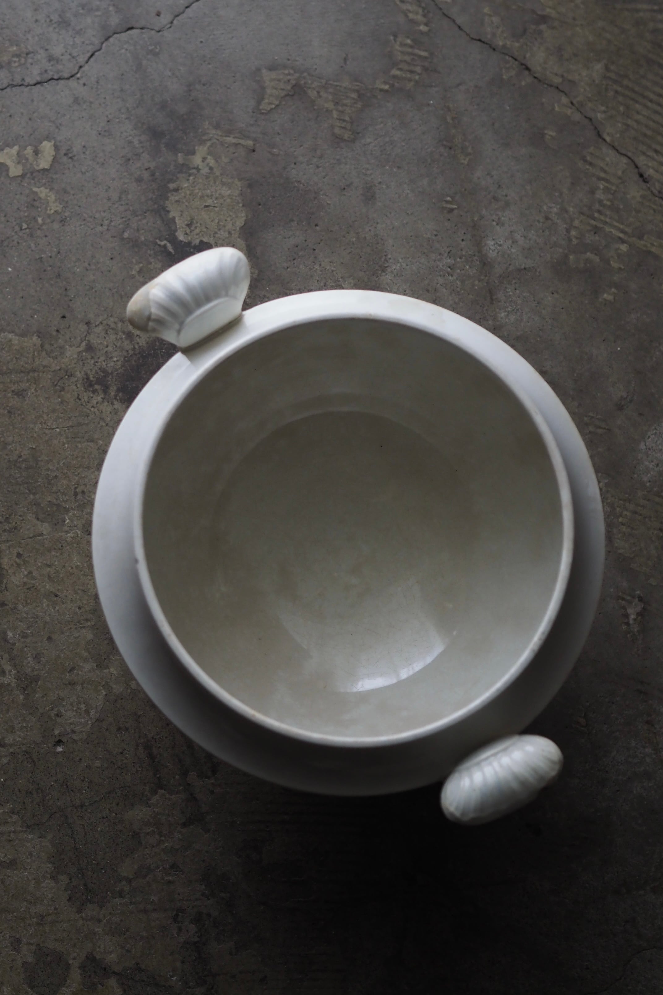 シェル型の持ち手、摘みには植物の文様浮き出ていてエレガントなフォルム。白一色の陶器チュリーン。