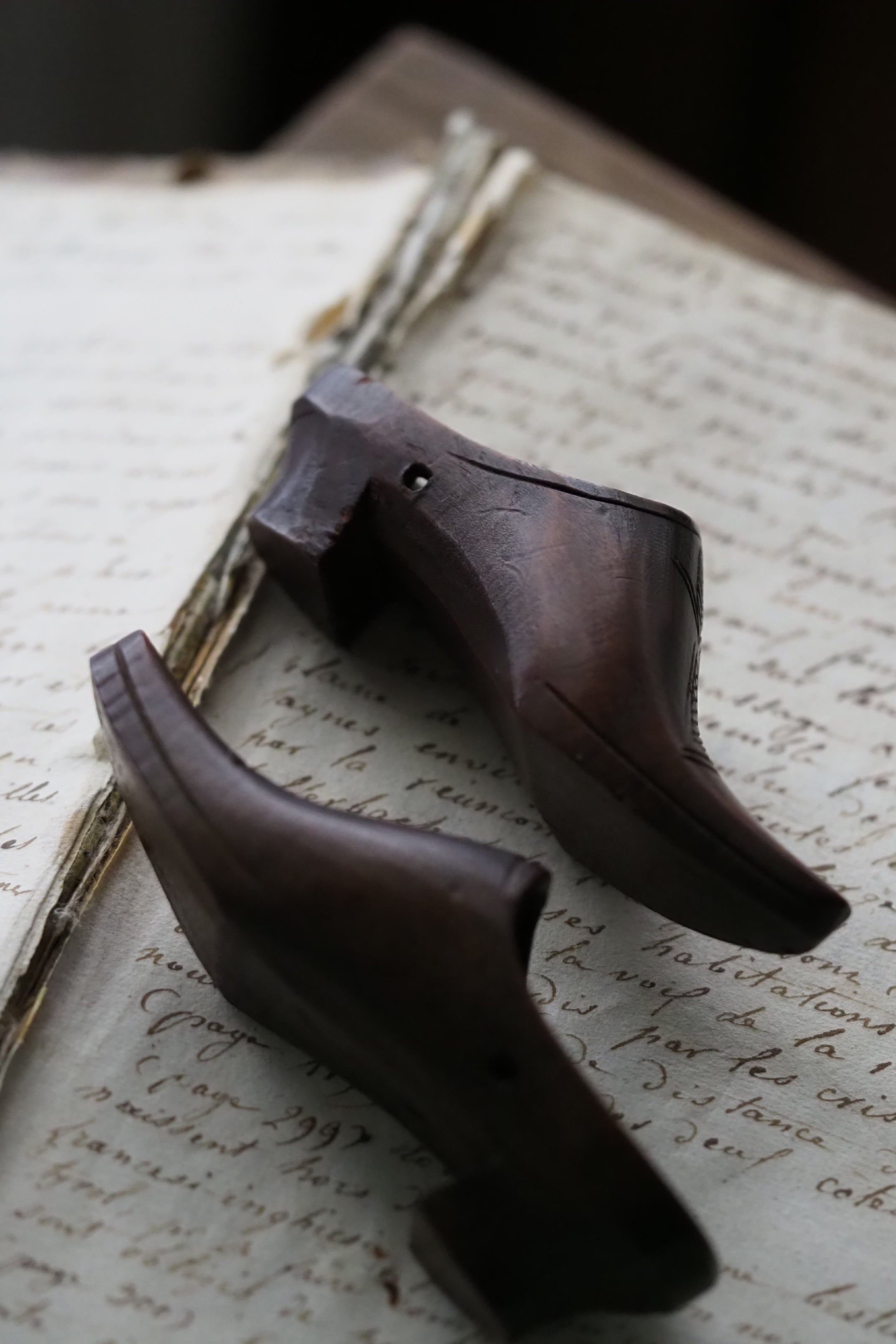 甲にすっと伸びた彫り文様があしらわれている小さな木靴。