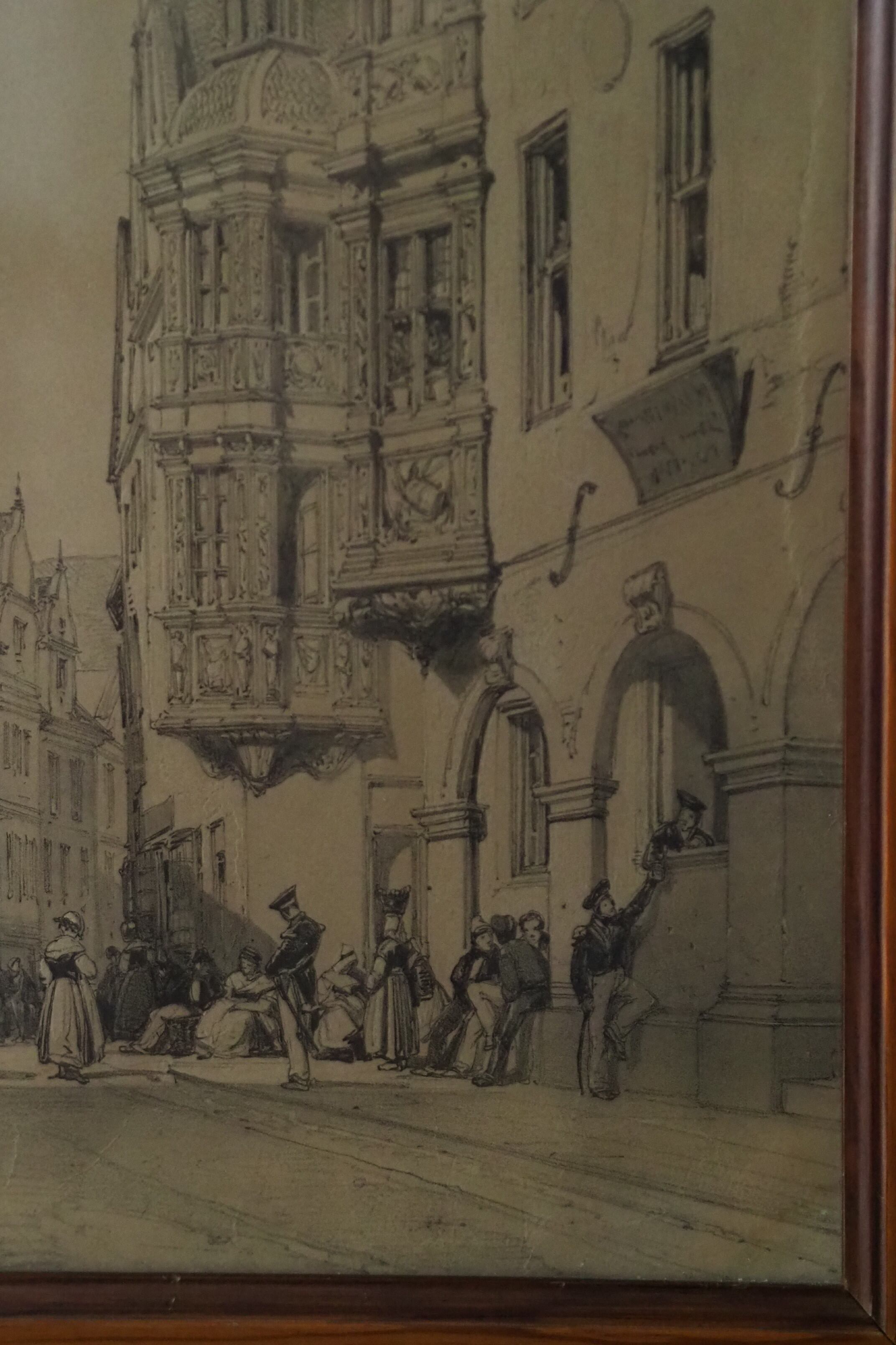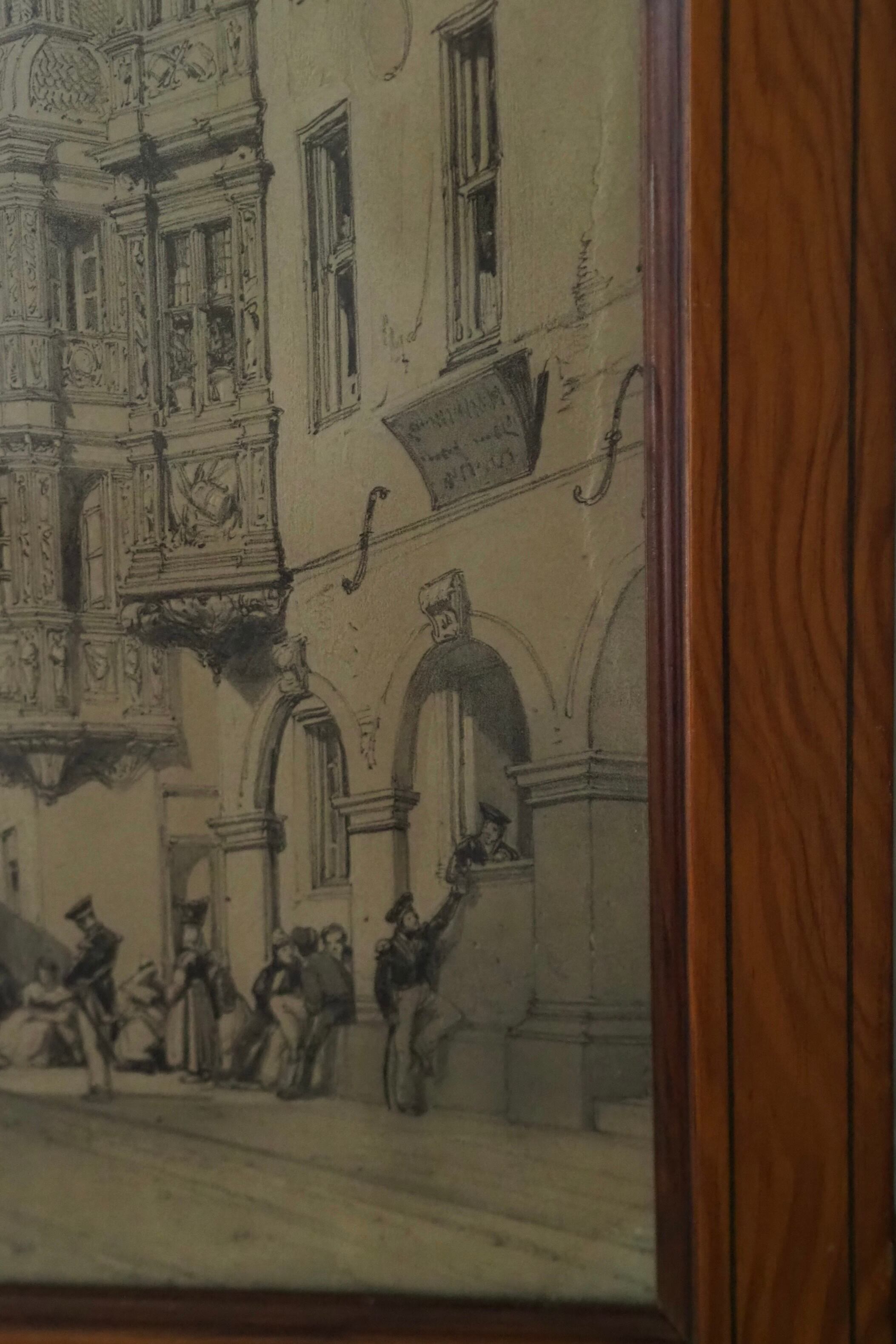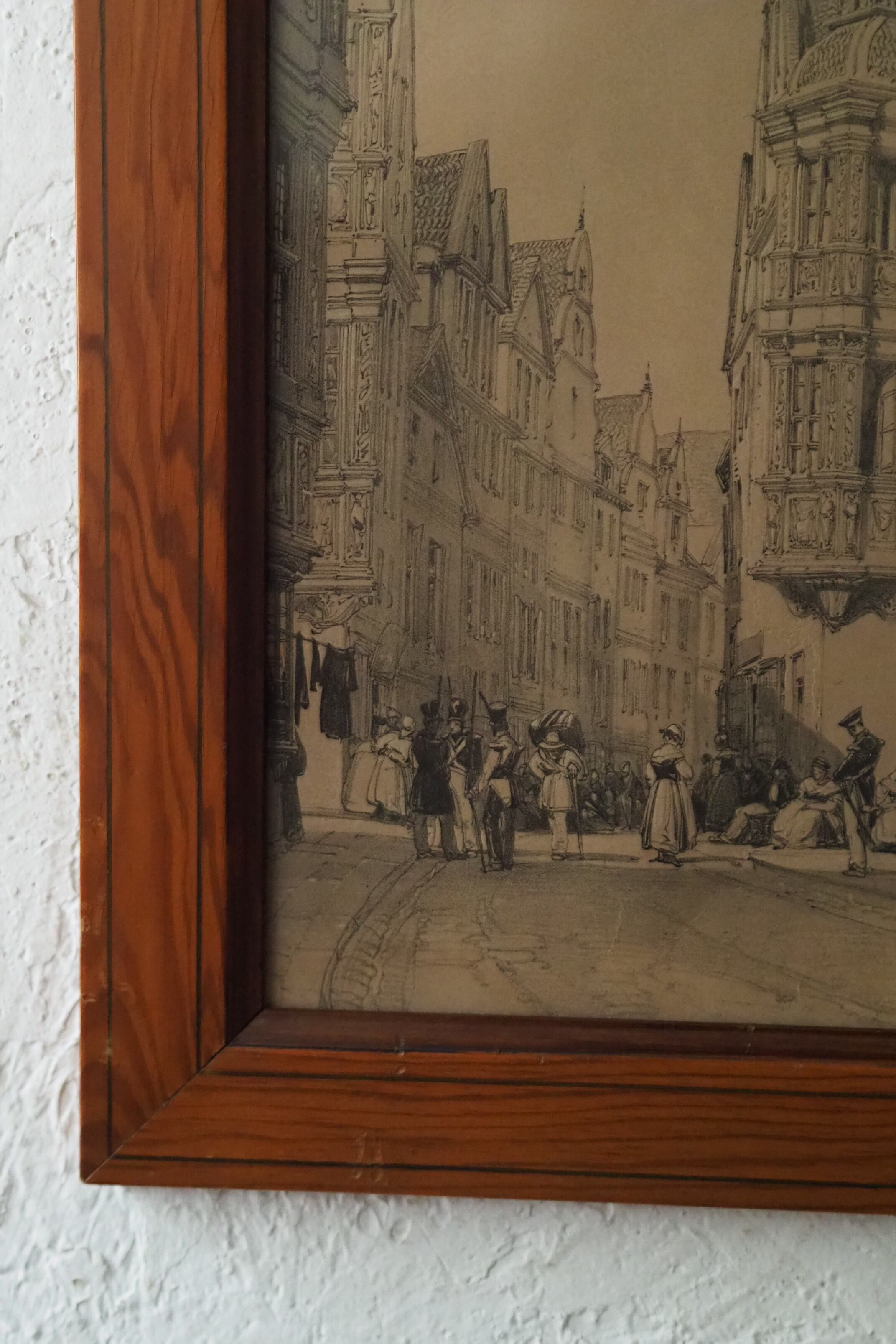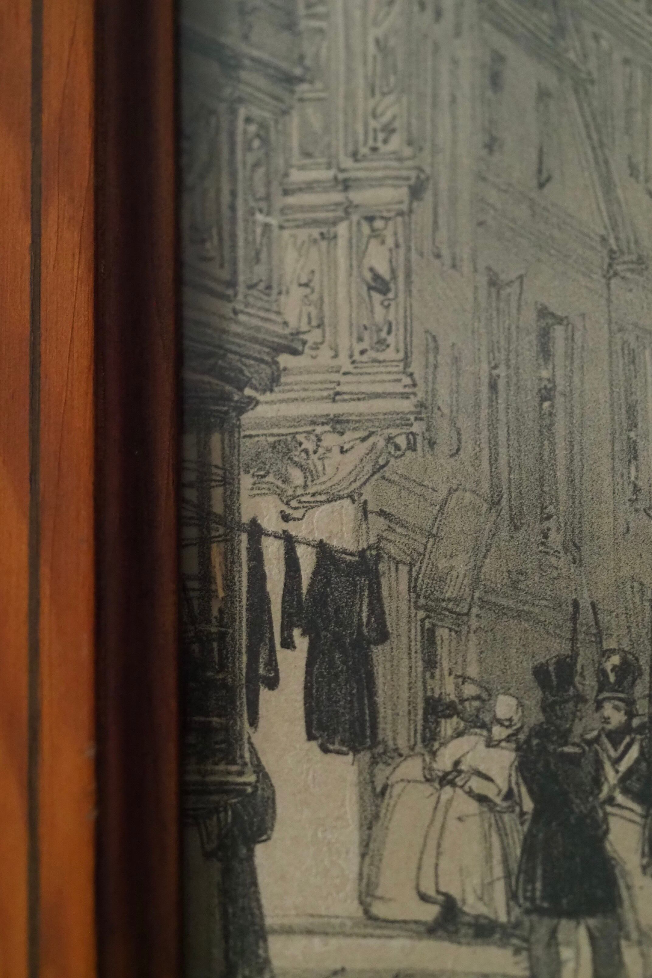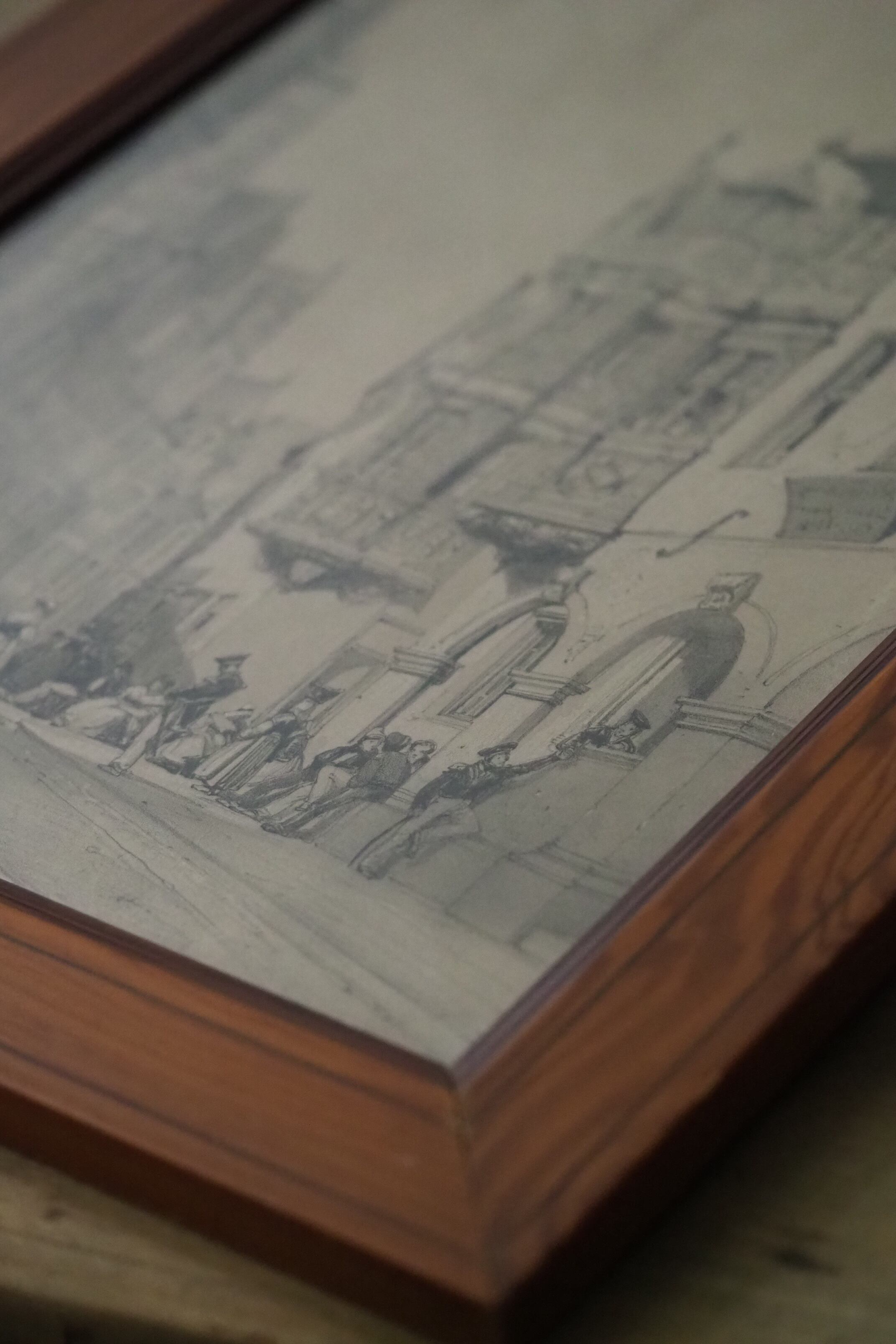 賑やかなフランスの街角を鉛筆で描いた額縁。