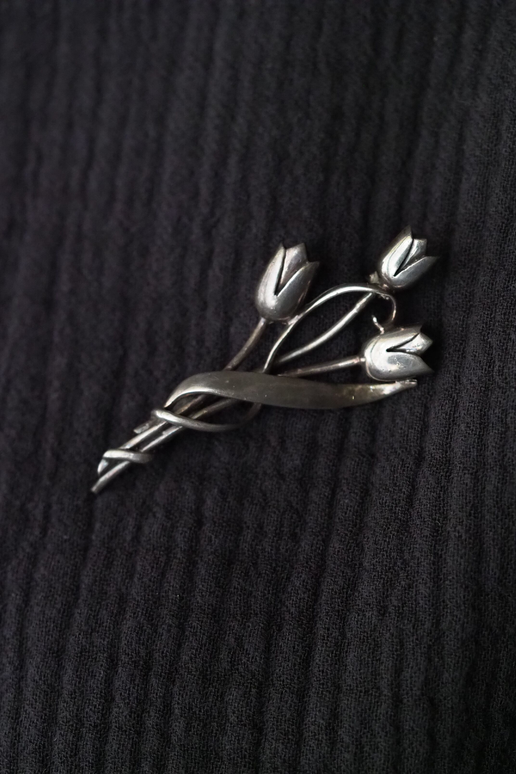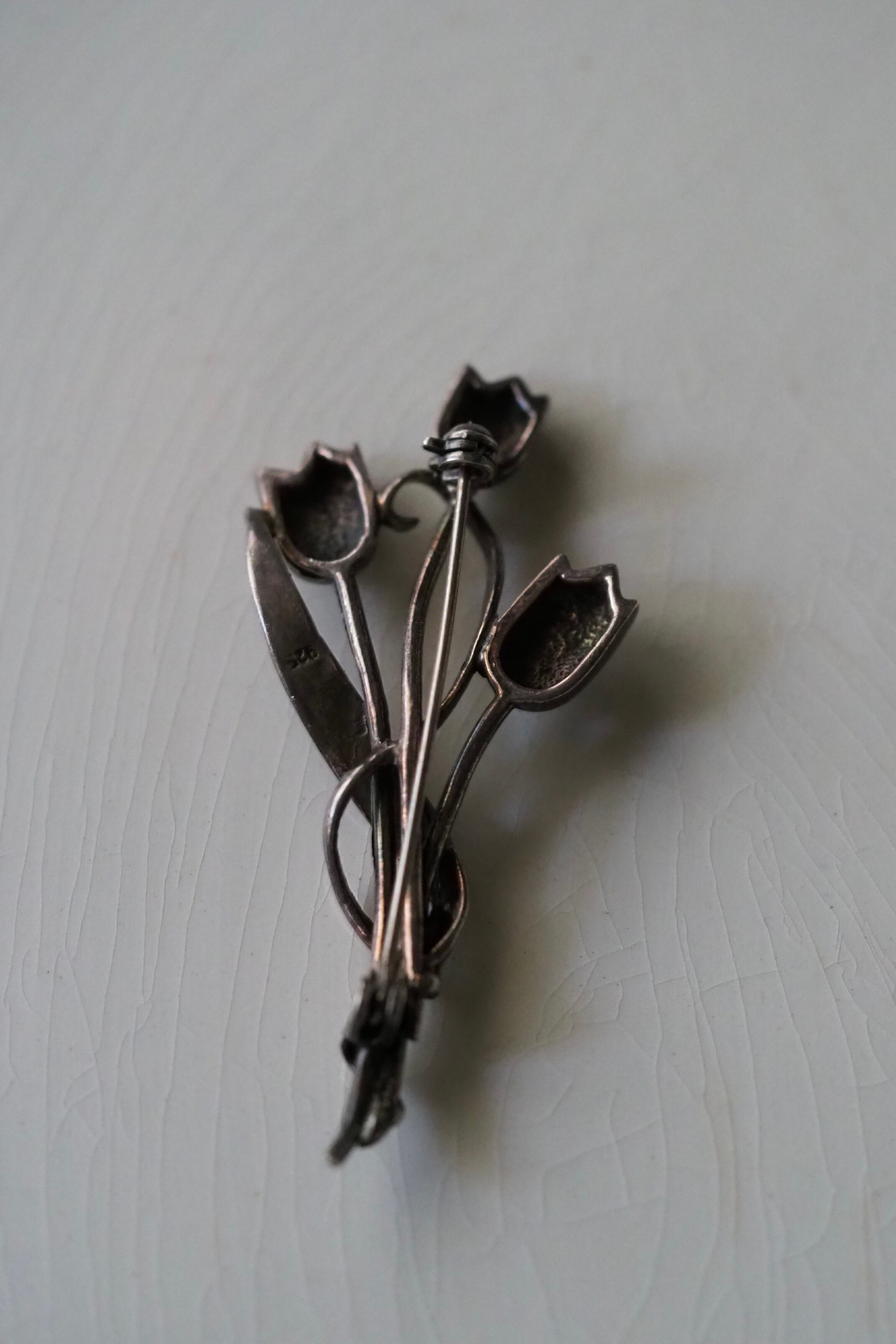 明るいイメージの3本のチューリップ、シルバー925のブローチ。