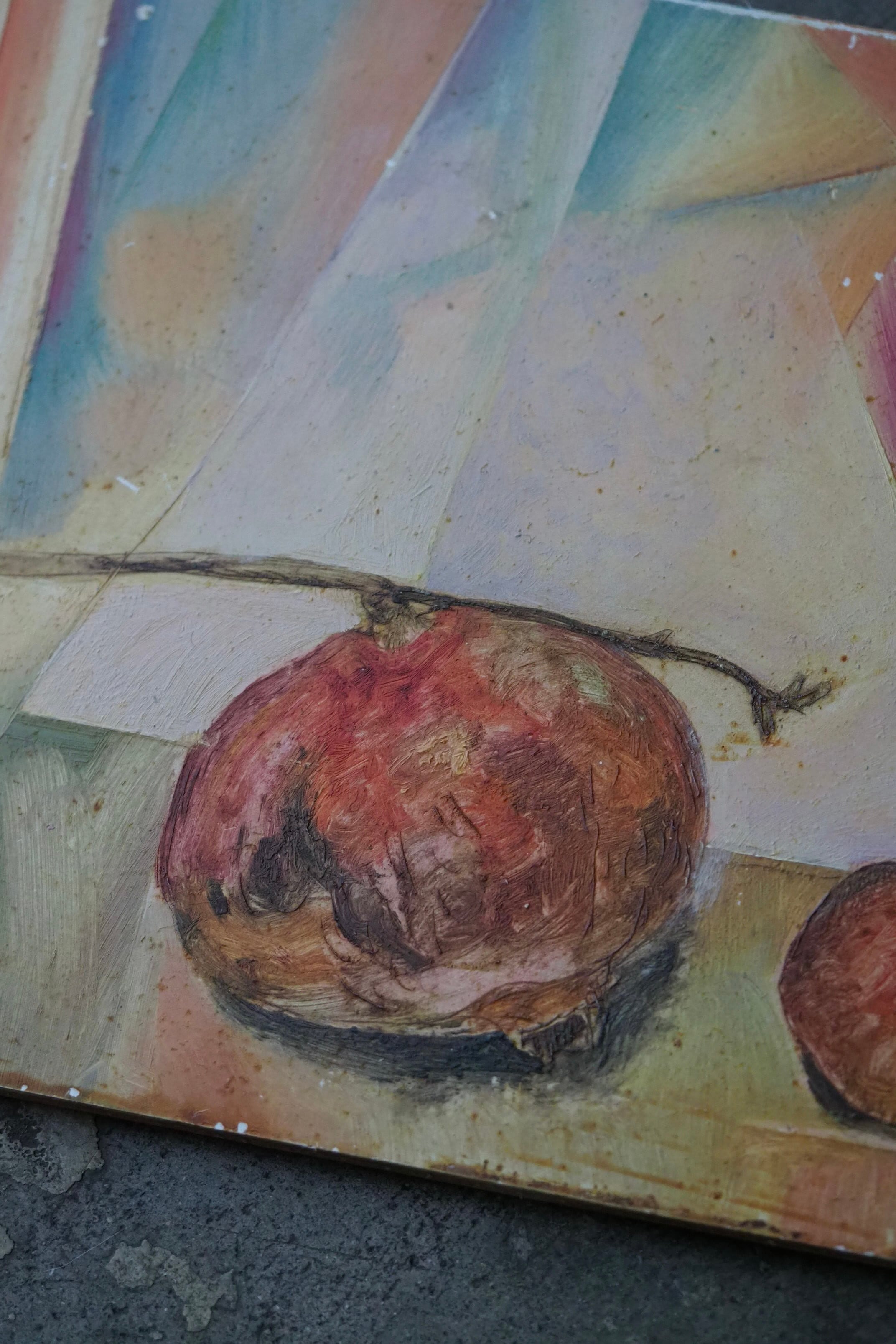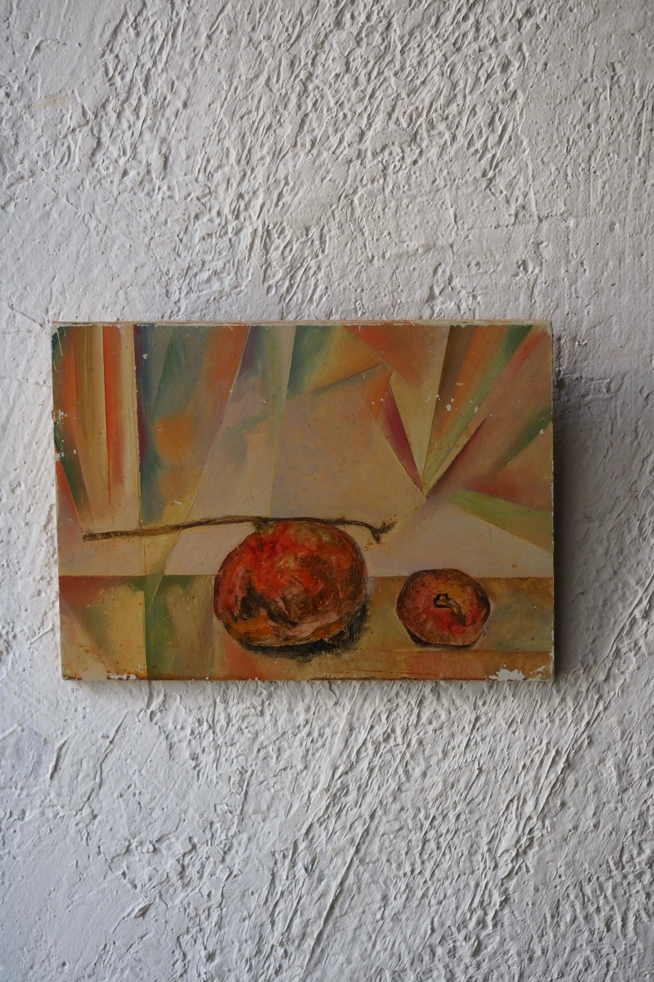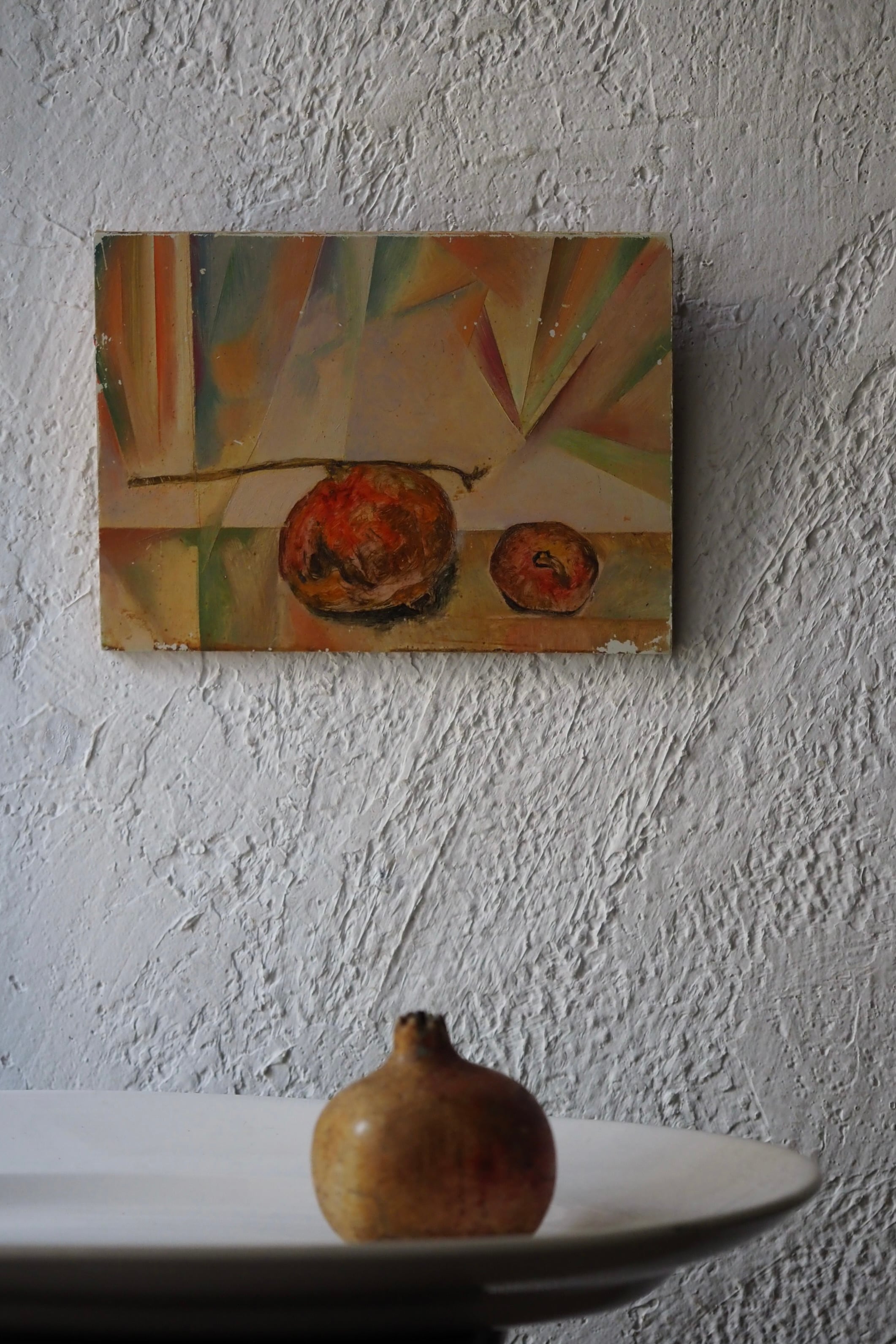 反面、メインの柘榴2つは質感と色付けを細かく描いている写実な表現方法。