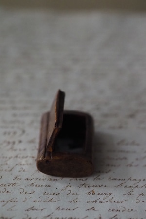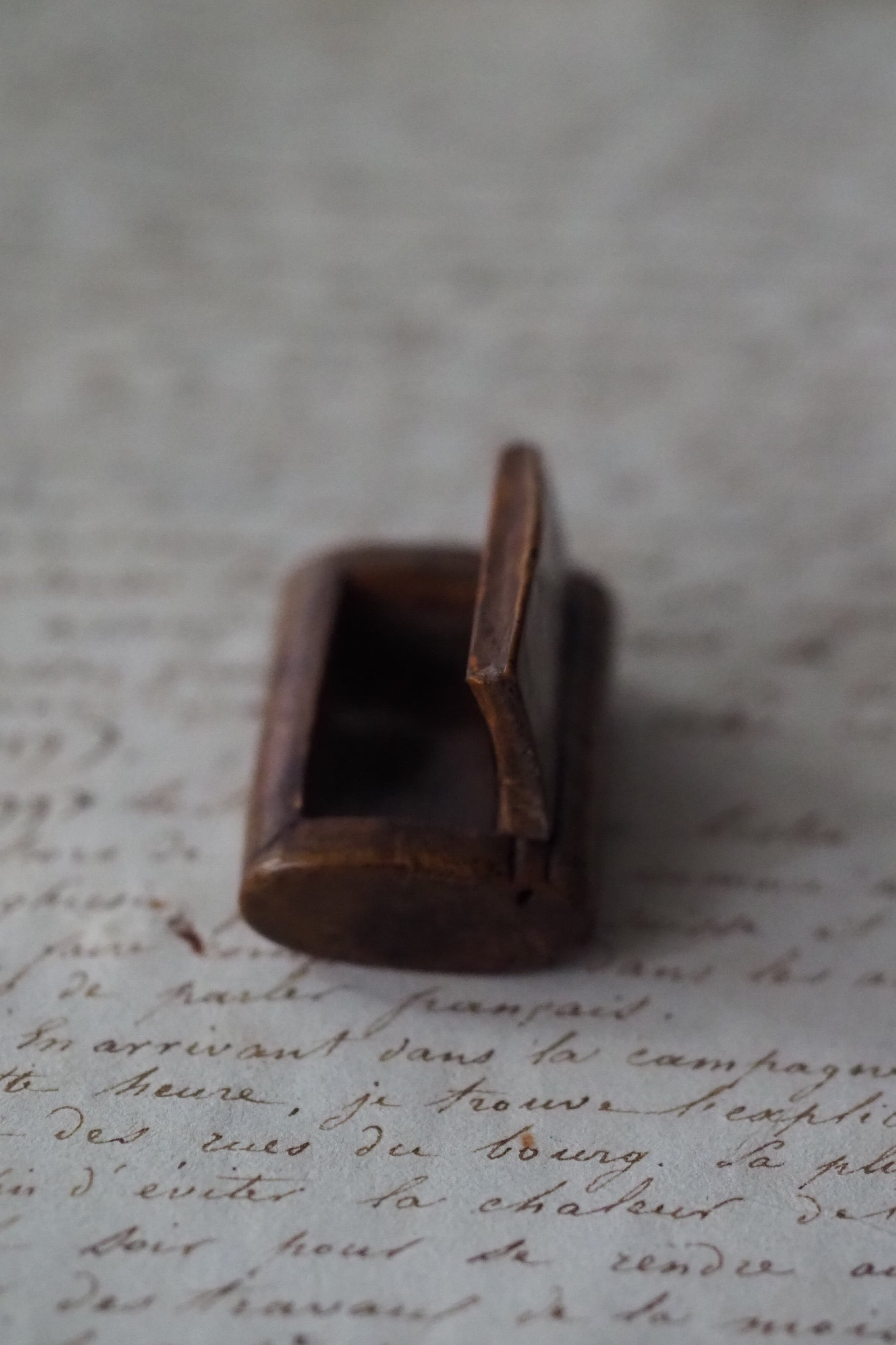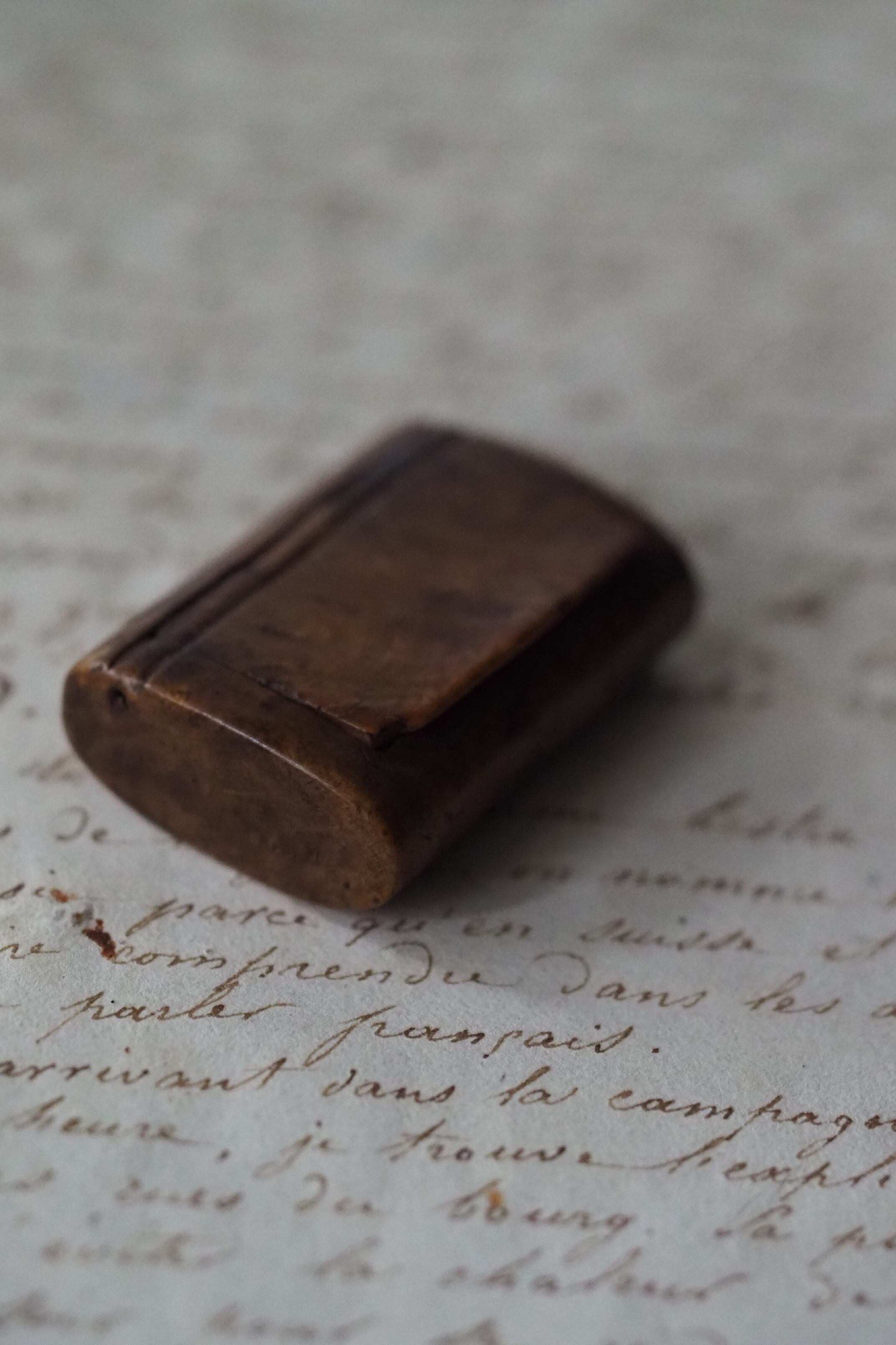 小さくプレシャスな嗅ぎタバコのケース、蓋含め着目すべきは蝶番までもがウォールナット材で出来ていること。