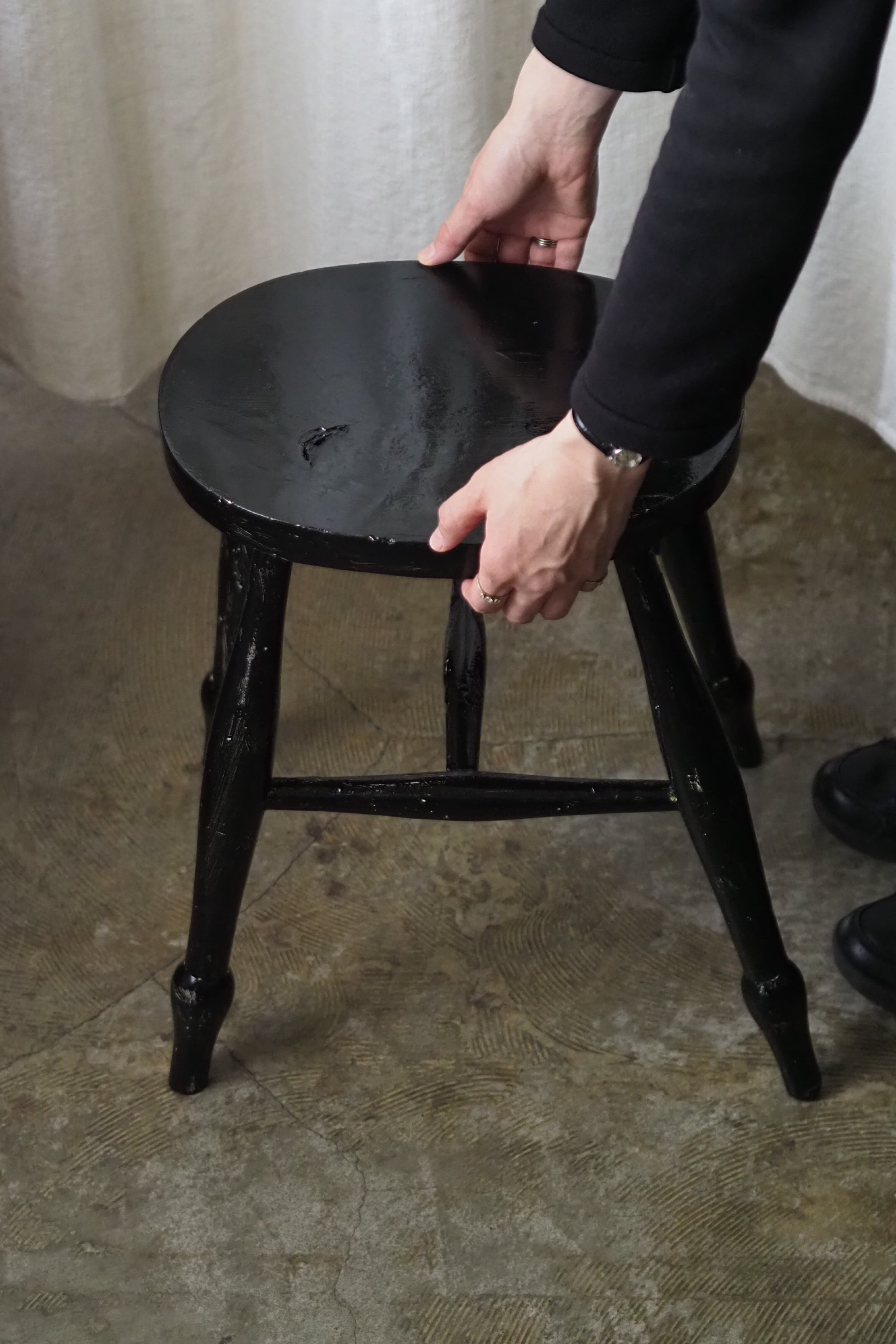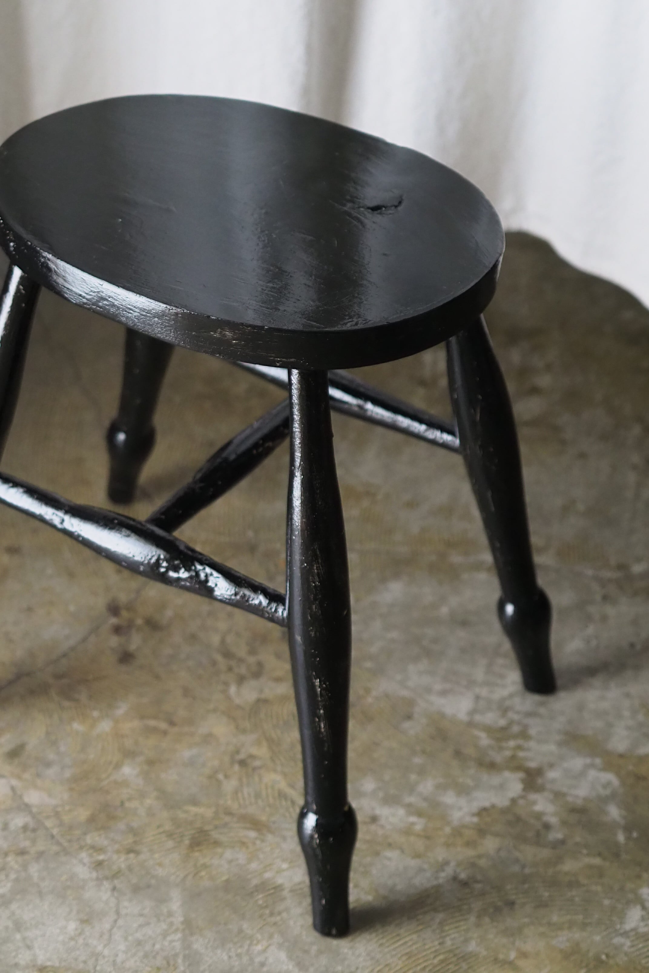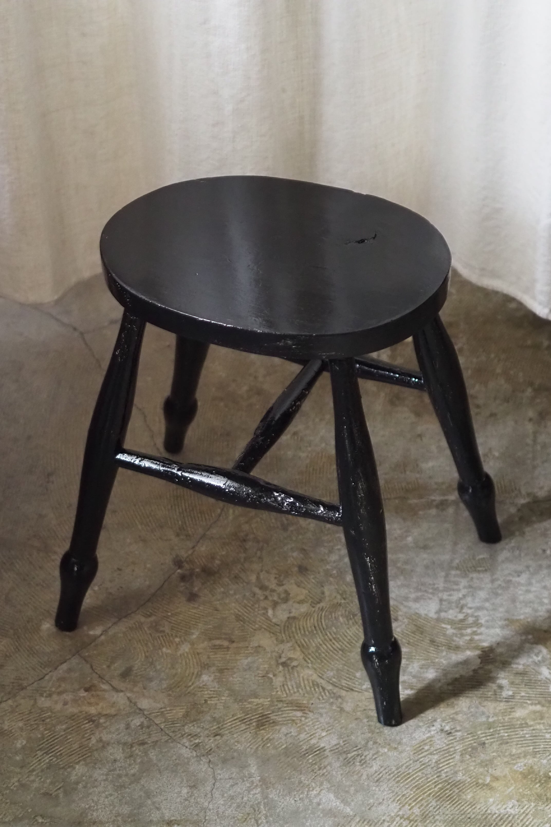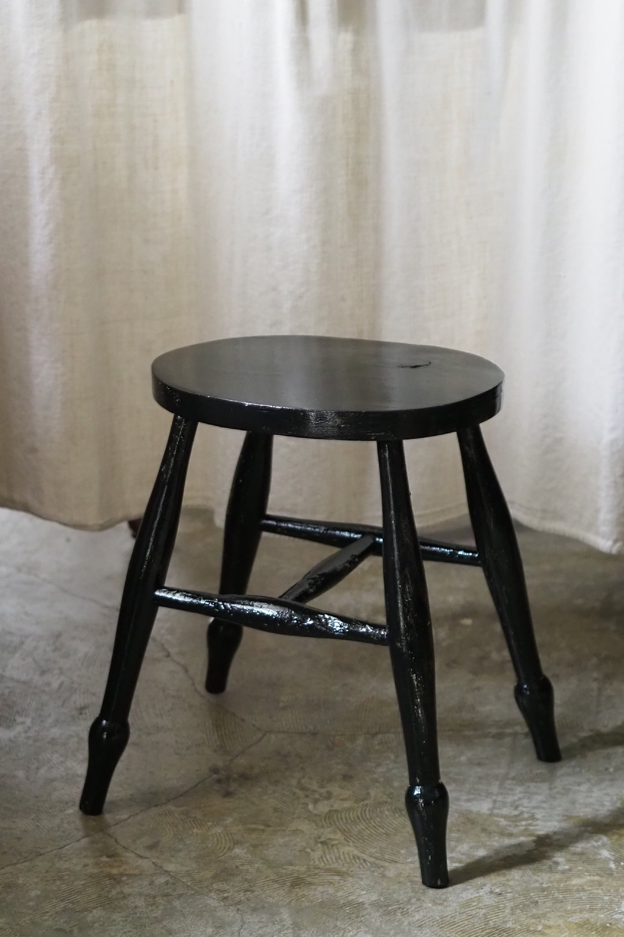 モノトーンの空間、コンクリート打ちっぱなしの壁、ウィリアム・モリスの壁紙で彩られたお部屋と様々なテイストに合うシックな黒塗装の楕円スツール。